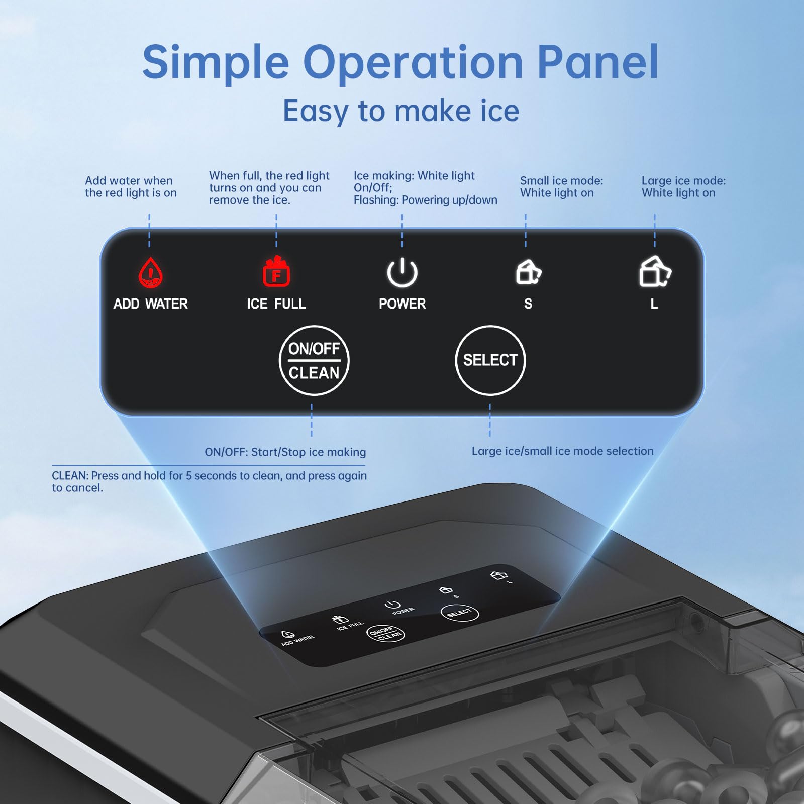 ❄️【Intelligent Self-Cleaning Ice function, ensuring WIE ice maker features a self-cleaning function, ensuring clear, odorless, and impurity-free ice cubes. Its water reservoir includes a filtration system for crystal-clear, clean ice. To activate cleaning, outlet, simplifying turn on the ice machine and hold the "CLEAN" button for over 5 seconds; the cleaning cycle lasts 20 minutes. Wastewater can be easily drained from the bottom outlet, simplifying maintenance. The ice basket of the ice maker can be easily removed for thorough cleaning.