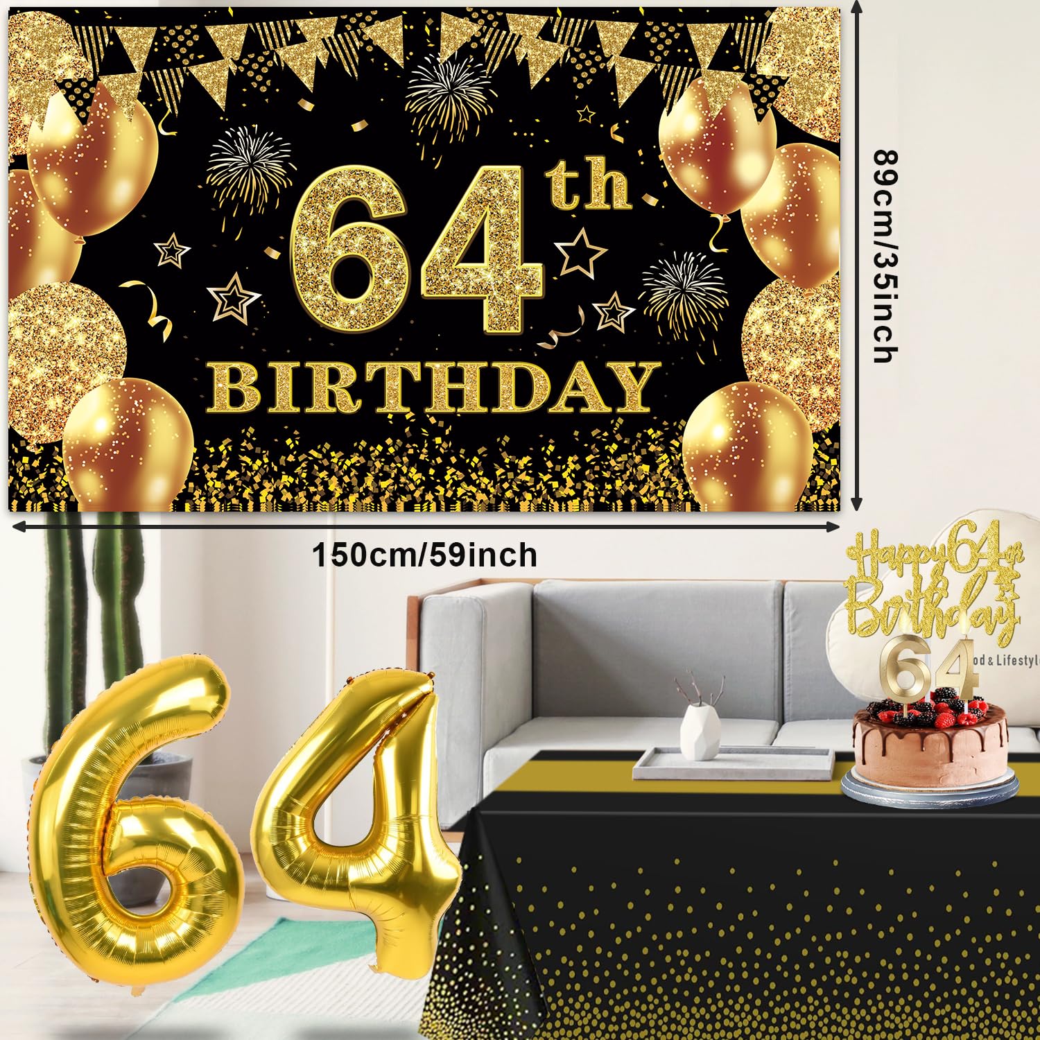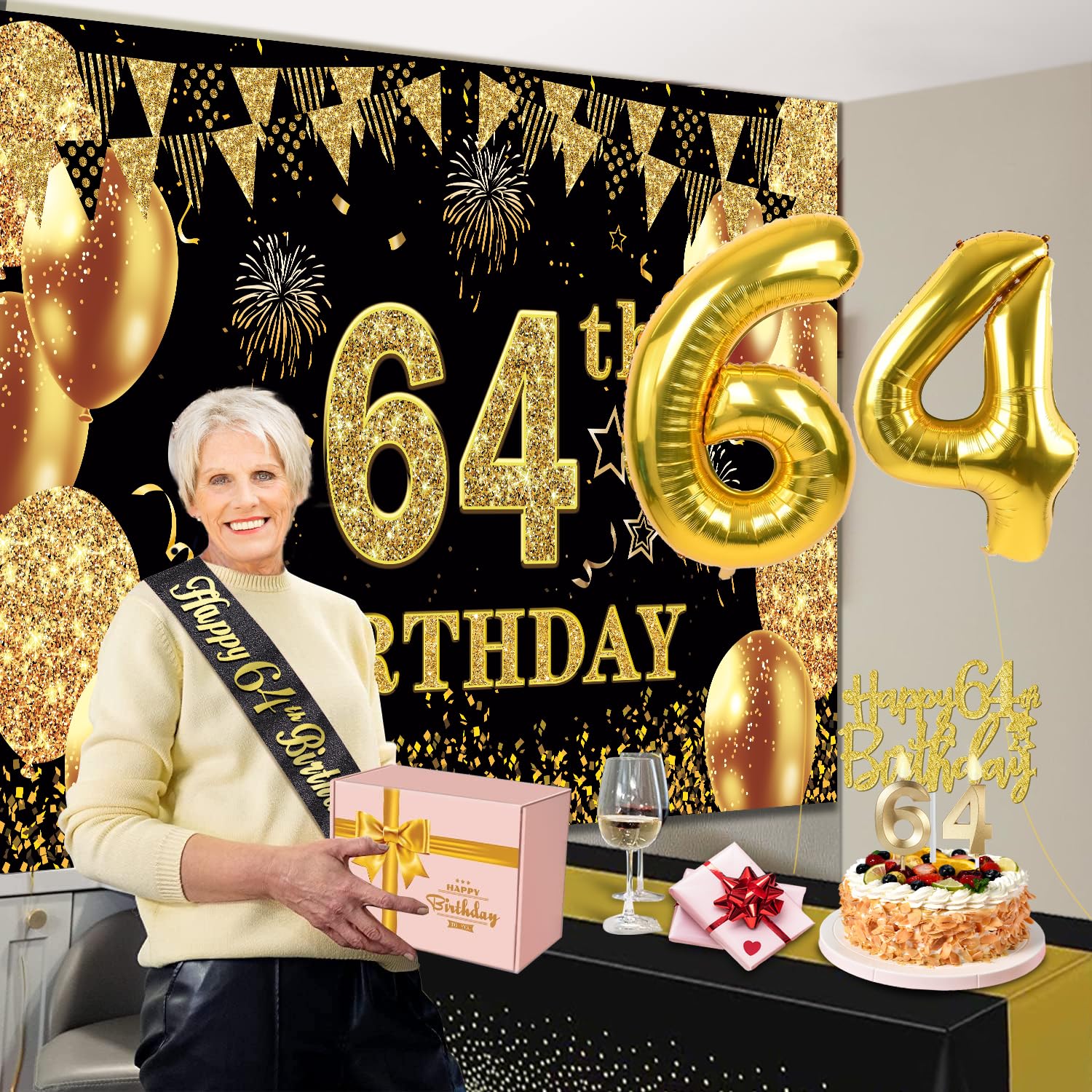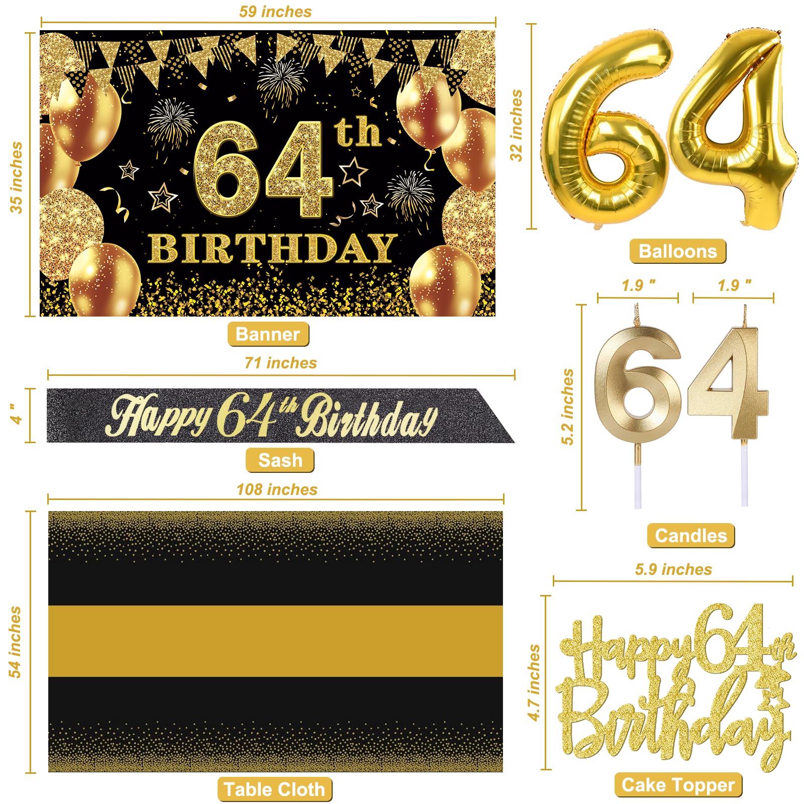 64th Birthday Decorations Kit: Packing coming with Large 64th Birthday Banner x 1pc, Big Gold 64th Birthday Balloons x 1set, Black and Gold Table Cloth x 1pc, Black Glittery with Gold Foil Words Happy 64th Birthday Sash x 1pc, Happy 64th Birthday Cake Topper x 1pc, Gold Number 64 Candles x 1set. This Value Black and Gold Party Decorations Set Meet Your Every Needs and Expects in 64th Birthday Milestone