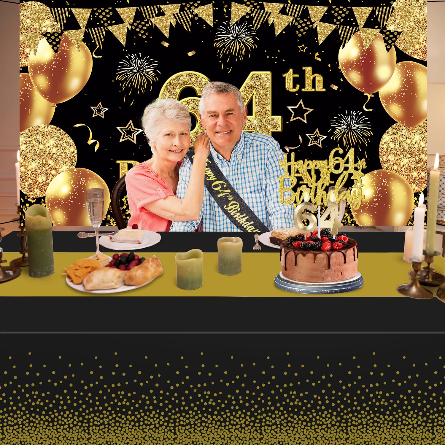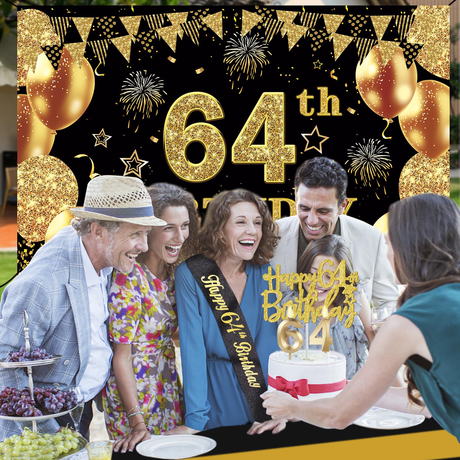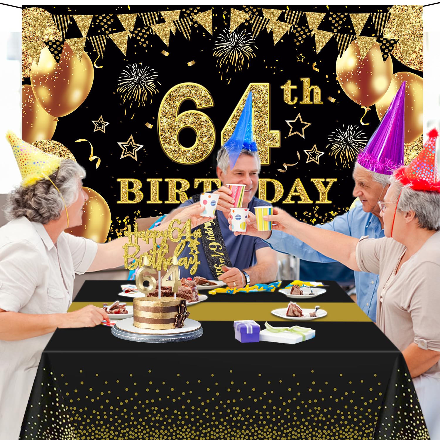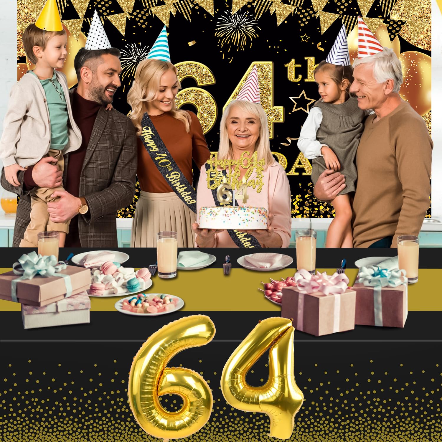 64th Birthday Decorations Kit: Packing coming with Large 64th Birthday Banner x 1pc, Big Gold 64th Birthday Balloons x 1set, Black and Gold Table Cloth x 1pc, Black Glittery with Gold Foil Words Happy 64th Birthday Sash x 1pc, Happy 64th Birthday Cake Topper x 1pc, Gold Number 64 Candles x 1set. This Value Black and Gold Party Decorations Set Meet Your Every Needs and Expects in 64th Birthday Milestone