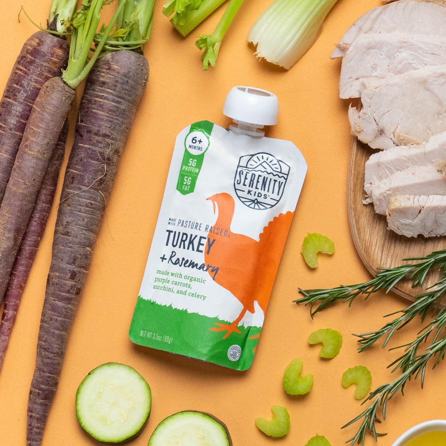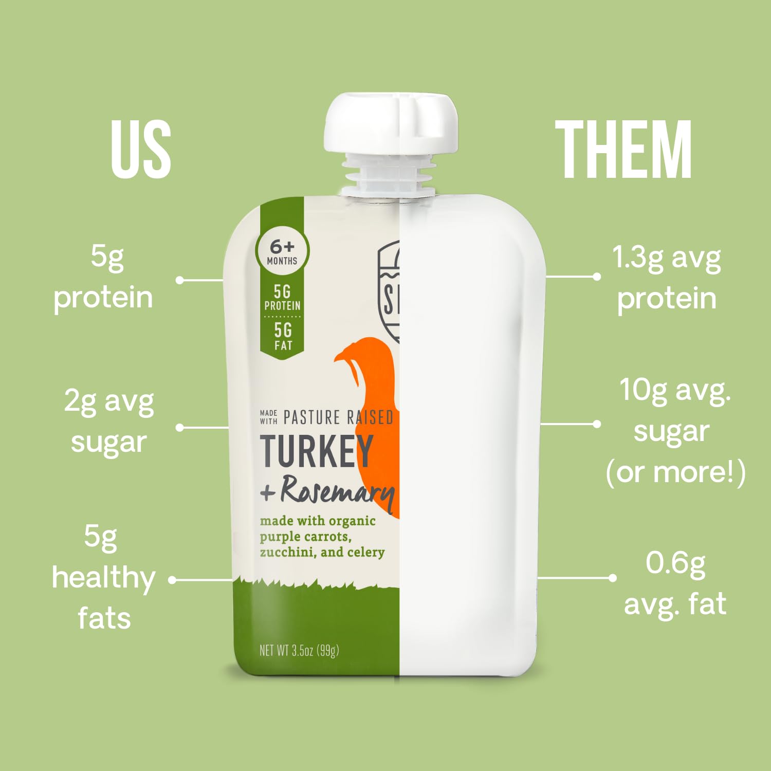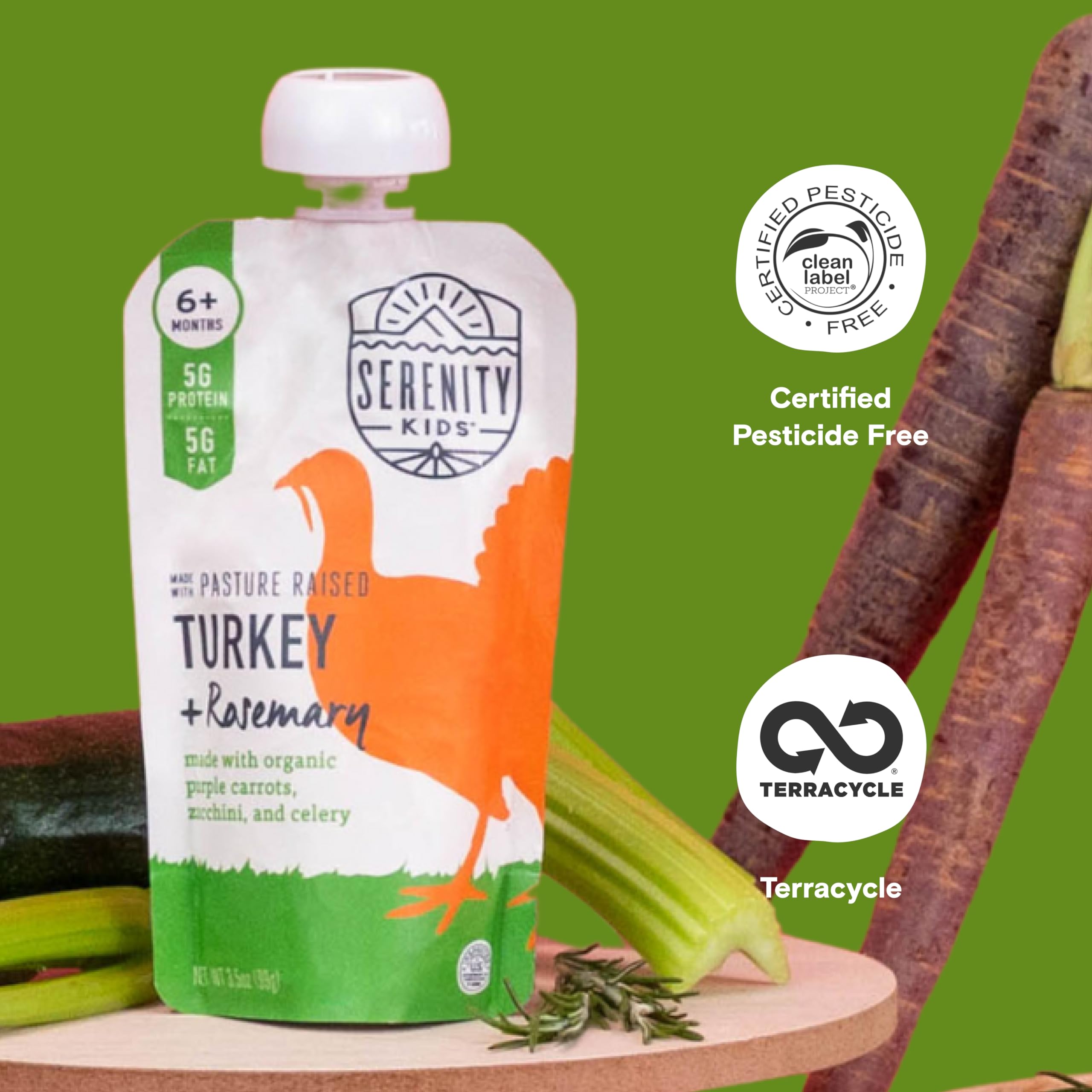 PASTURE RAISED TURKEY: Contains 6 pouches of baby food purees made from ethically sourced pasture raised turkey with organic purple carrots, celery, and zucchini plus healthy fats from organic olive oil with the perfect balance of savory organic rosemary.