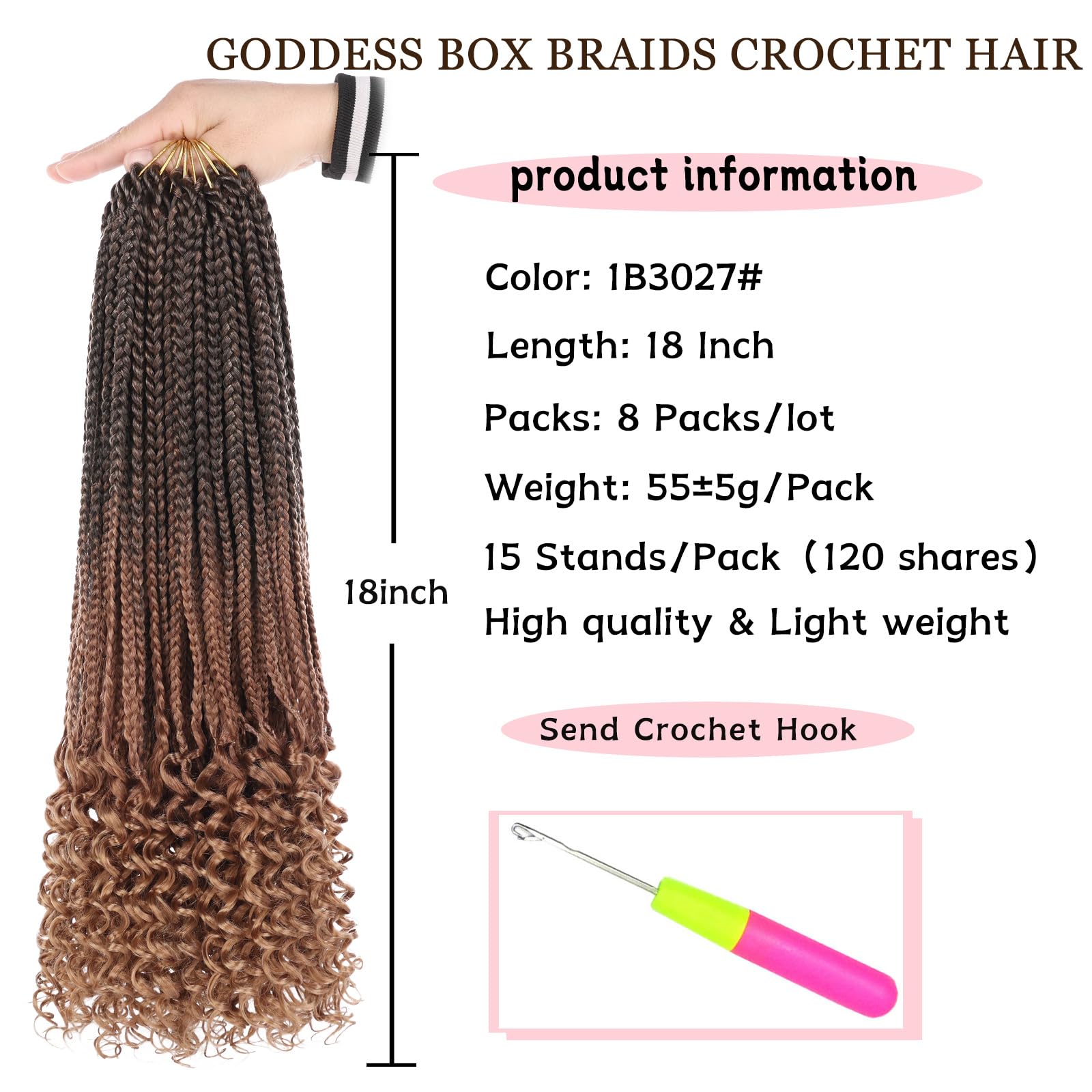 Package: 18 inches long, weight: (55±5) grams/pack, 15 strands/pack, 8 packs/batch, 120 strands in total, usually 7-8 packs can do a full head. In addition, you will also get an extra crochet hook to make installing the hair more convenient and time-saving.