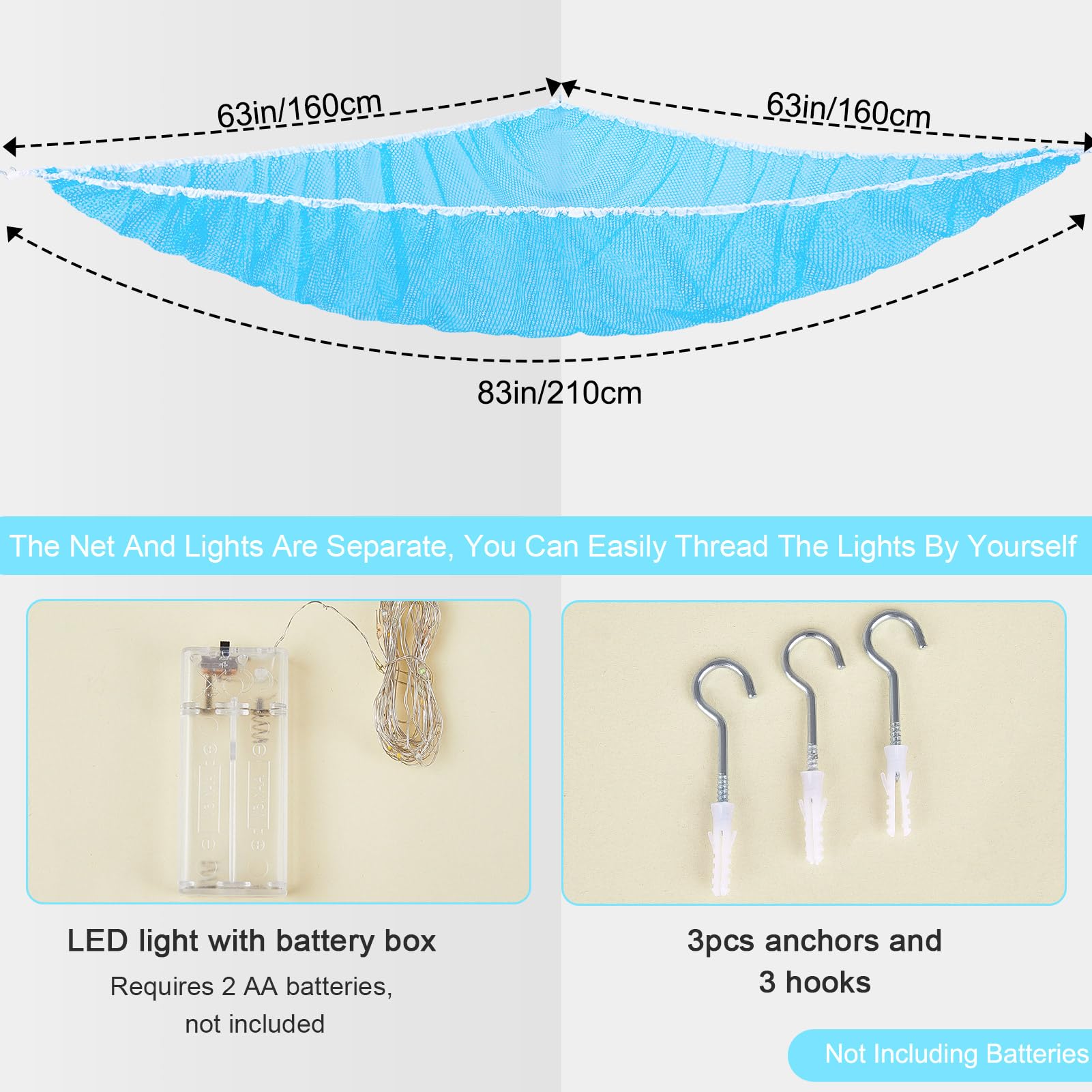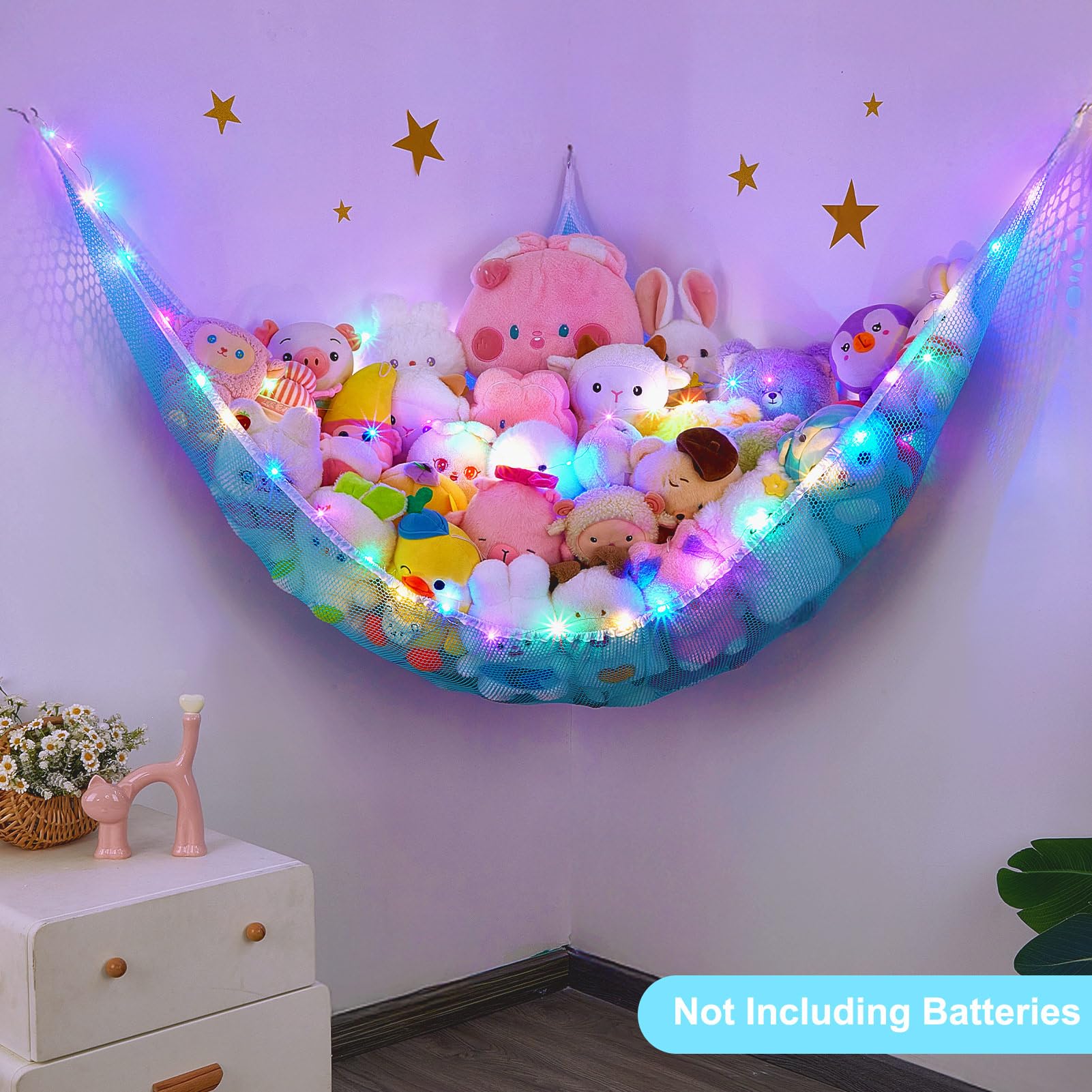 Package Included: 1 pcs stuffed animals hammock, 1 pcs 118 inches LED string light with battery box, Batteries Not Included, 3 pcs wall hooks for installation; Package are NOT including batteries