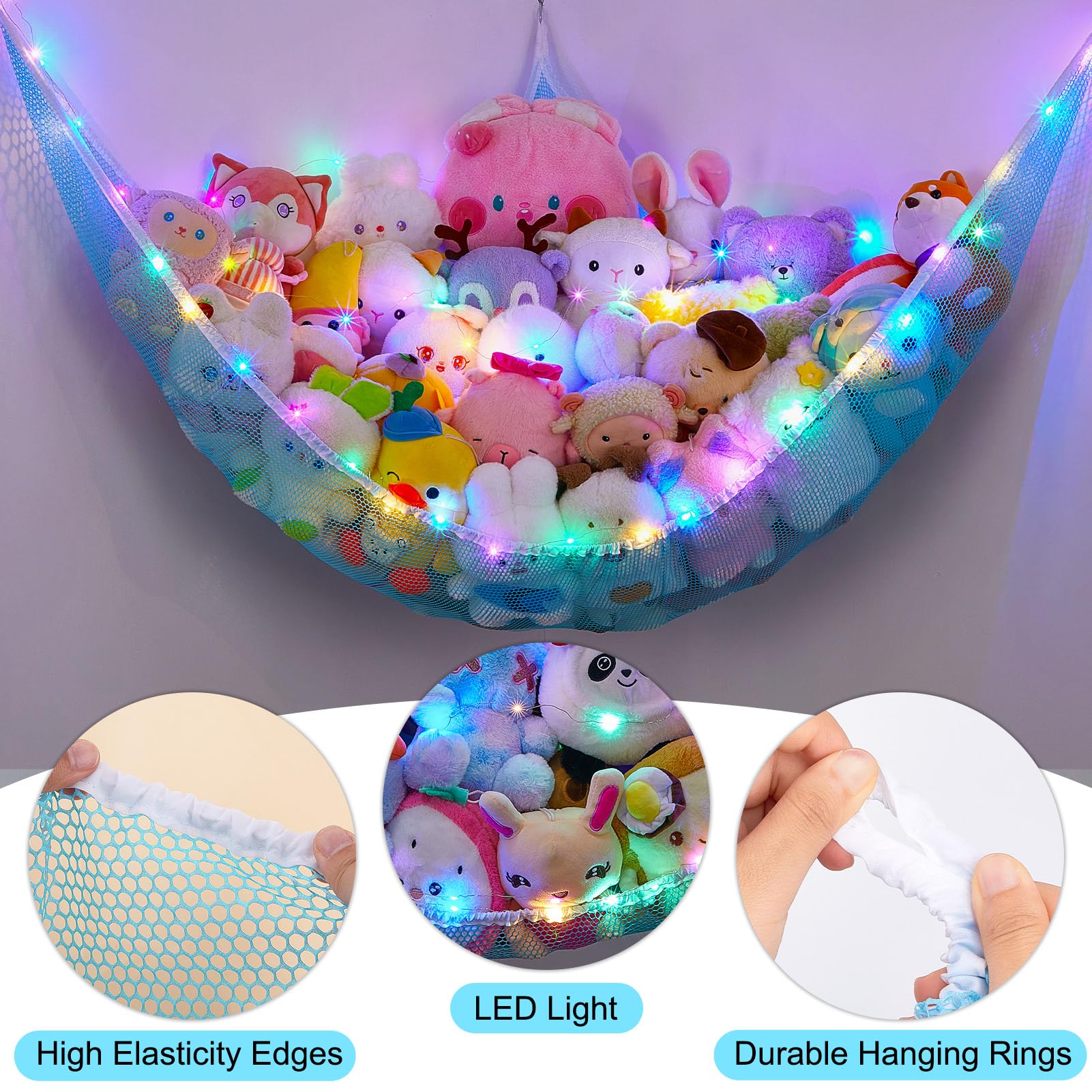 Toy Hammock: Our stuffed animals net or hammock can be a decoration for your kidsroom; Come with LED light, can add a cozy and fun atmosphere