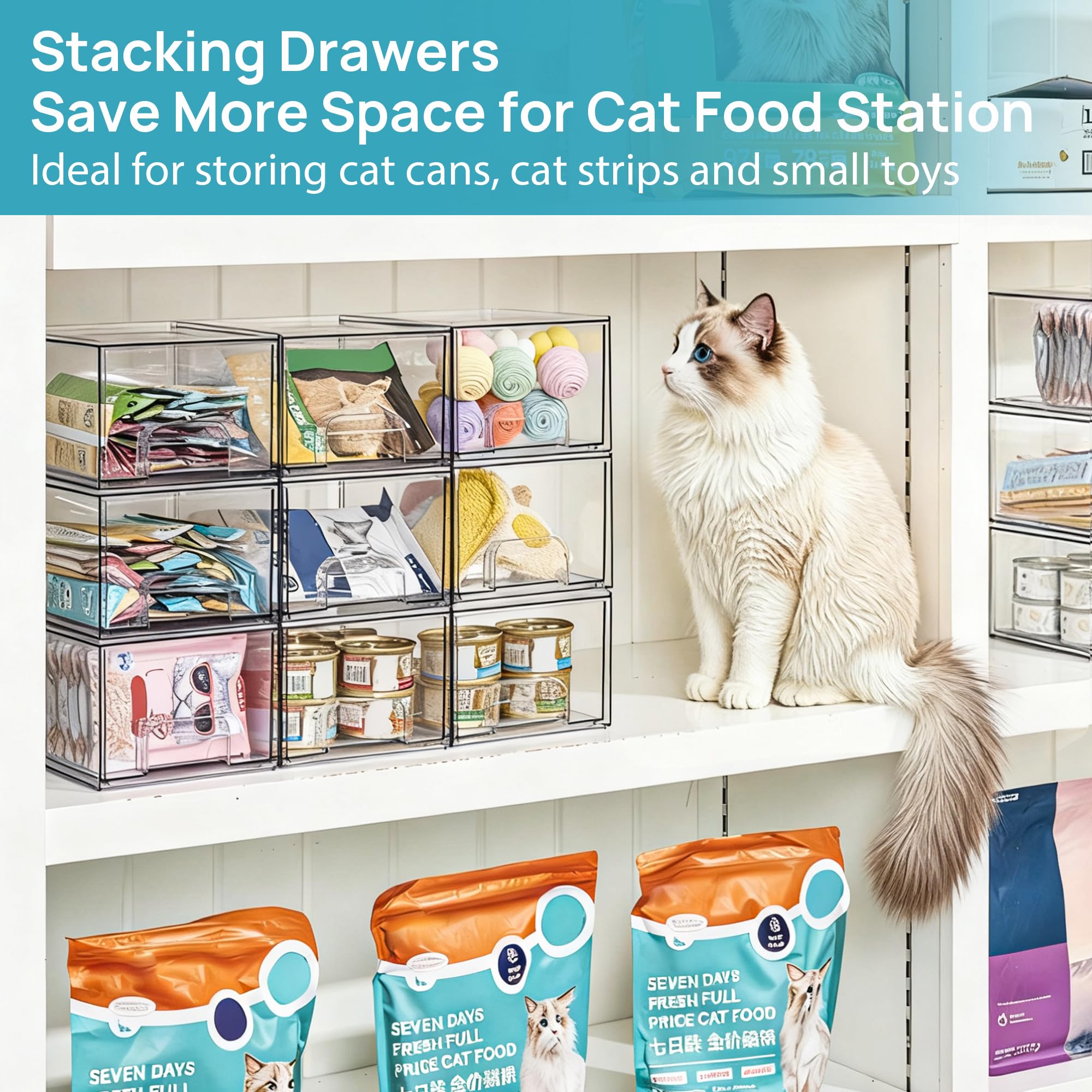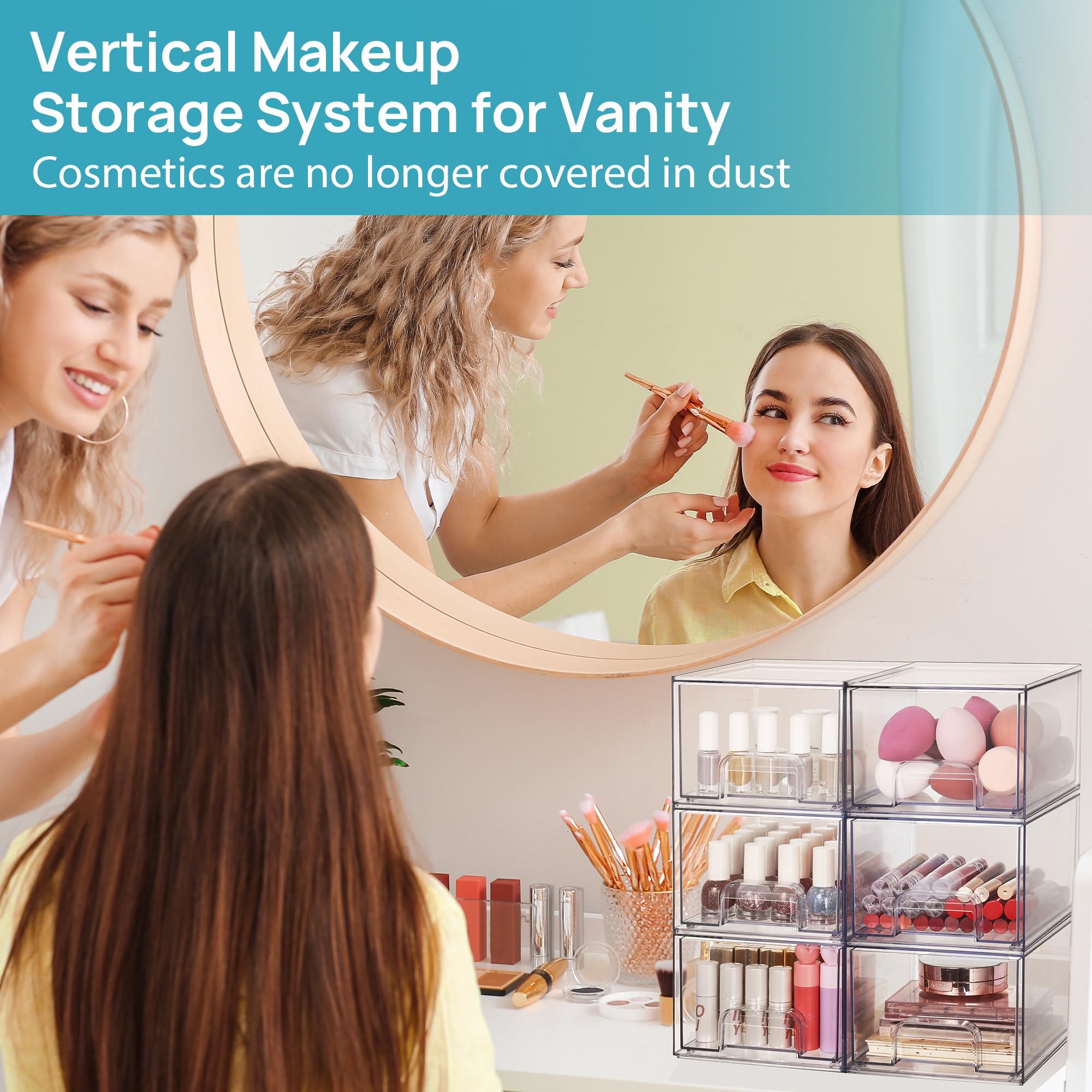 [Stackable Design] Come with 4 drawer storage organizers, the outside box measures 7.5"D x 6"W x 4.4"H,the drawer measures 7.1"D x 5.6"W x 3.7"H,it is usable size. Please measure the space of using before purchasing.The storage containers are stackable, vertical storage will save a lot of space. You can also use them side by side. Put your small objects on top of acrylic bins to make your countertop space more tidy.