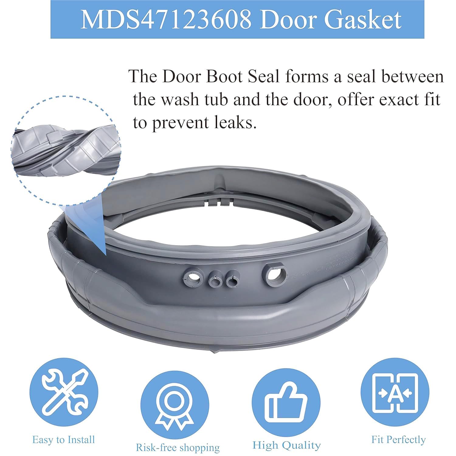 โ๏ธใFunctionใThe Door Boot Seal forms a seal between the wash tub and the door, prevent leaks. MDS47123608 Washer Door Boot Replaces AP5668418, PS6448330, 2673936. Before purchasing, please check whether the part number you need is correct, ensure it is suitable for your washing machine model. NOTE that some models require you to open the drain hole with scissors.