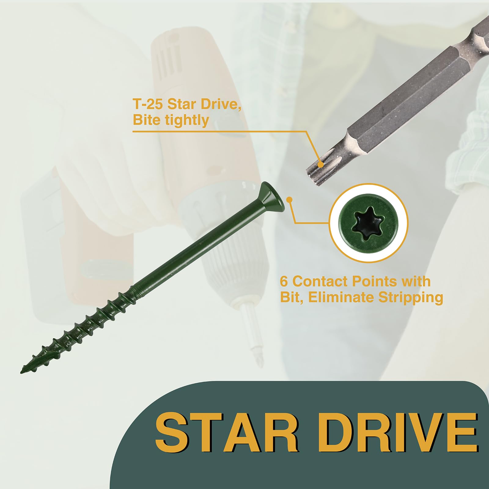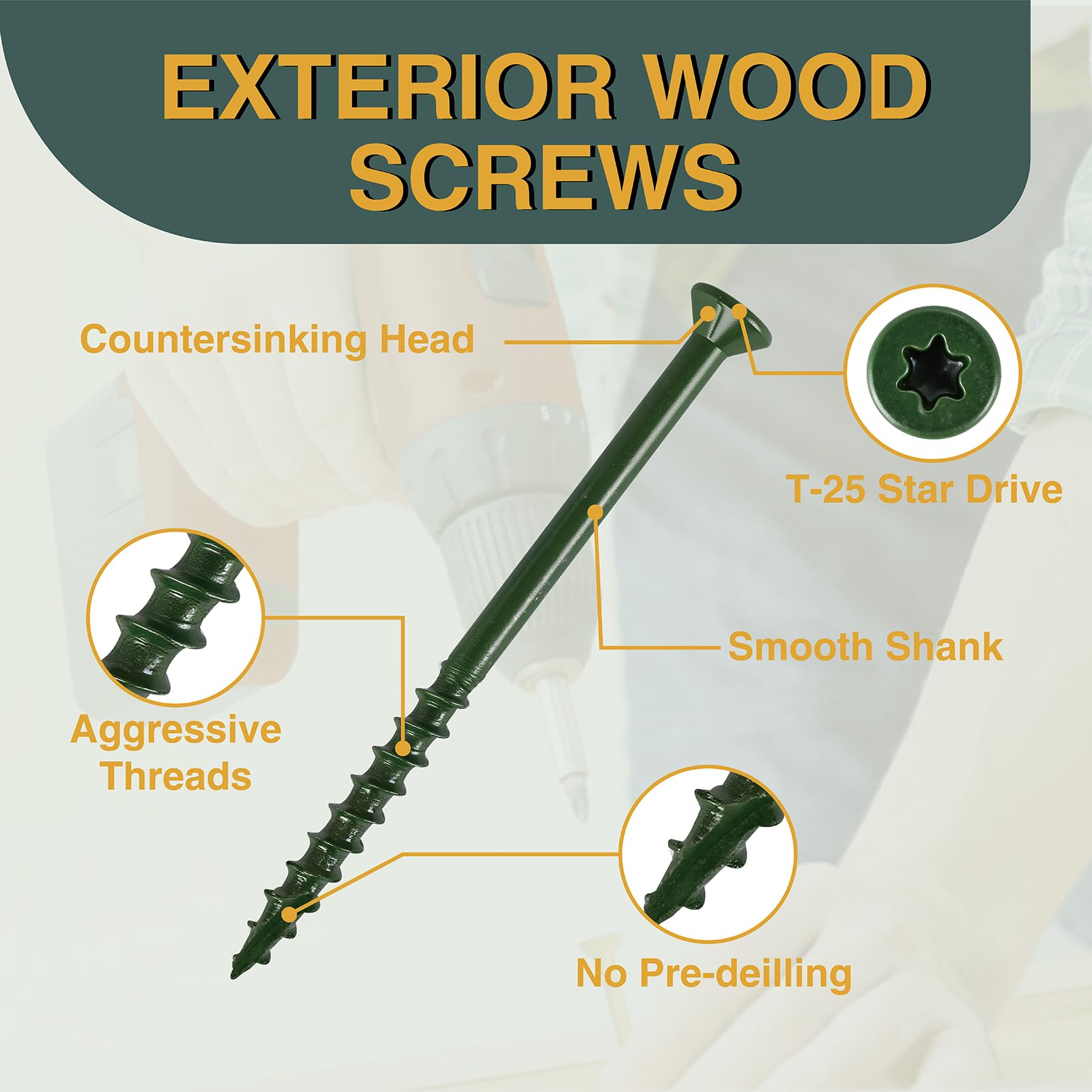 PREMIUM CONSTRUCTION: T25 Star Drive deck screws with countersinking head design and aggressive threads for superior holding power in wooden materials