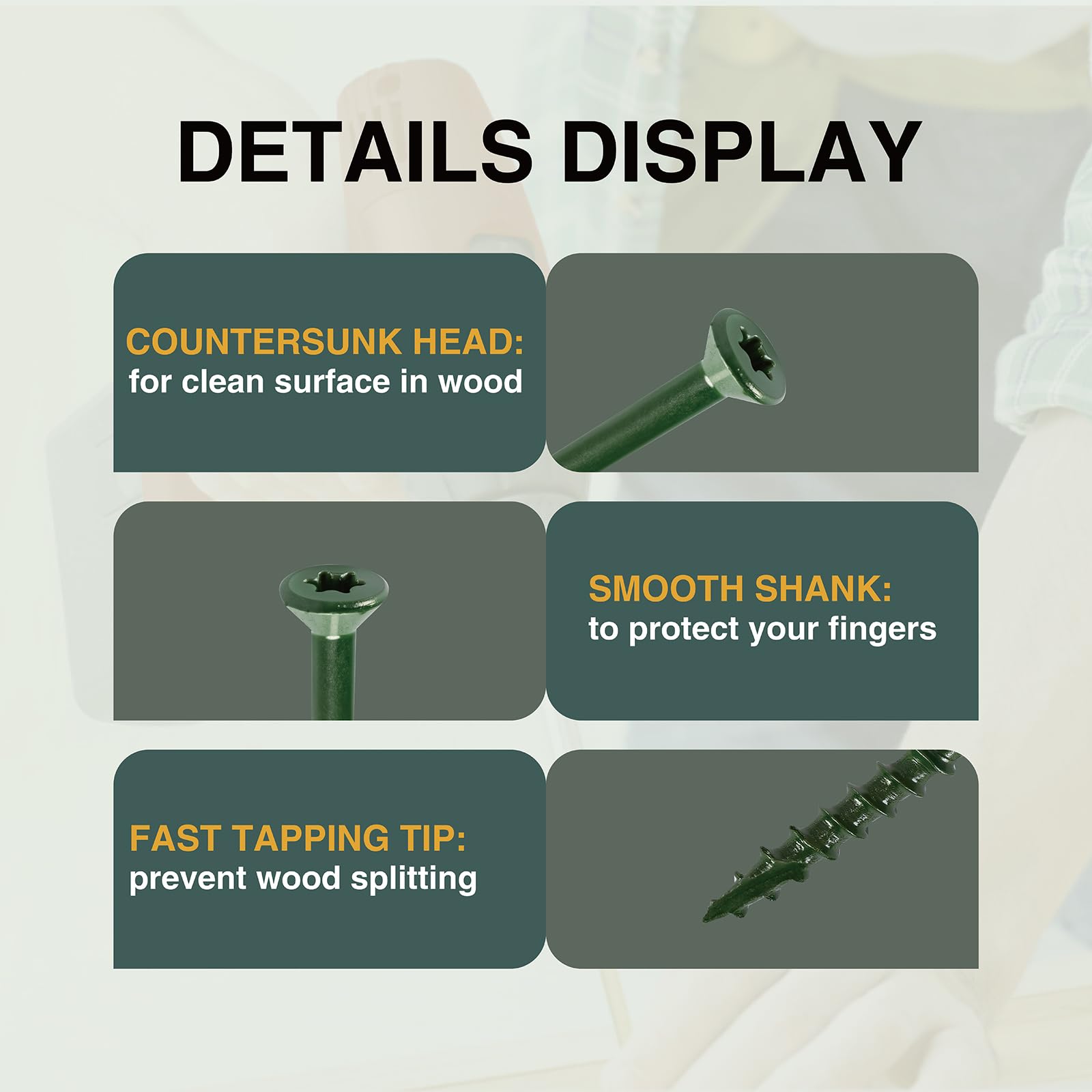 RUST RESISTANT COATING: Green epoxy-coated exterior wood screws designed for outdoor use and long-lasting performance in decking applications