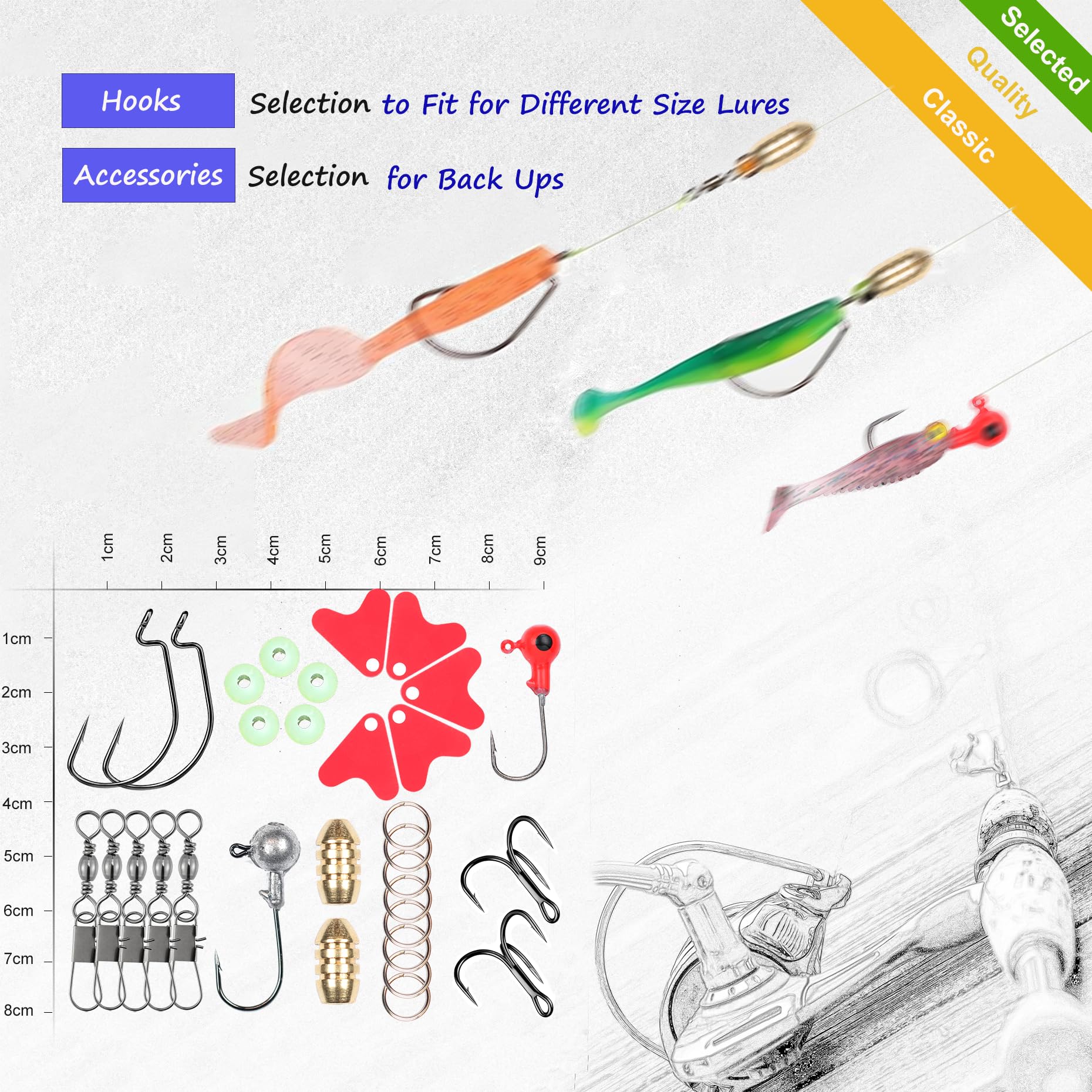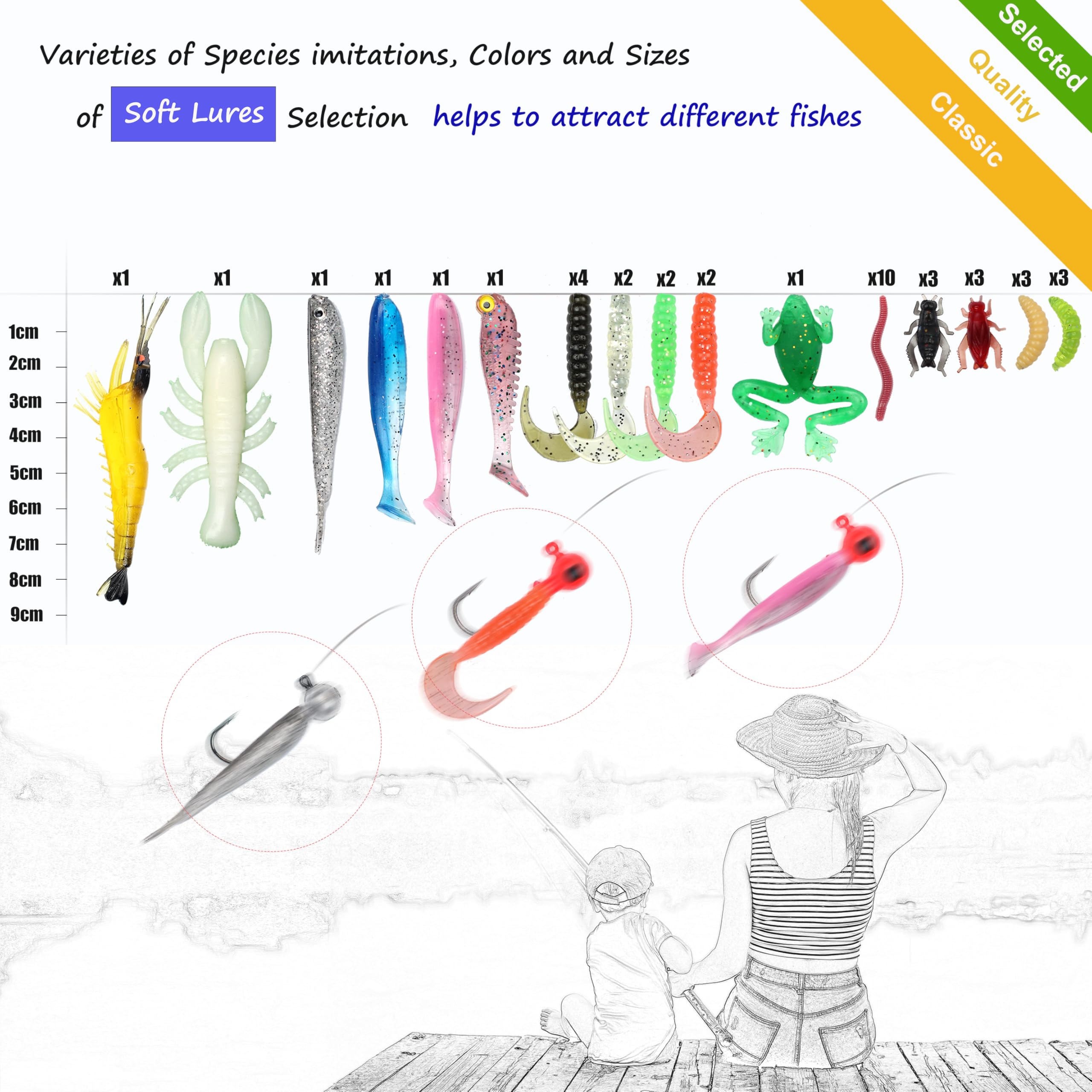 Fishing Lures Set: Fishing lures set with a tackle box contains nearly all accessories including: 1 Minnow 1 crankbaits 1 VIB1Poper Lures, 6 Spoon lures,10 curved tail grub, 22 plastic worms,2 jigs,4 fish-shaped soft bait, 1 soft frog, 2 simulation of shrimp. And the other 29 accessories also realistic and swim well. This fishing lures set contains a wide selection of fishing accessories, from common fishing baits to accessories, making it a full collection for any angler in any layer of water.