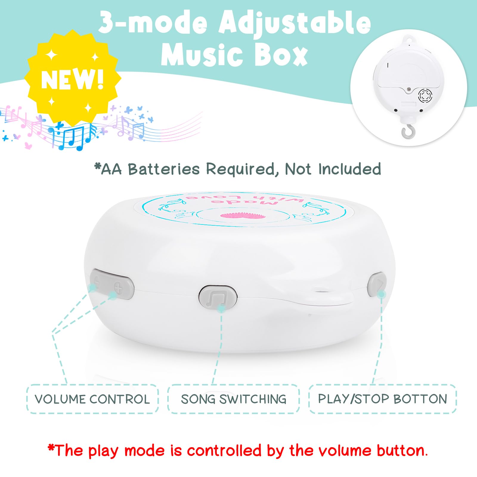 12 Soothing Lullabies: The newly upgraded 3-mode adjustable music box lets you choose between Rotation Only, Music Only, or Both. As the gentle melodies play, the toys slowly spin, creating a calming atmosphere that makes bedtime a smoother and more enjoyable experience for both baby and parents