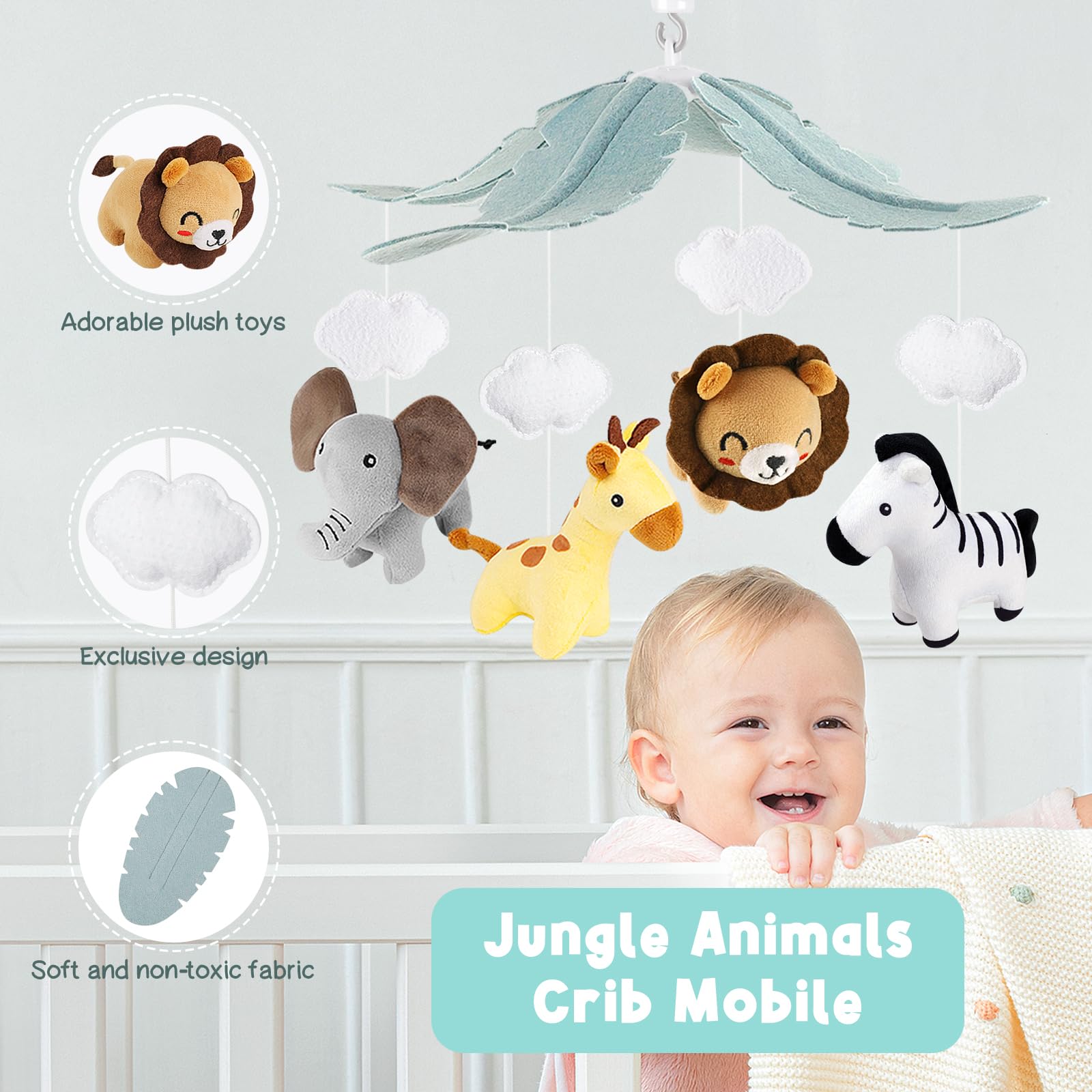 Charming Design: Featuring four adorable stuffed jungle animals—a zebra, giraffe, elephant, and lion—it brings a fun safari theme to the room. Not only does it provide entertainment, but it also enhances the overall aesthetic of the nursery decor