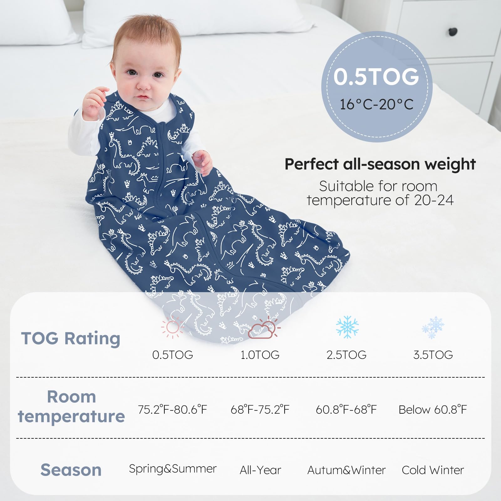 Lightweight 0.5 TOG - The baby sleep sack 0.5 Tog is suitable for moderate temperatures from 75 to 80°F as an ideal option for spring, summer, autumn or taking a nap in air-conditioned rooms, keeping your baby snug and warm.