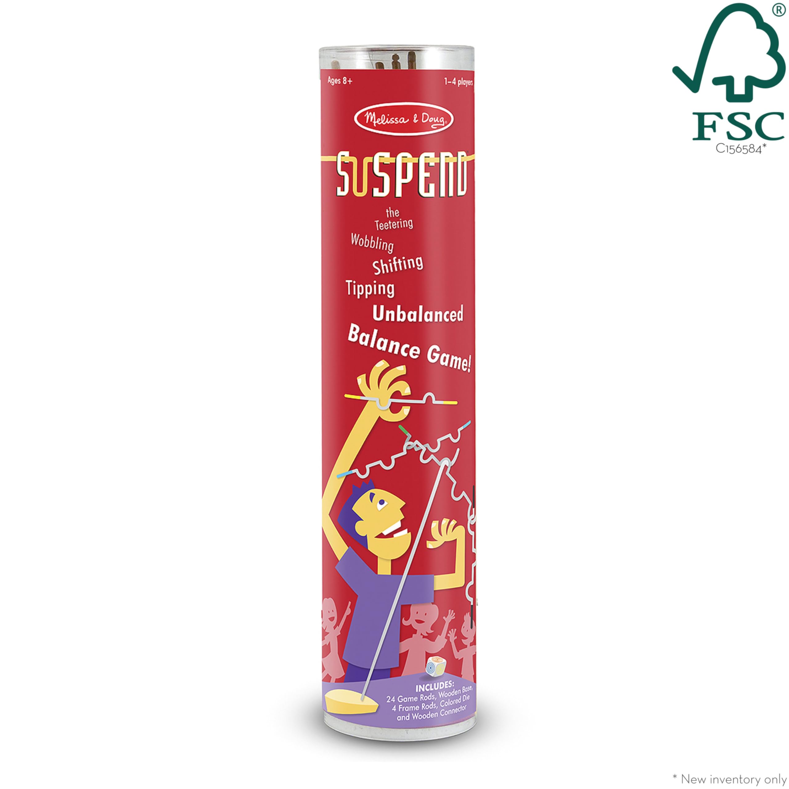 Product Description It’s a family game of tricky hangs and steady hands. Originally from Melissa & Doug, Suspend is the hanging, shifting, unbalanced balance game. Hang your game piece and change the game – just don’t knock it down. Choose a rod and, using only one hand, place it on an unoccupied notch in a balancing rod. Carefully stack wire rods to create a floating structure. The difficulty notches up with each bar added. Keep up the balancing act and successfully hang all of your rods to win Product made with FSC-certified materials that support responsible forestry; applies to new inventory only (FSC C156584). This tricky game for 1-4 players ages 6 and up is a fun test of steady nerves and steady hands. Spin Master brings the fun of children’s entertainment home with a range of kids toys and games, including baby toys, toys for girls, board games, stuffed animals, fidget toys, RC cars, action figures, dolls and more. Get creative with arts and crafts and building toys and take the action to the table with jigsaw puzzles for adults or card games. From gifts for men to baby registry gifts and toddler toys, make gifting a breeze with our diverse catalog of toys for kids. From the Manufacturer Try this hanging balance game and you’ll be hooked. Suspend comes with 24 notched, rubber-tipped wire pieces to hang from a tabletop stand. Sound easy? Try adding another piece. Each time a bar is added, the balance shifts, the difficulty changes and the incredible midair sculpture transforms. Can you add all your game pieces without making it fall? This tricky game is a test of steady nerves and steady hands and an exciting family activity for 1-4 players.
