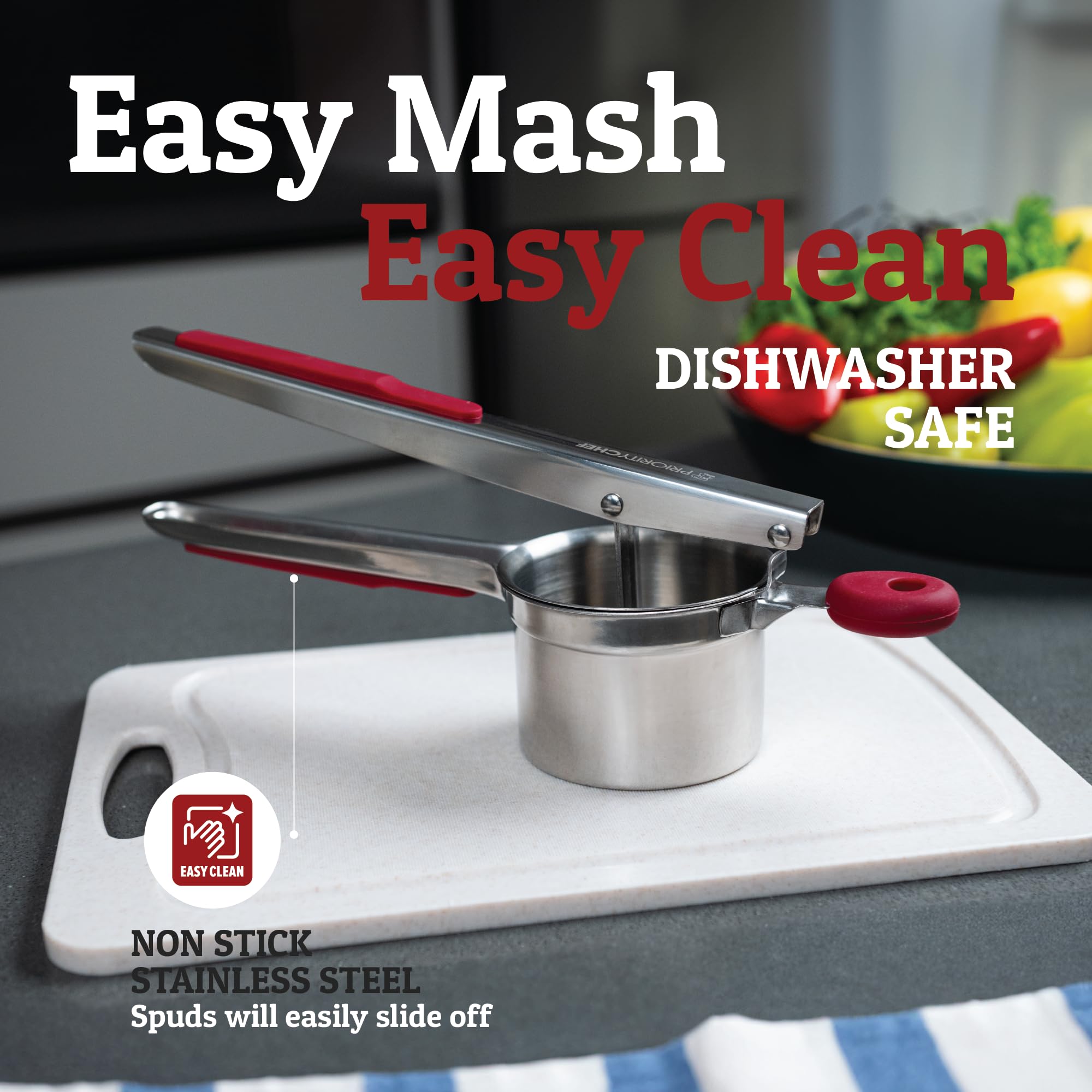 Easy Clean Up - Top Rack Dishwasher Safe - Crafted from 100% rust-proof, high-quality materials, the PriorityChef potato ricer is resistant to stains, corrosion, and deformation. And with its non-stick material, the spuds will simply slide off. Any food residue is easily rinsed off with running water. It's easy to use and easy to clean