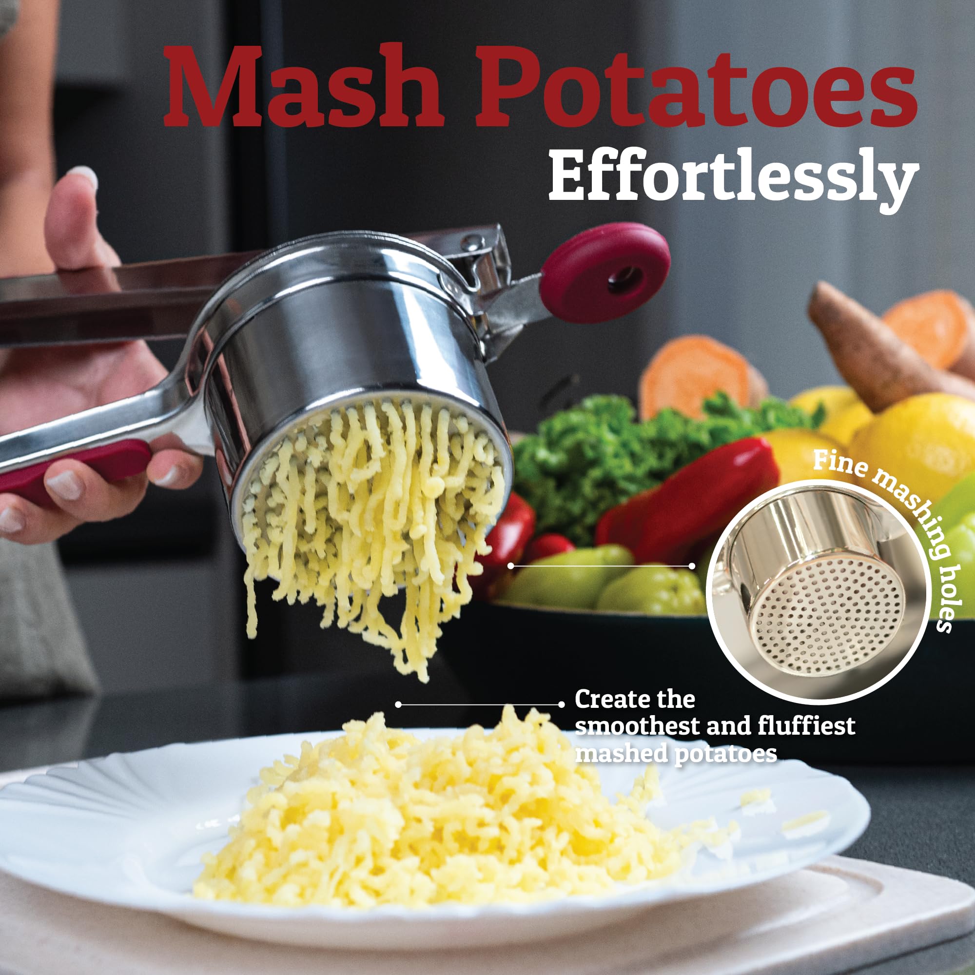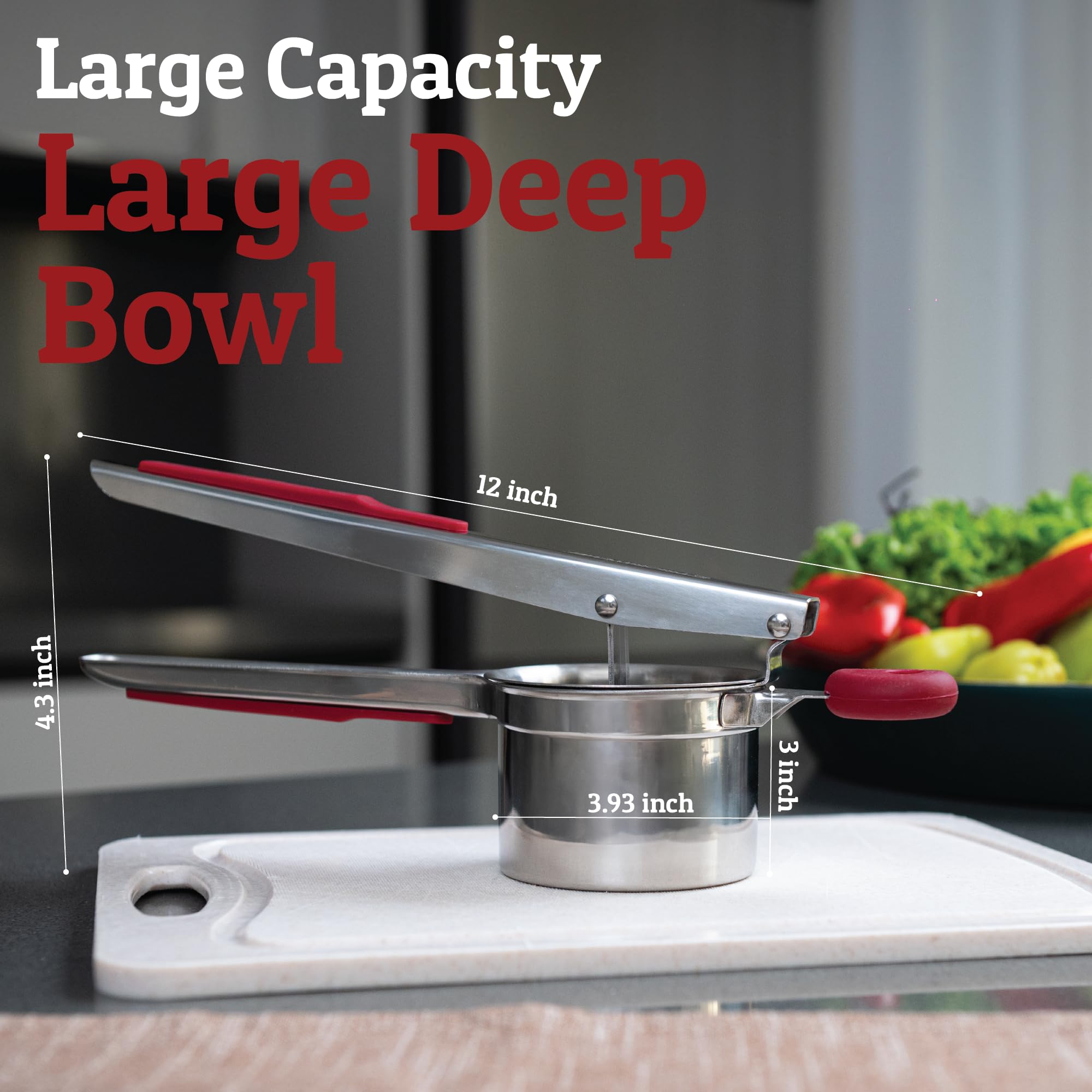 Large Deep Basket For Quicker Ricing - Holding a max capacity of 15oz, 3mm ricer holes, you will have your mashed potatoes prepared quicker yet finer output than using other kitchen gadgets. You can also use it for other veggies like soft carrots, turnips, yams and even use a baby food masher