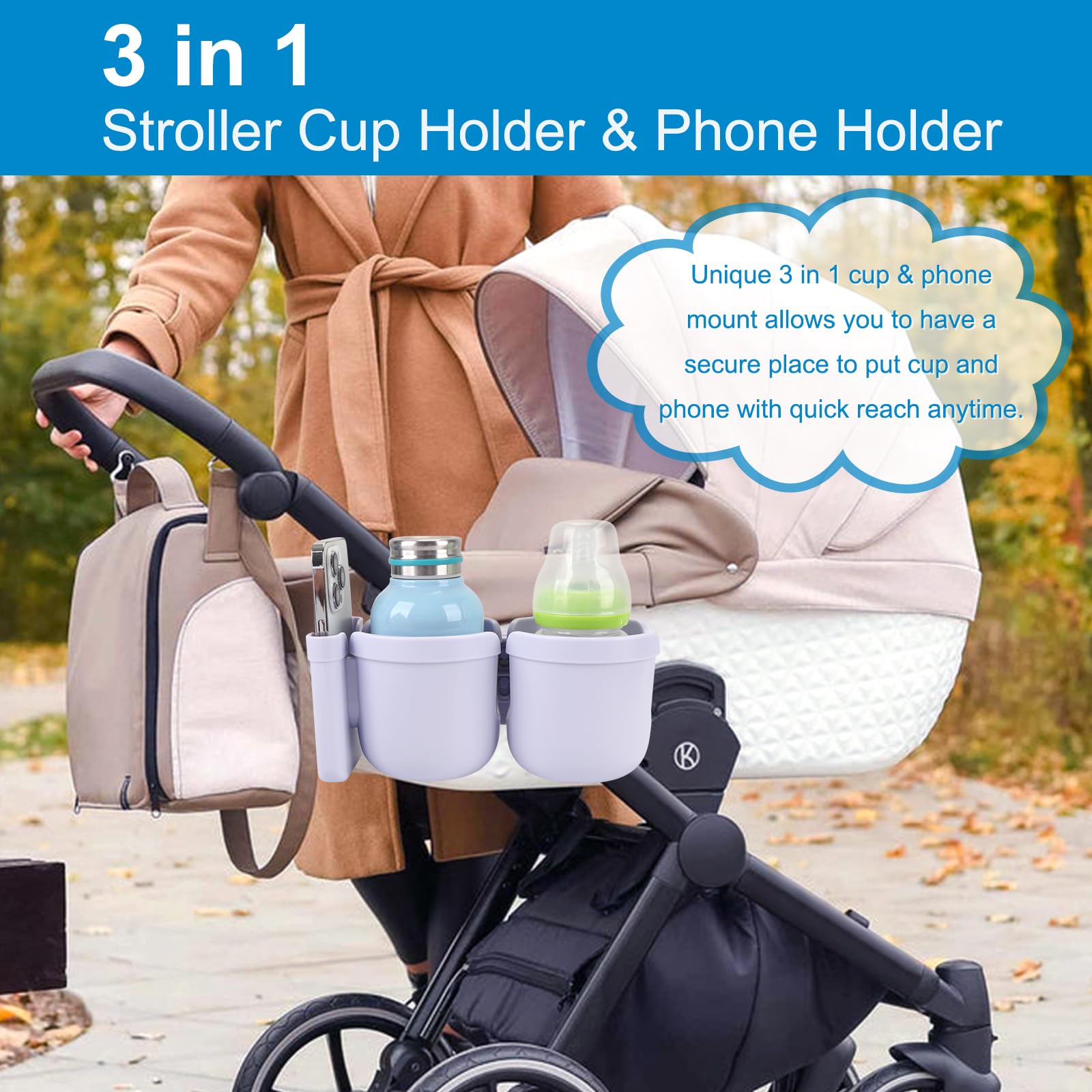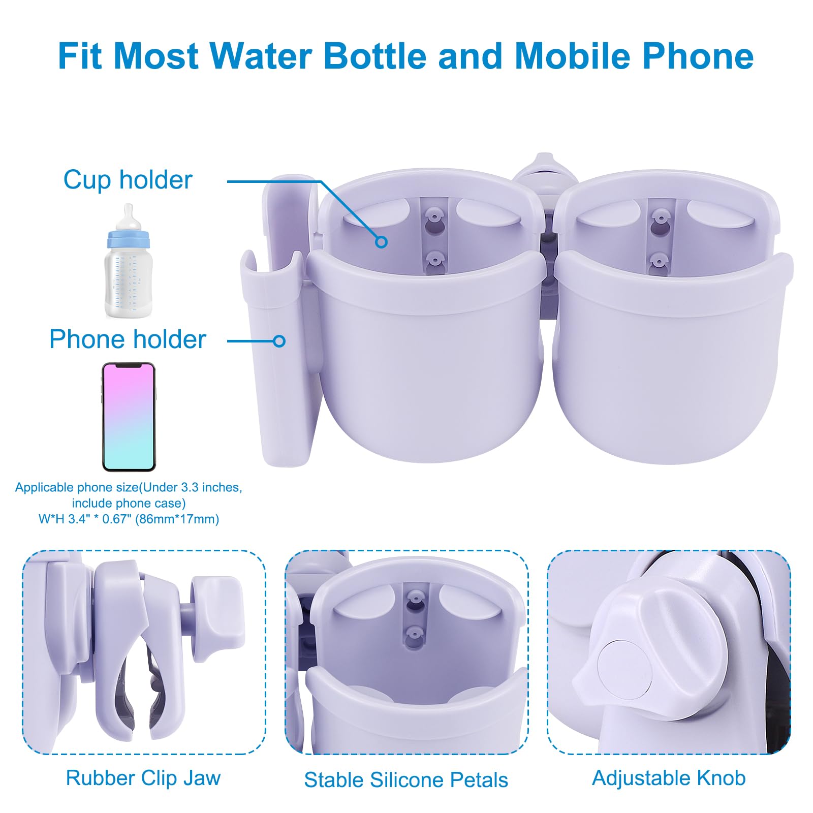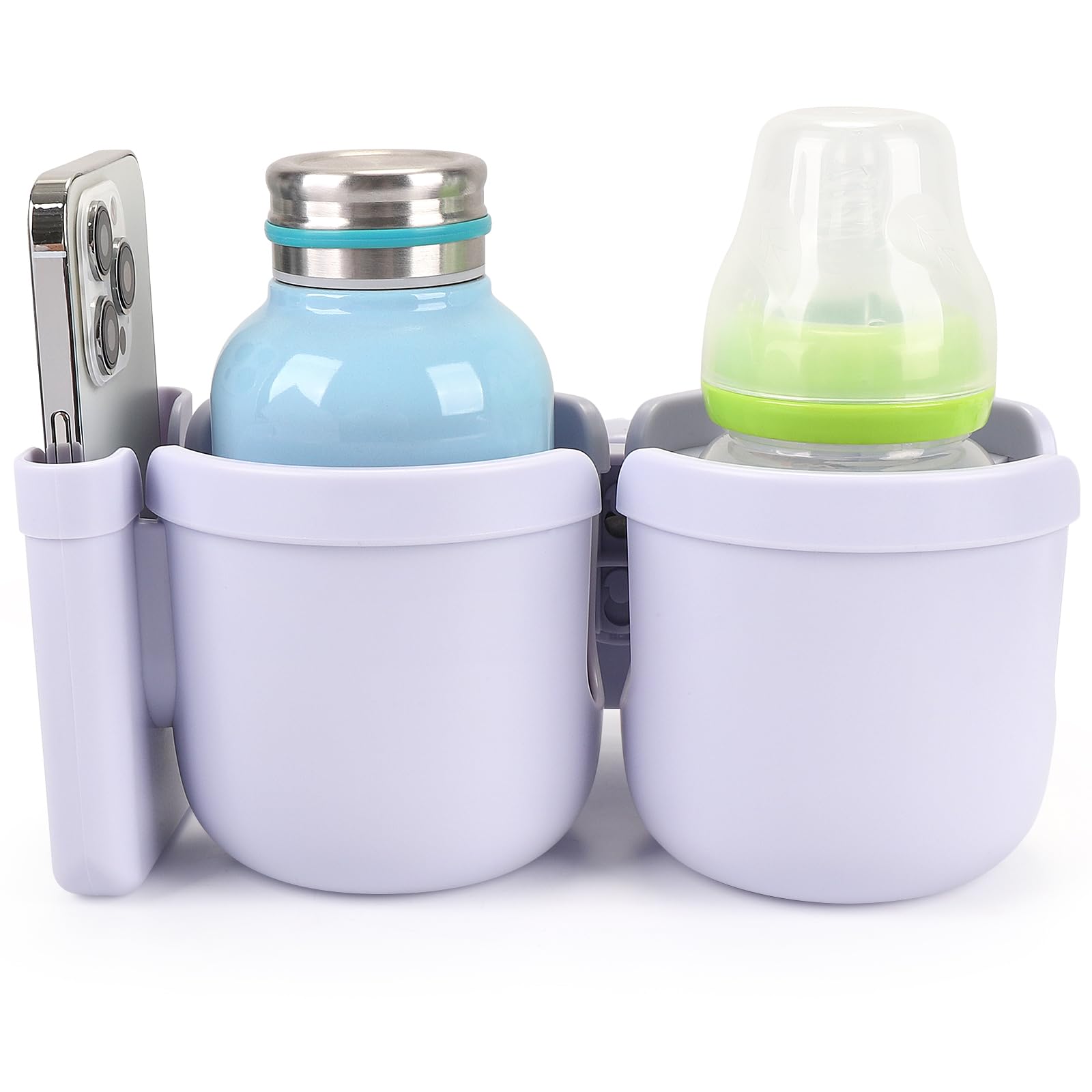 This 2-in-1 stroller cup holder with a phone holder, it can load drinks bottles and cell phone at the same time. You can see new messages, incoming calls in the first time when you are pushing a stroller or running on a treadmill. It is applicable to most cell phones on the market.