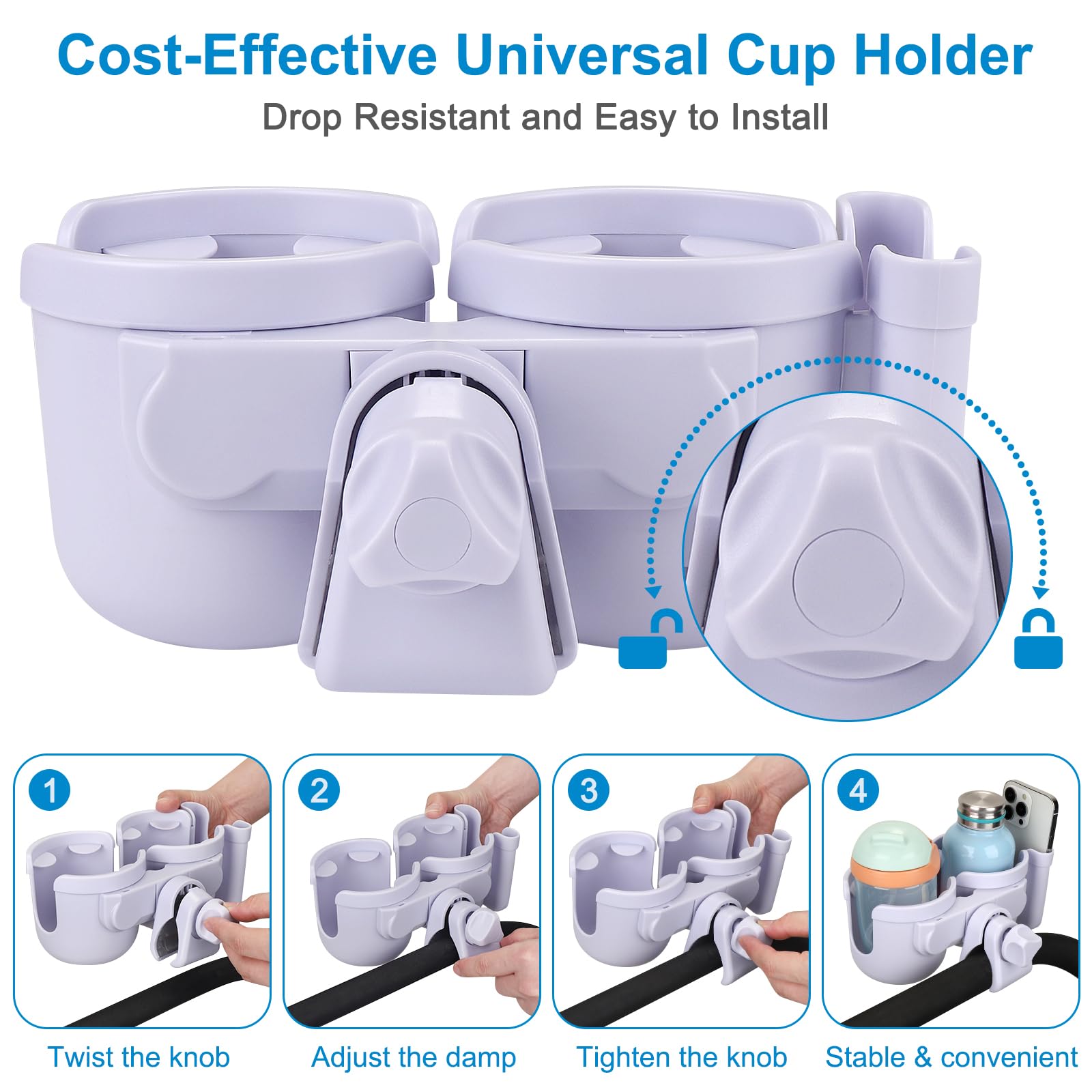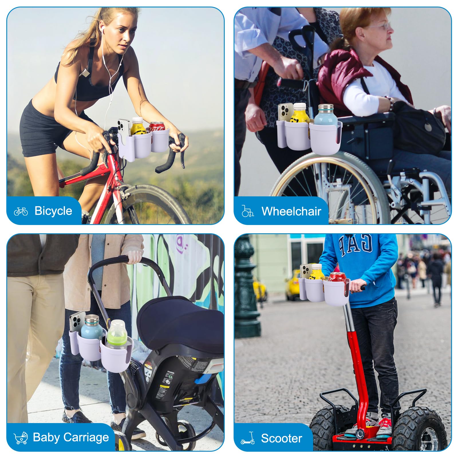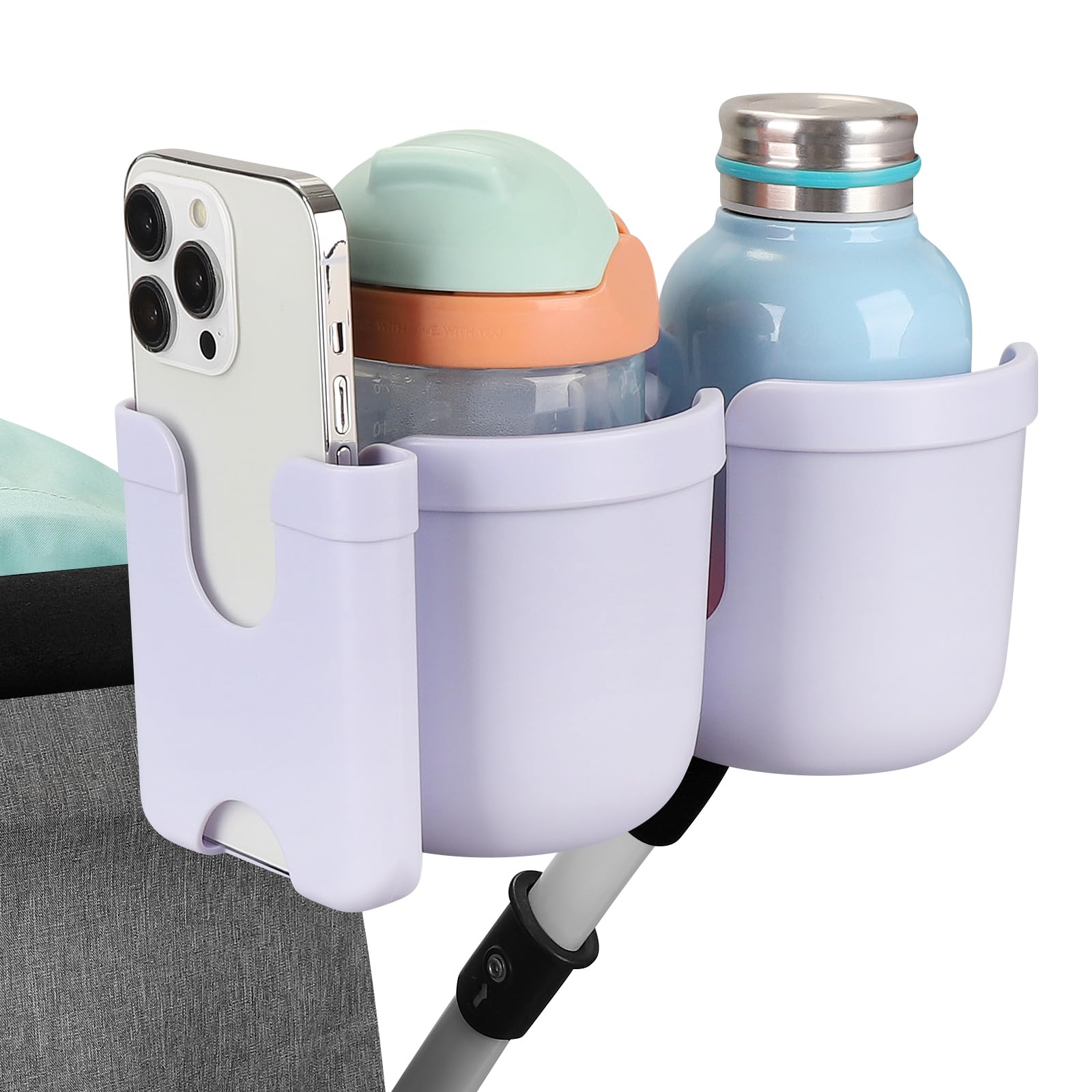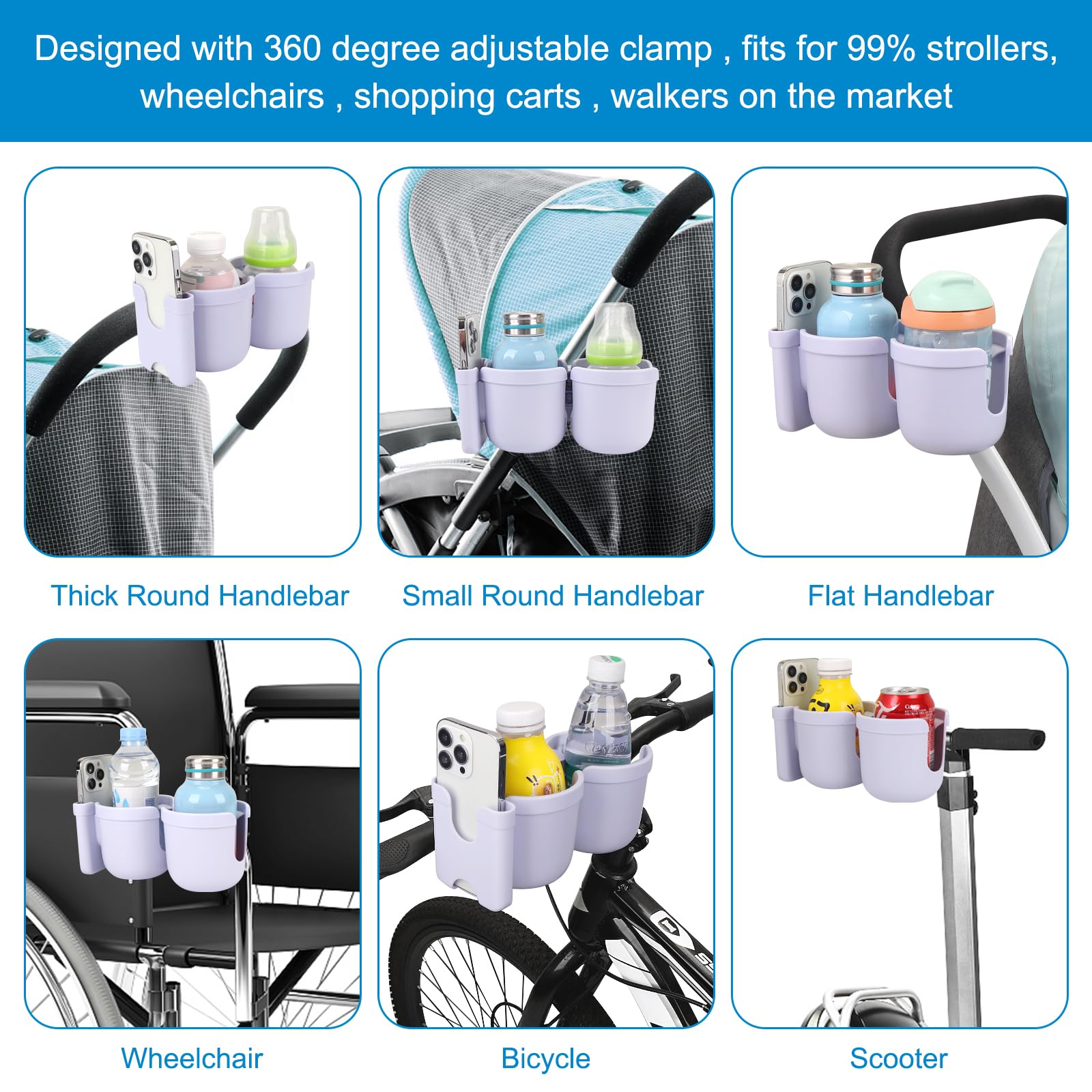 Wide Compatibility: This universal cup holder with phone holder compatible with most baby strollers, walker, wheelchair, rollator, bike, scooter, boat handle bar, shopping cart, kayak, ATV, lawnmowers, motorcycle, treadmill, golf push cart and so on.