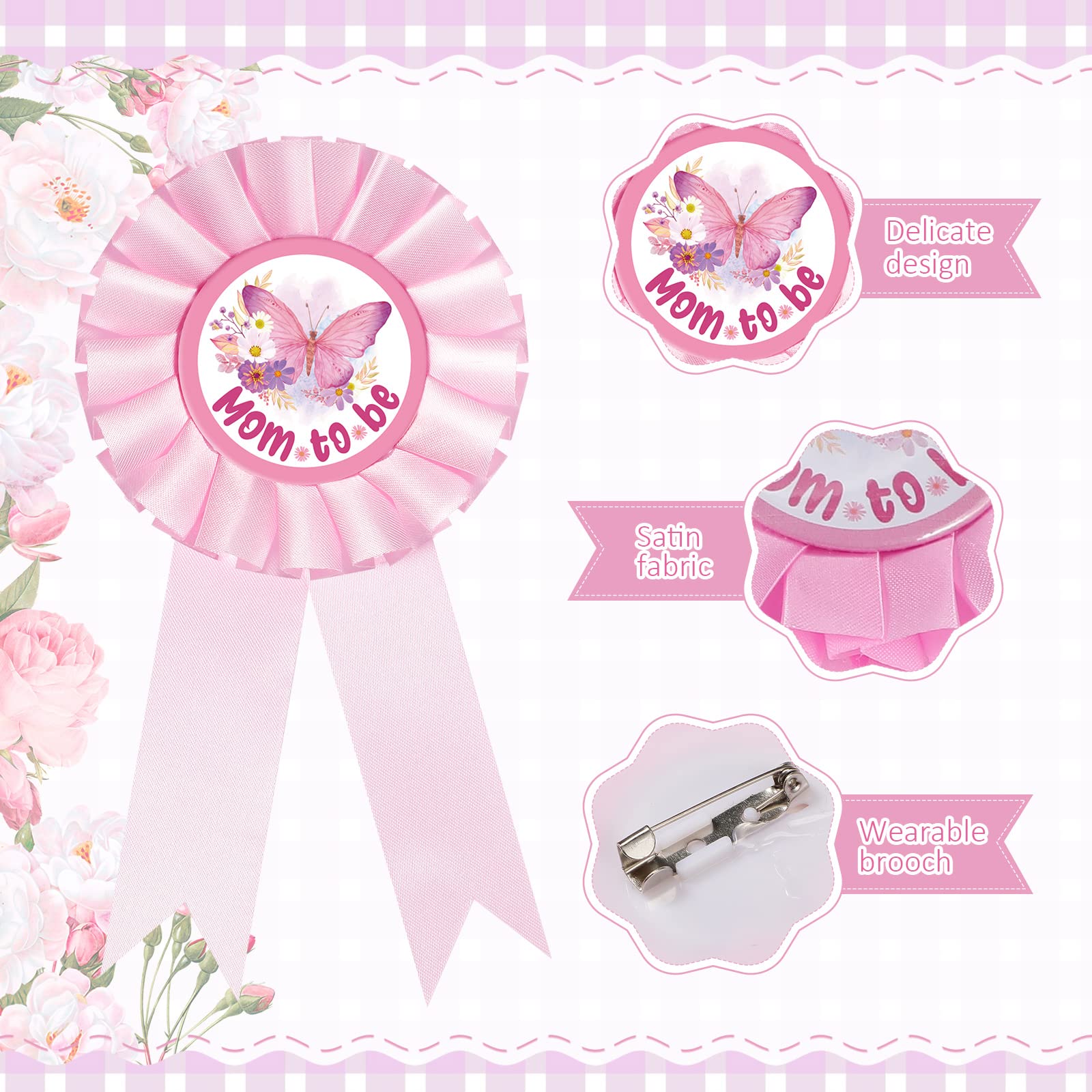 Reliable Material: these baby shower decorations for girls are mainly made of fabric and ribbon, this butterfly themed shoulder sash and pin kit is reliable and wear resistant, not easy to break or deform, and can be applied by dad or mom for a long time