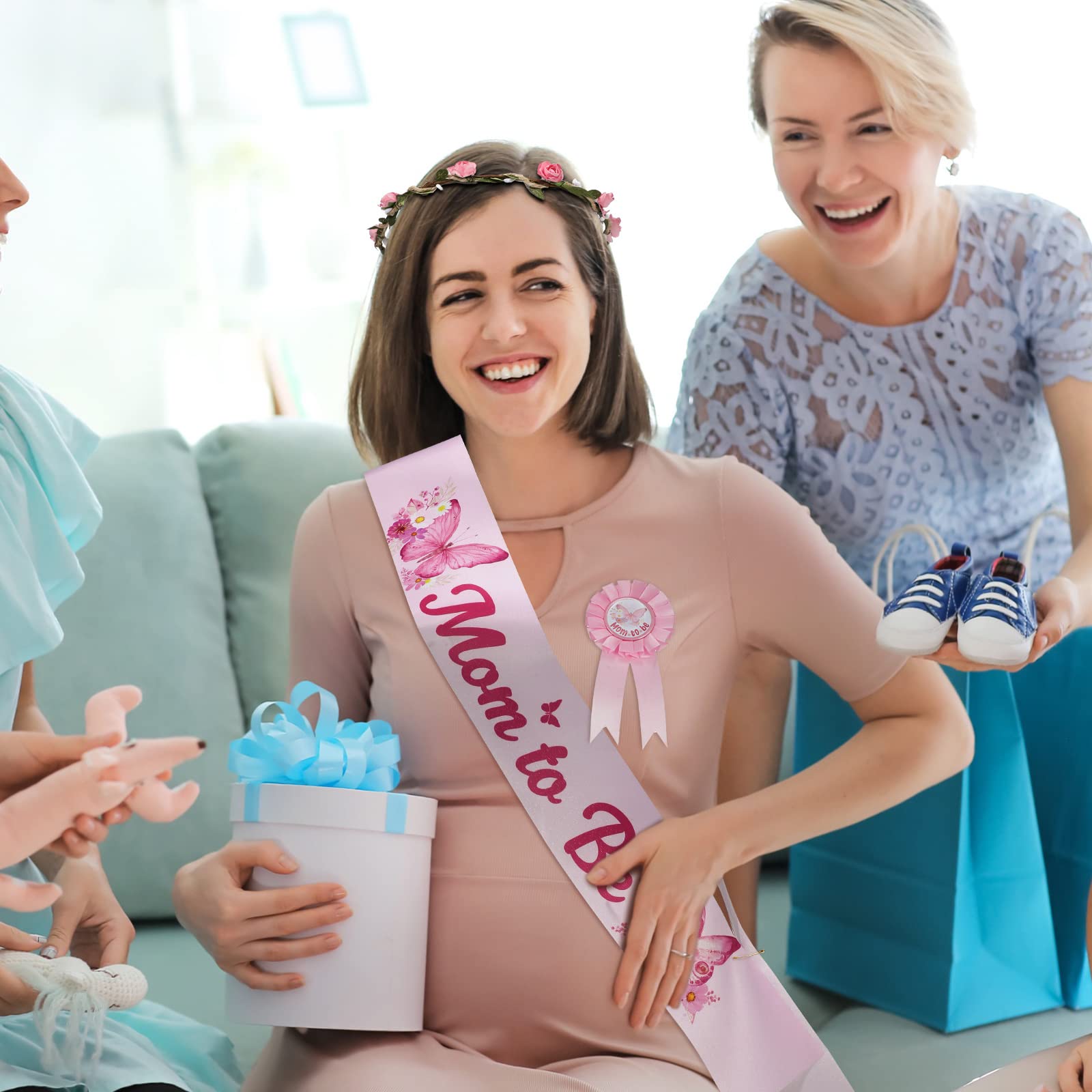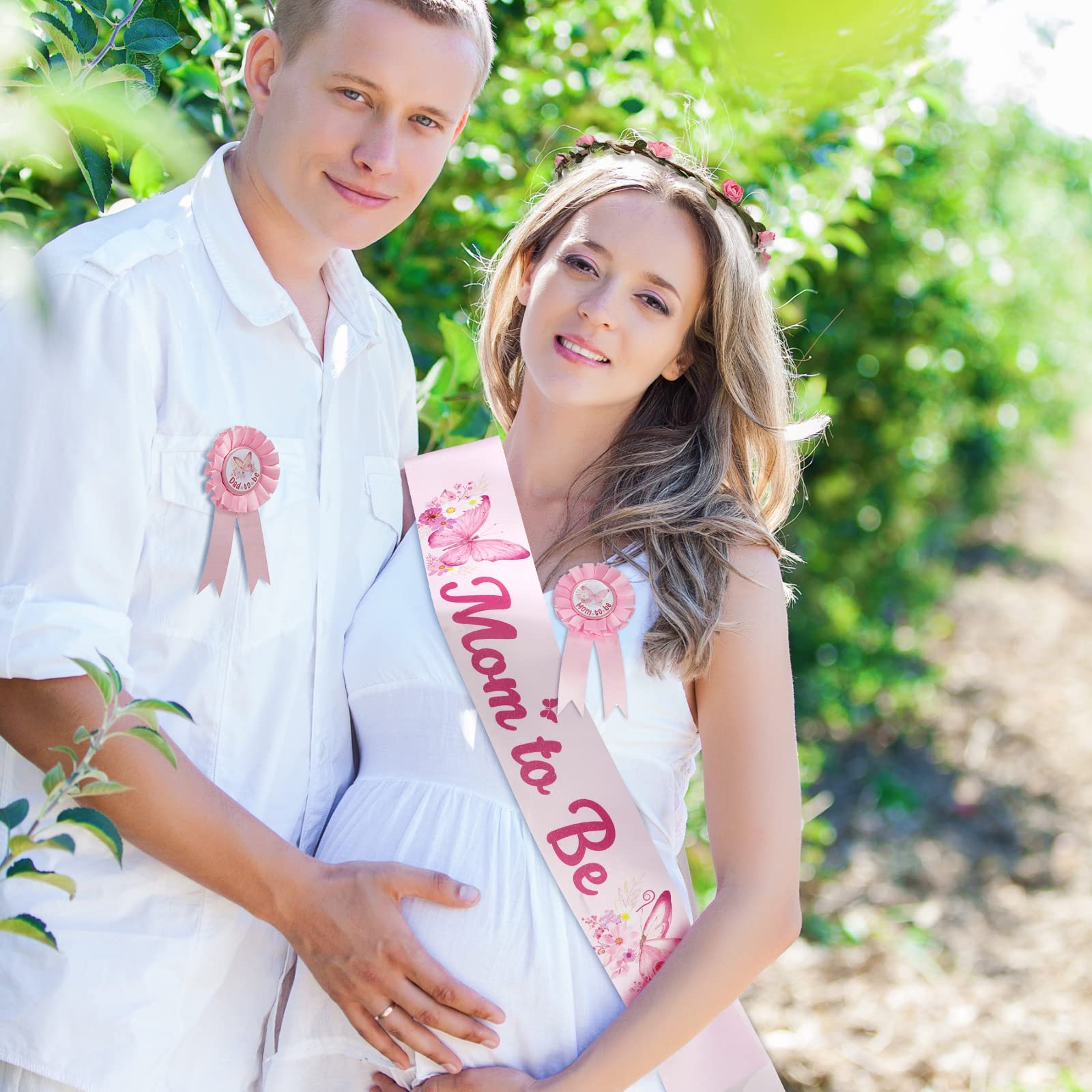 Baby Shower Supplies Set: there comes with 1 mom to be sash, 1 mom to be pin, 1 dad to be pin and 1 flower crown, suitable for celebrating the arrival of the baby girl, and bring unforgettable memories to most people