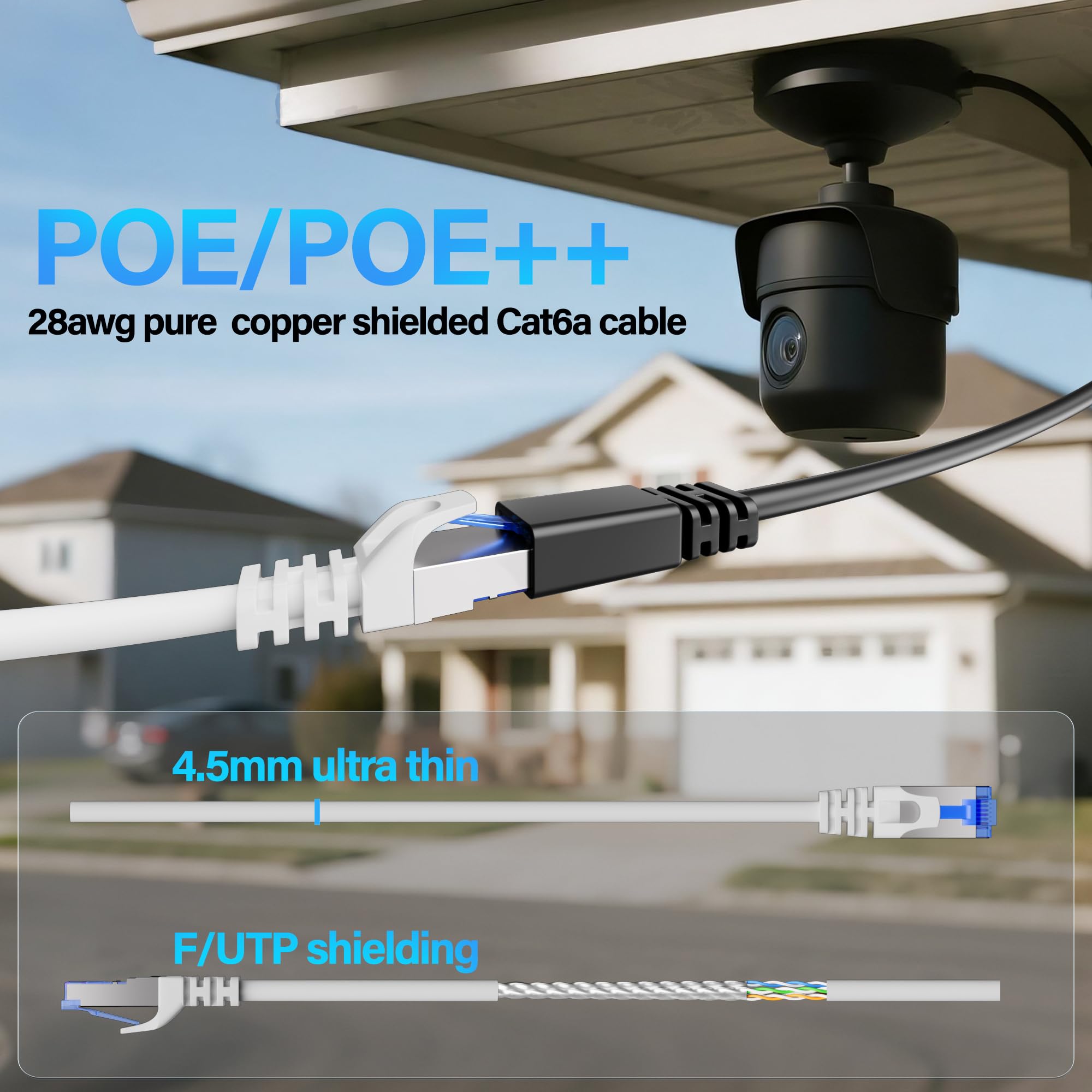 【Support POE】: Cat6a poe cable are made of 28awg pure bare copper, which has excellent conductivity and minimal signal loss. Cat 6 shielded ethernet cable support POE/POE++ for security cameras, VoIP phones, access points and so on. Pure copper wires of ethernet cable cat 6a ensure faster speeds, less resistance and reliable POE++ power supply.