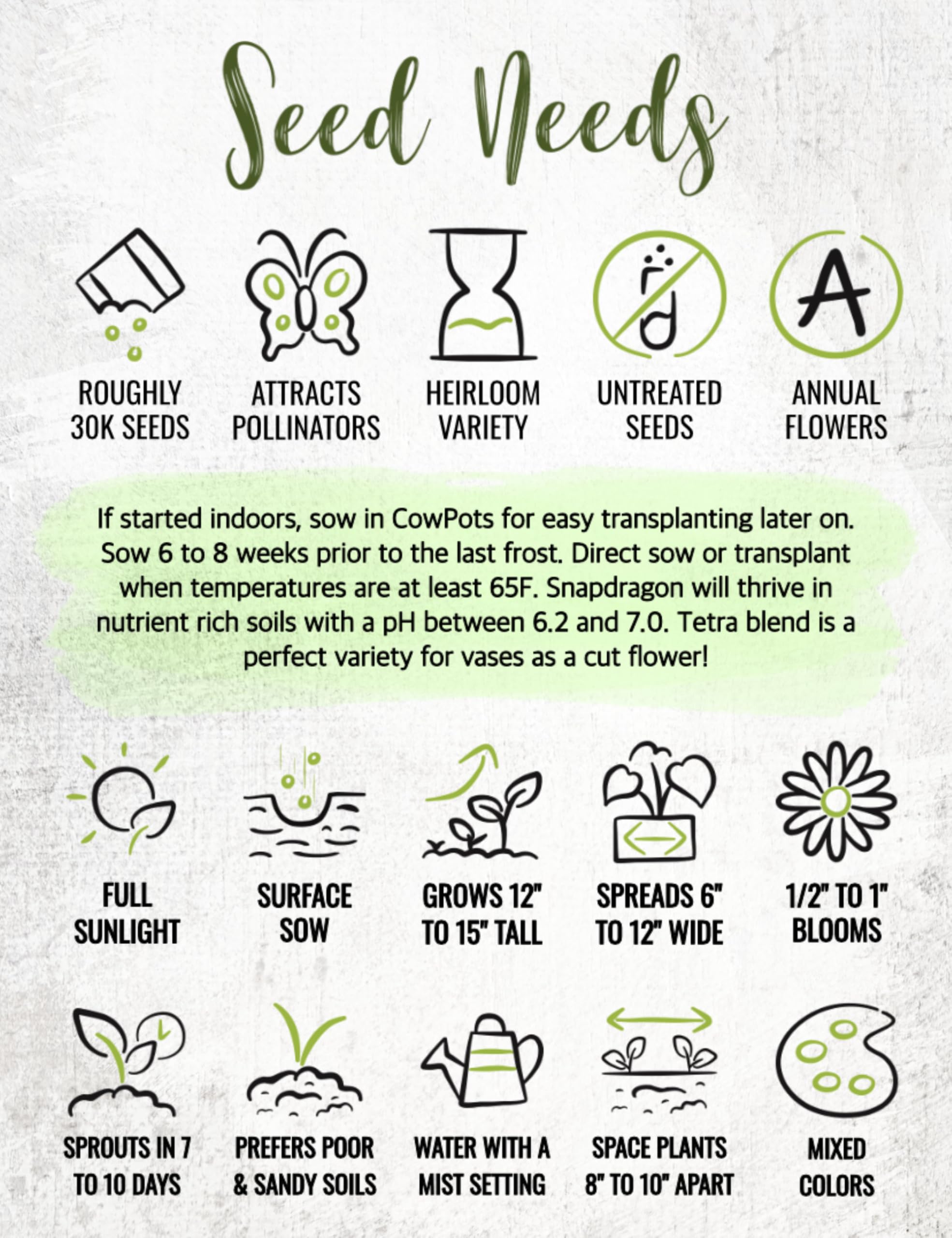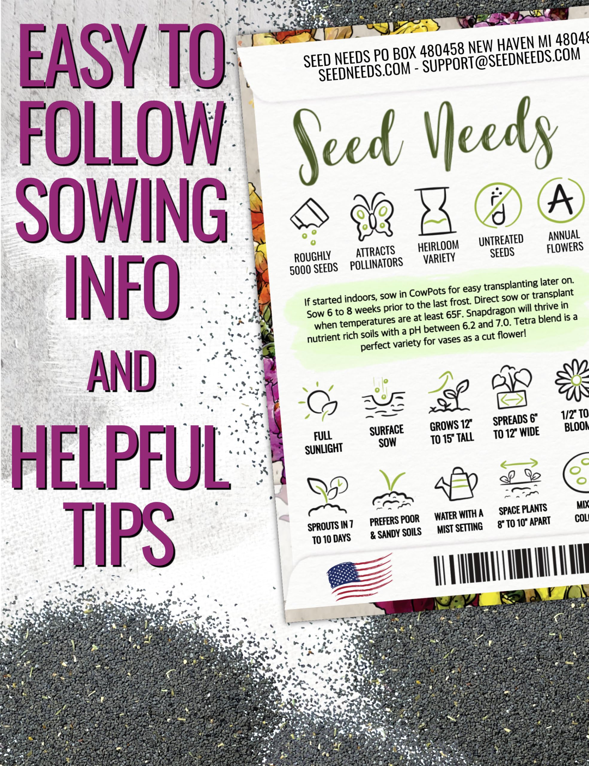 Quantity: Seed Needs offers generous quantities. You can share with friends and family, or you can save the extra seeds until the following season, if properly stored.