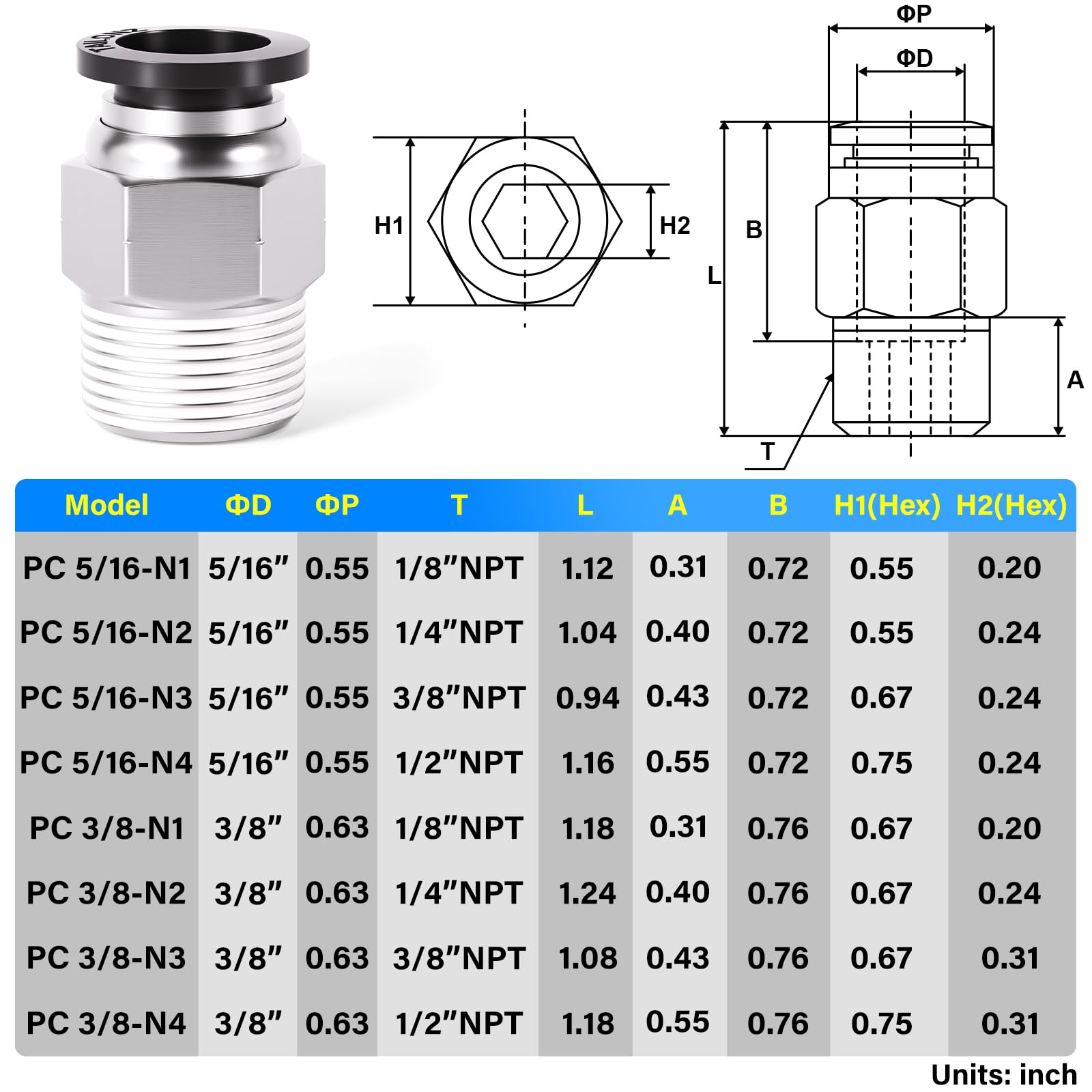 【Size】3/8" Tube OD x 3/8" NPT Thread,Notice - NPT Thread Size is a Nominal Pipe Size, and it Does Not represent the actual diameter