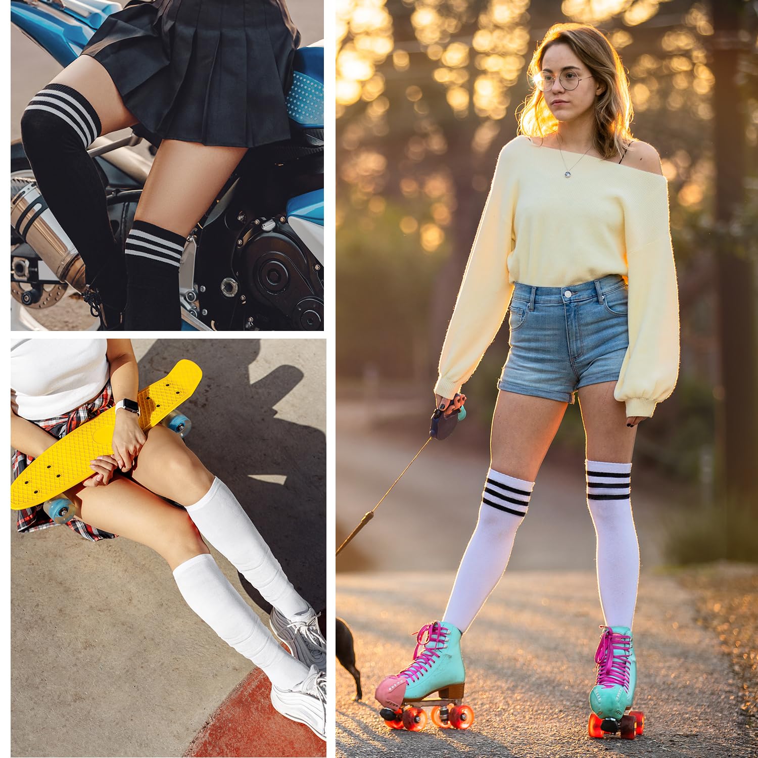 Package includes: 6 Pairs high quality thigh high socks, three colors, white, black and gray, three pairs with stripes and three pairs without stripes. 6 pairs allow you to match your outfit at will, one purchase to meet your different needs, they are classical, fashionable and attractive.