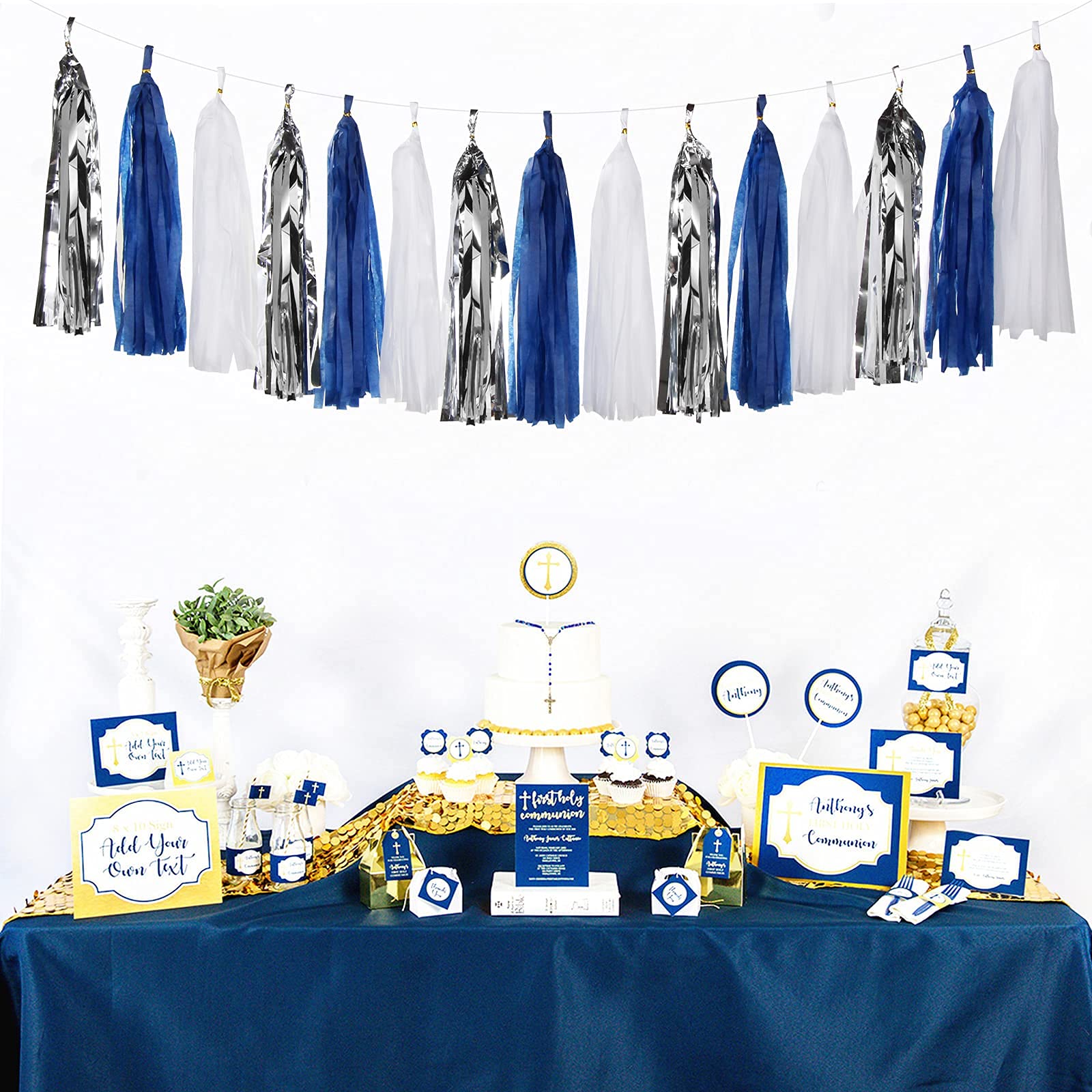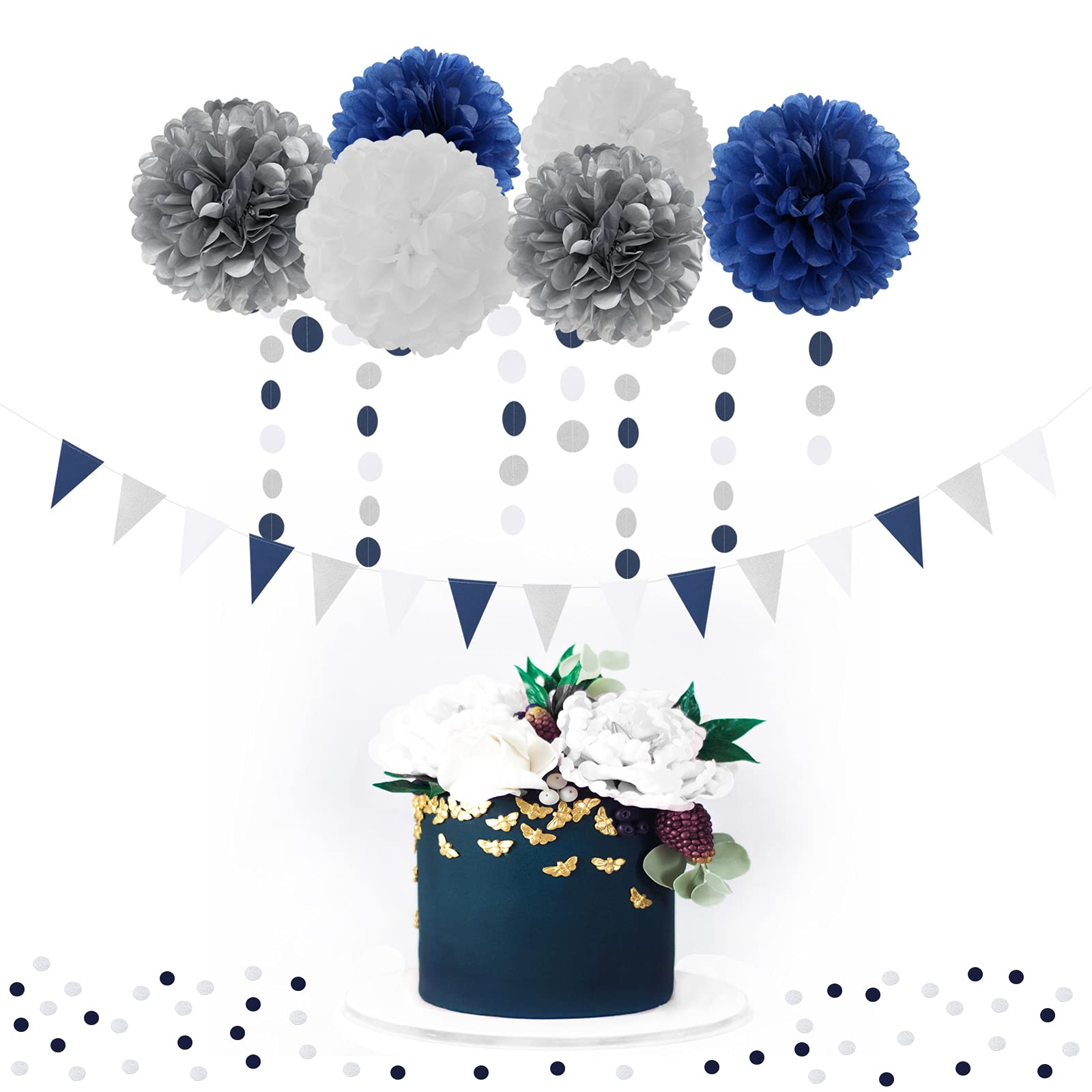 【Navy Blue White Silver Party Kits】The party decorations kits include 6pcs tissue paper flowers: 3pcs 8" and 3pcs 10" in three color, 1pcs Triangle Flags,1pcs circle dots paper garland, 15pcs tassel garland. Total 23pcs.