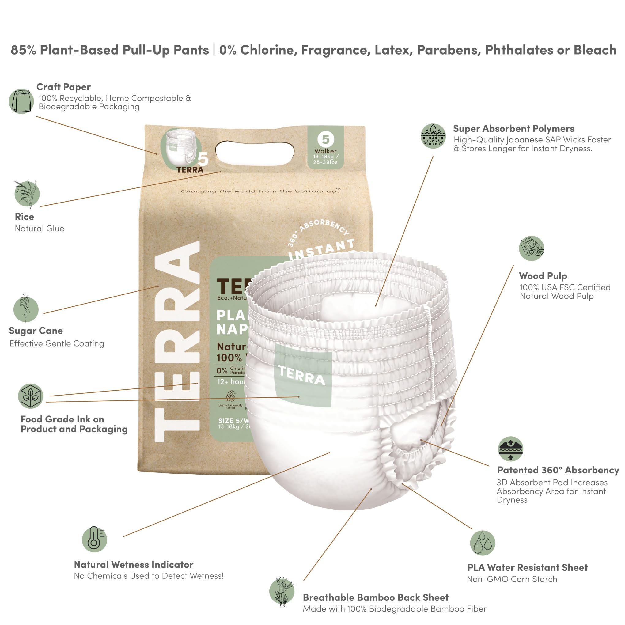 ECO DIAPERS THAT WORK: Terra Pull-Up Style Diapers are gentle on your baby and their world—and they work, even as an overnight diaper. Made with 85 percent plant-based materials, suitable for all skin types and dermatologically rated ‘Excellent’ by Dermatest.
