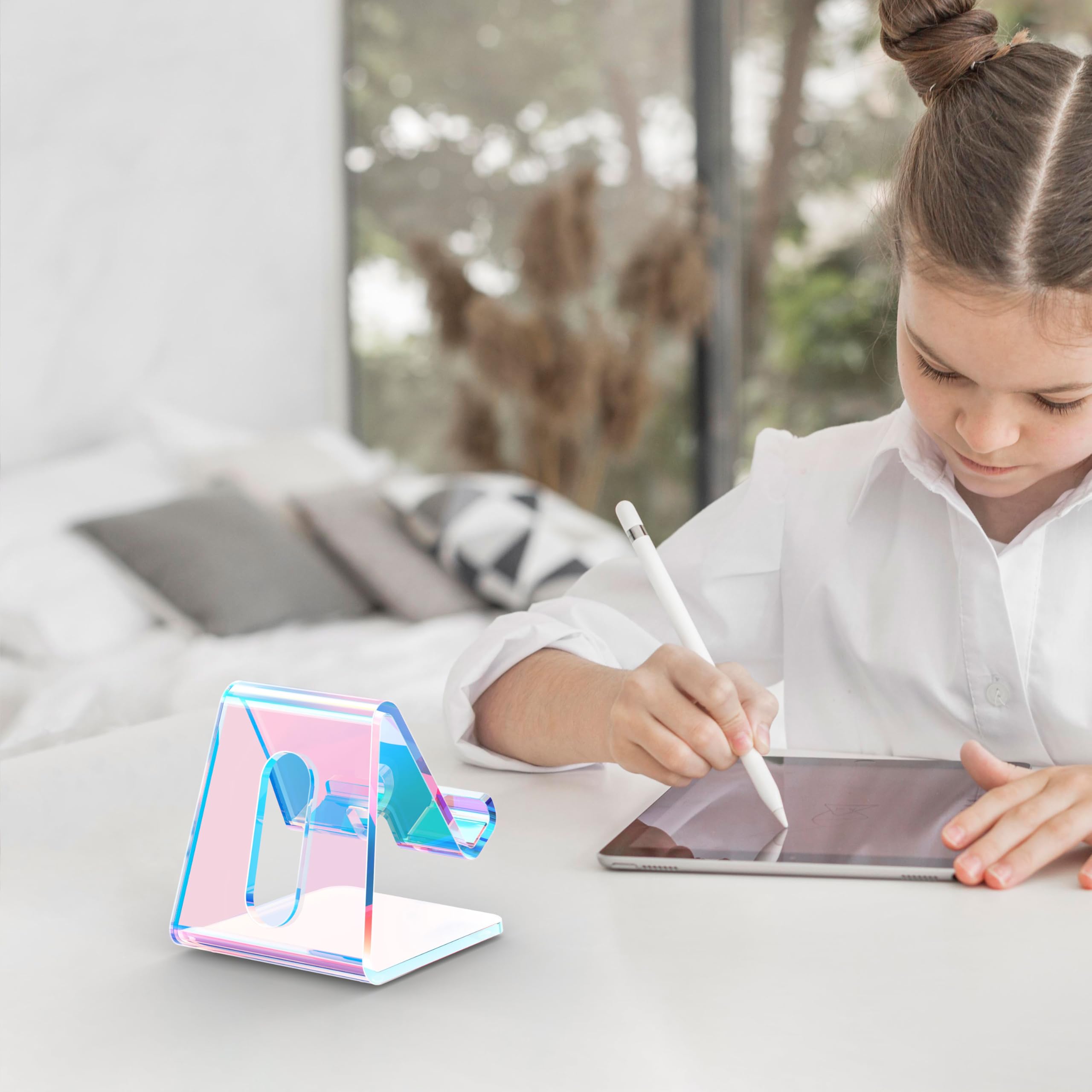 Multipurpose Use: Enjoy hands-free convenience for gaming, FaceTime, YouTube, and charging. Whether it's on your desk, in the kitchen, by your nightstand, or on the dining table, this iridescent acrylic stand seamlessly blends into any environment. Its minimalist yet modern design adds elegance to your workspace. It makes a perfect gift for students, colleagues, or loved ones.