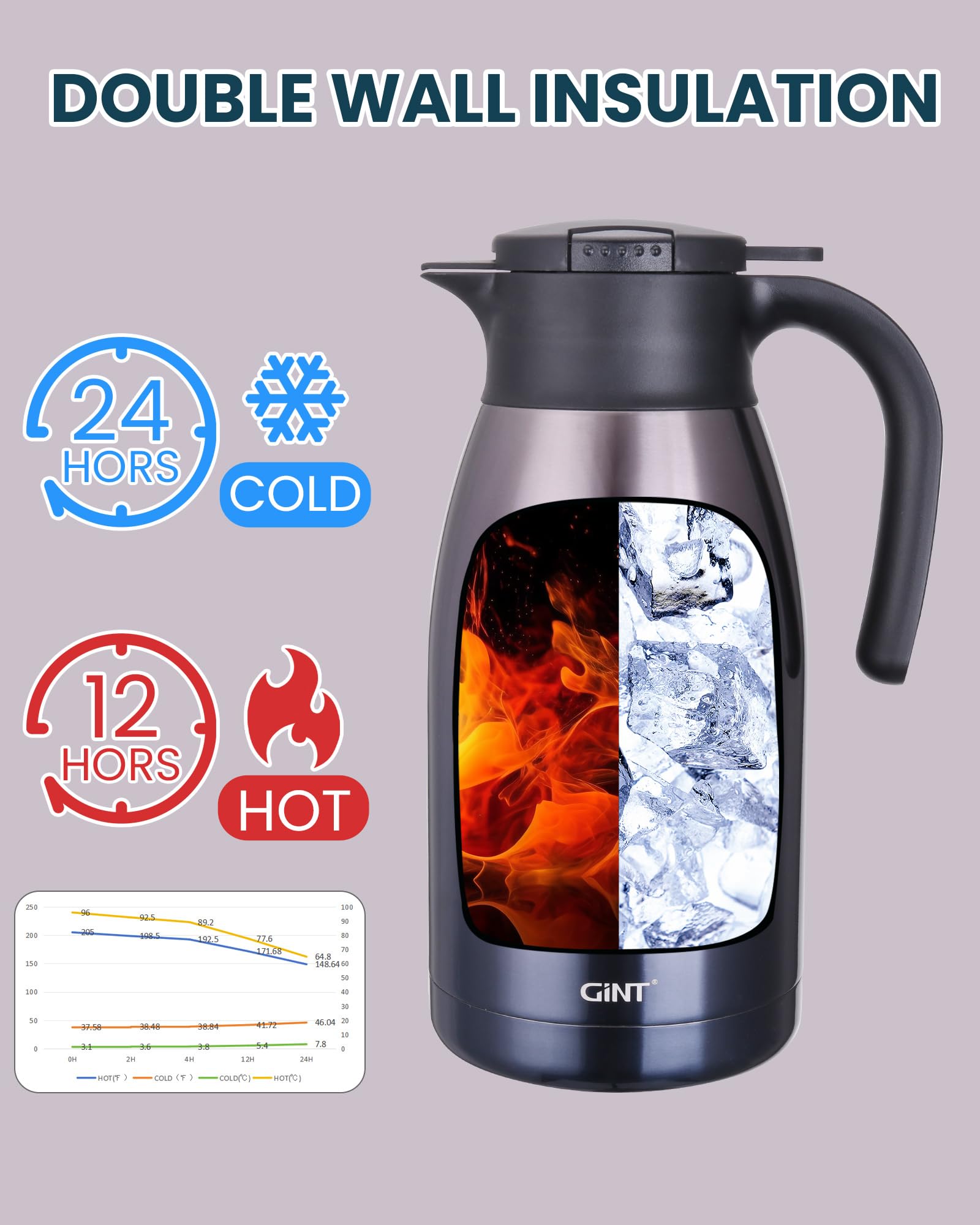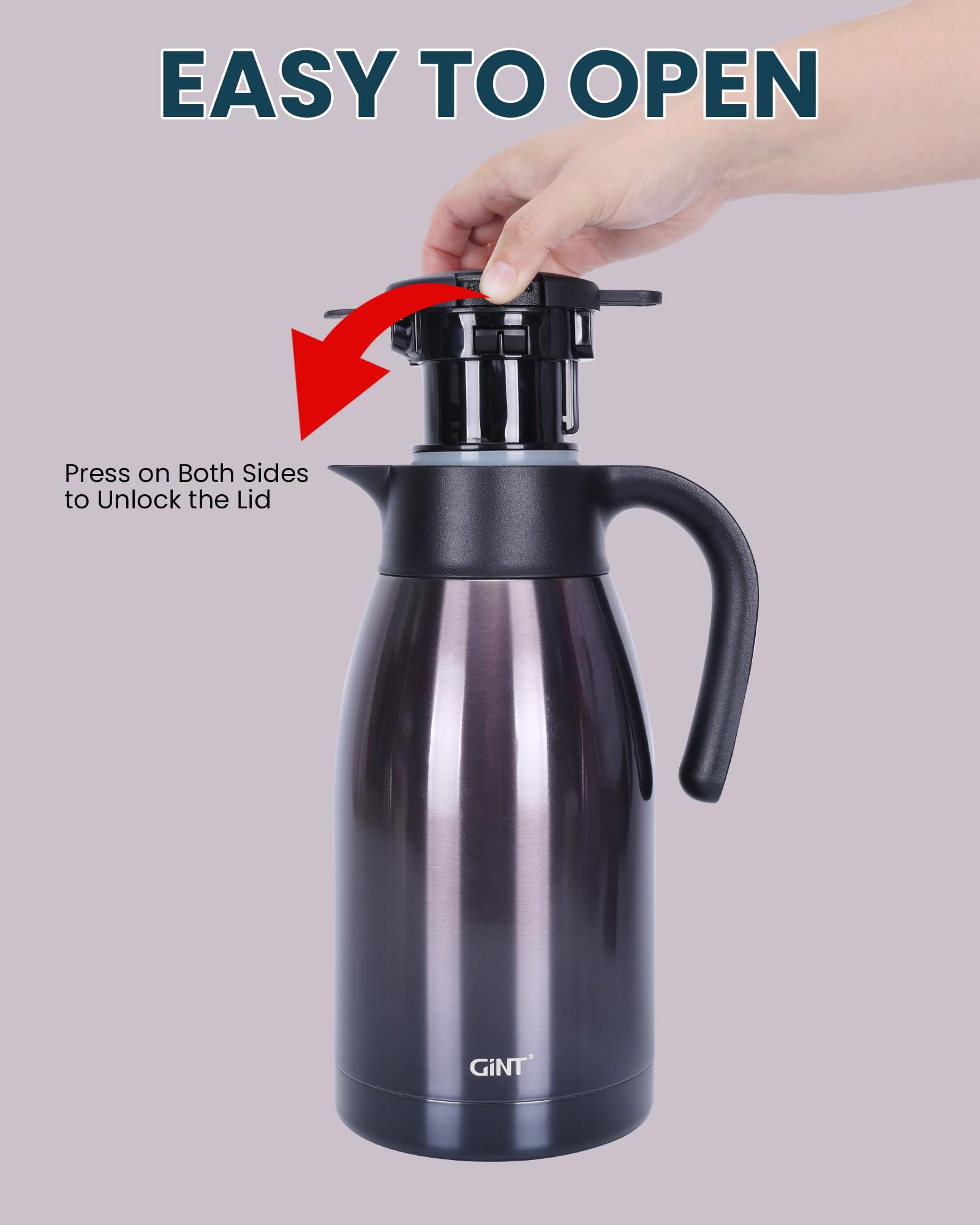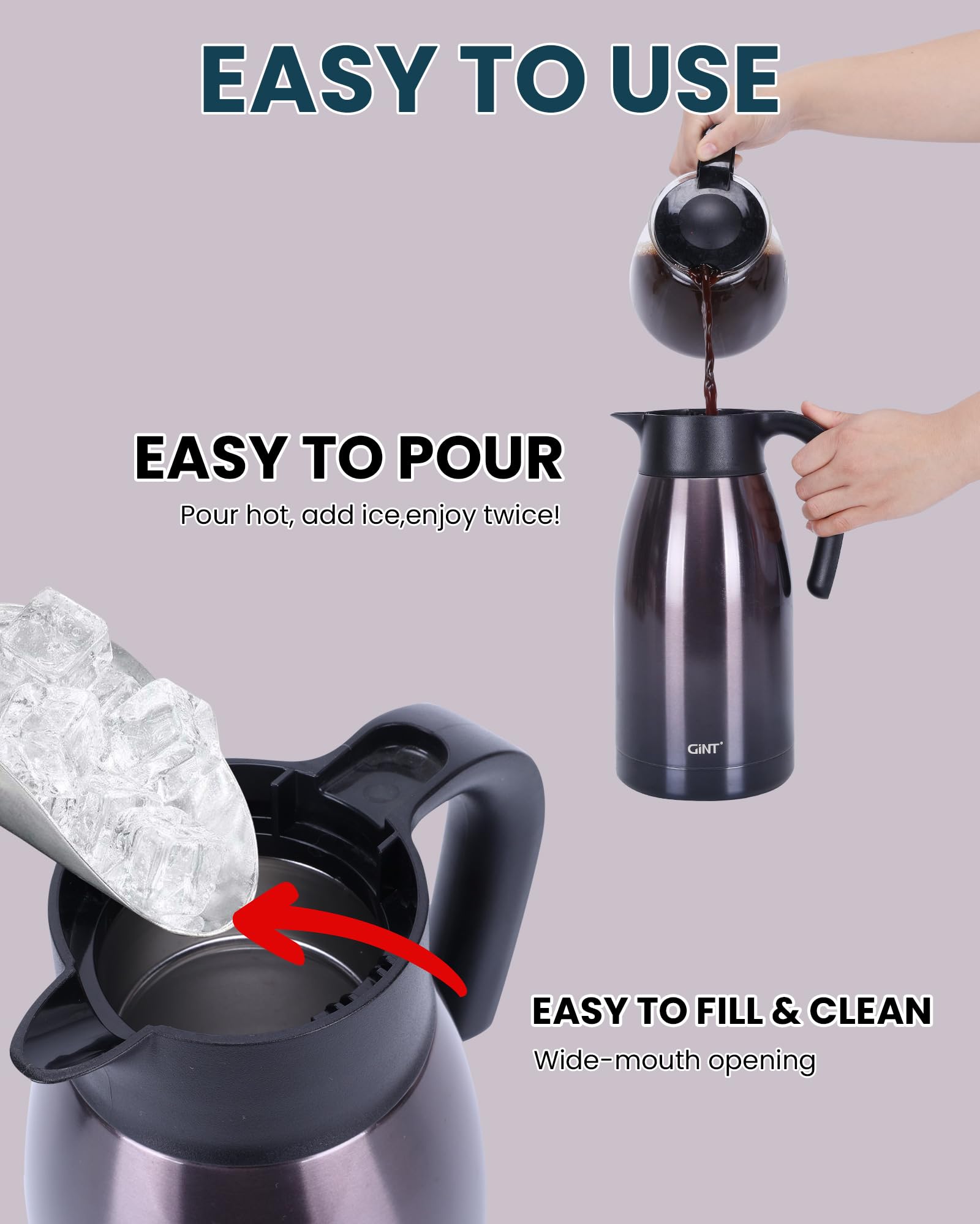 USER FRIENDLY: GiNT thermal carafe features extra wide top opening, easy for cleaning and adding ice cubes; Simple-push button enables single-hand pouring without leaking, dripping or spilling; Ideal used for bedside, restaurant, office, party, camping, travel insulated coffee carafes.