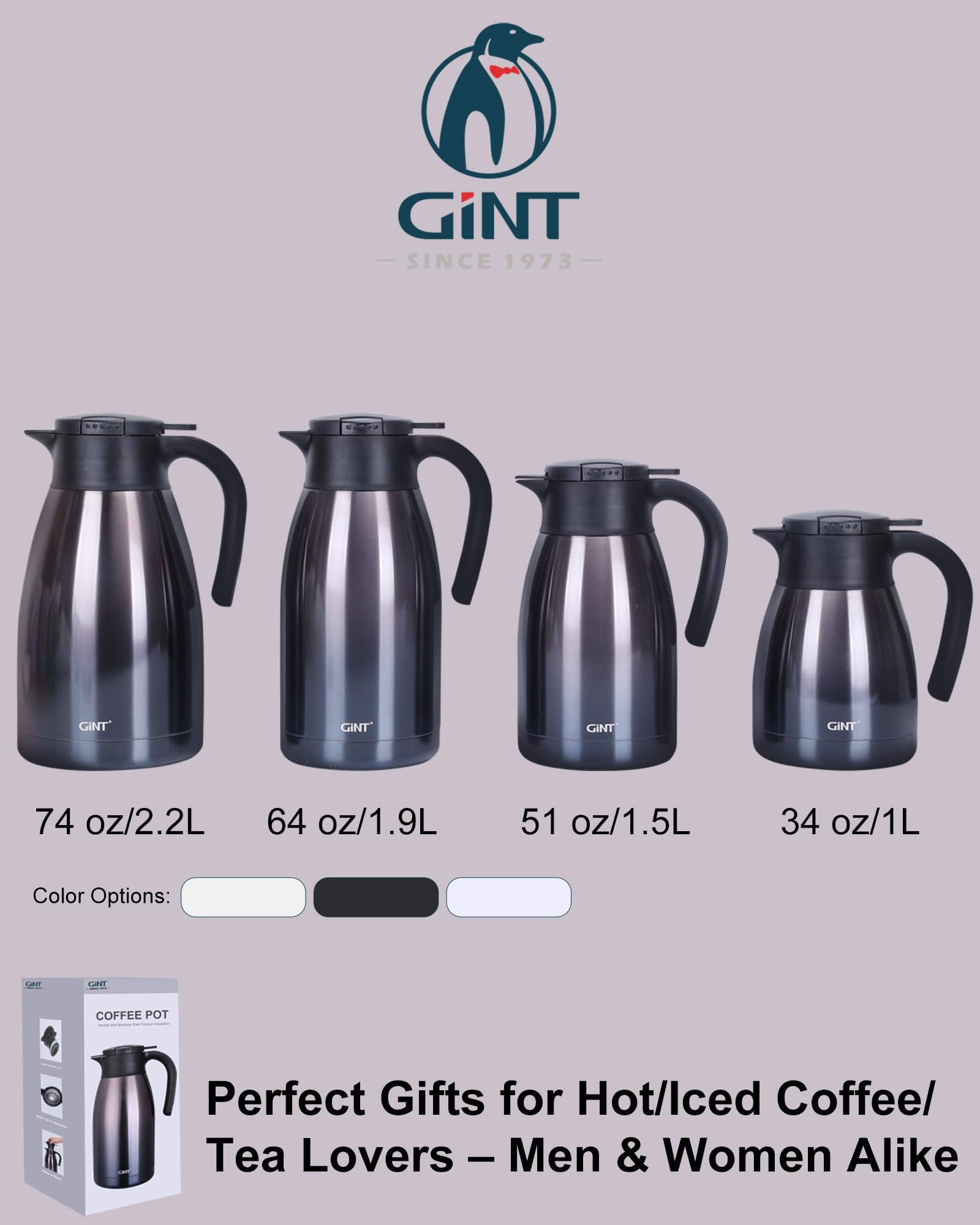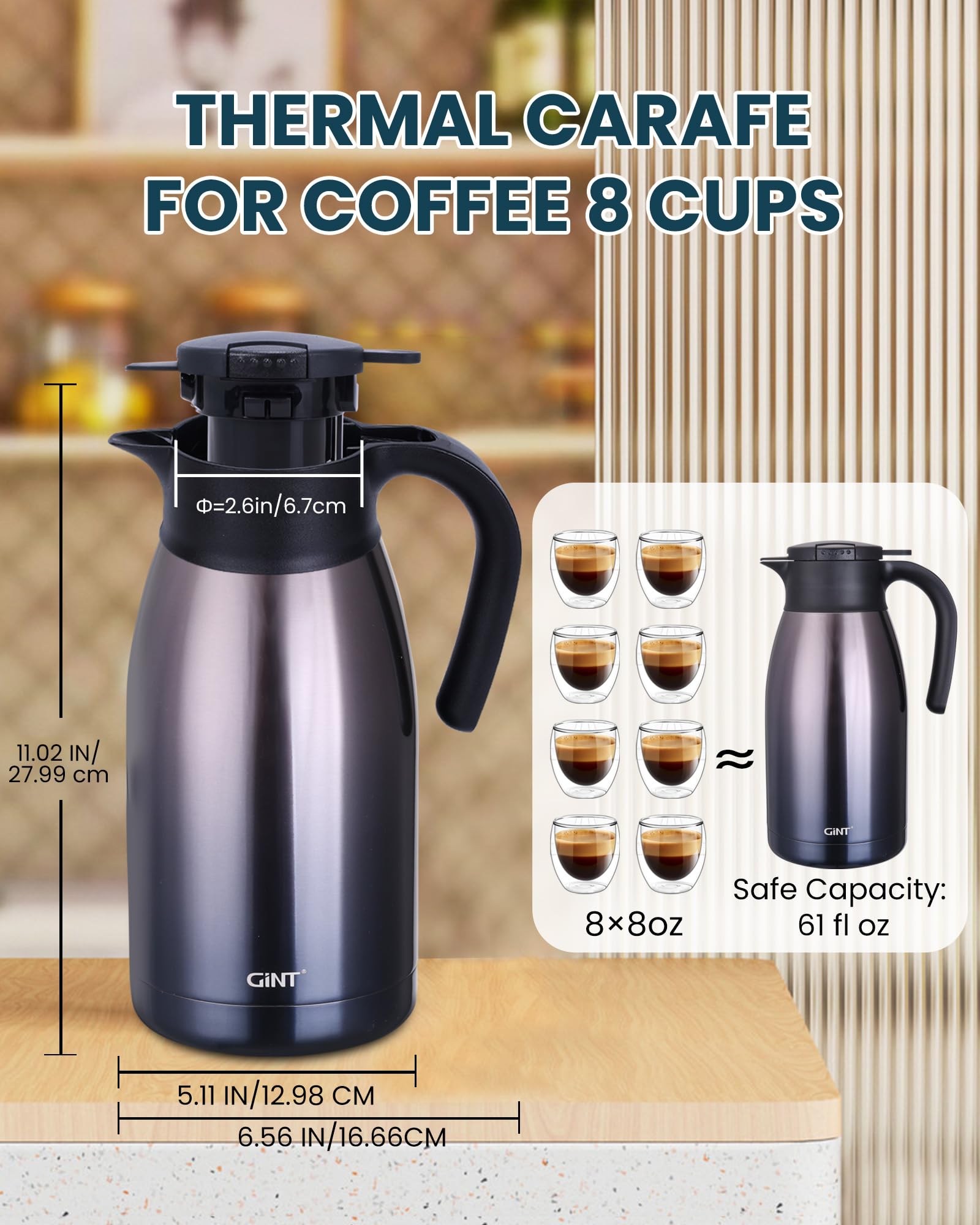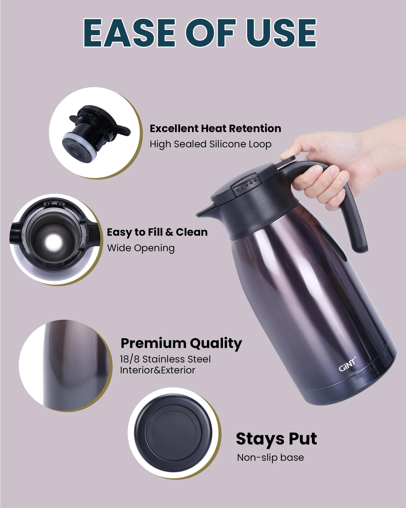 USER FRIENDLY: GiNT thermal carafe features extra wide top opening, easy for cleaning and adding ice cubes; Simple-push button enables single-hand pouring without leaking, dripping or spilling; Ideal used for bedside, restaurant, office, party, camping, travel insulated coffee carafes.