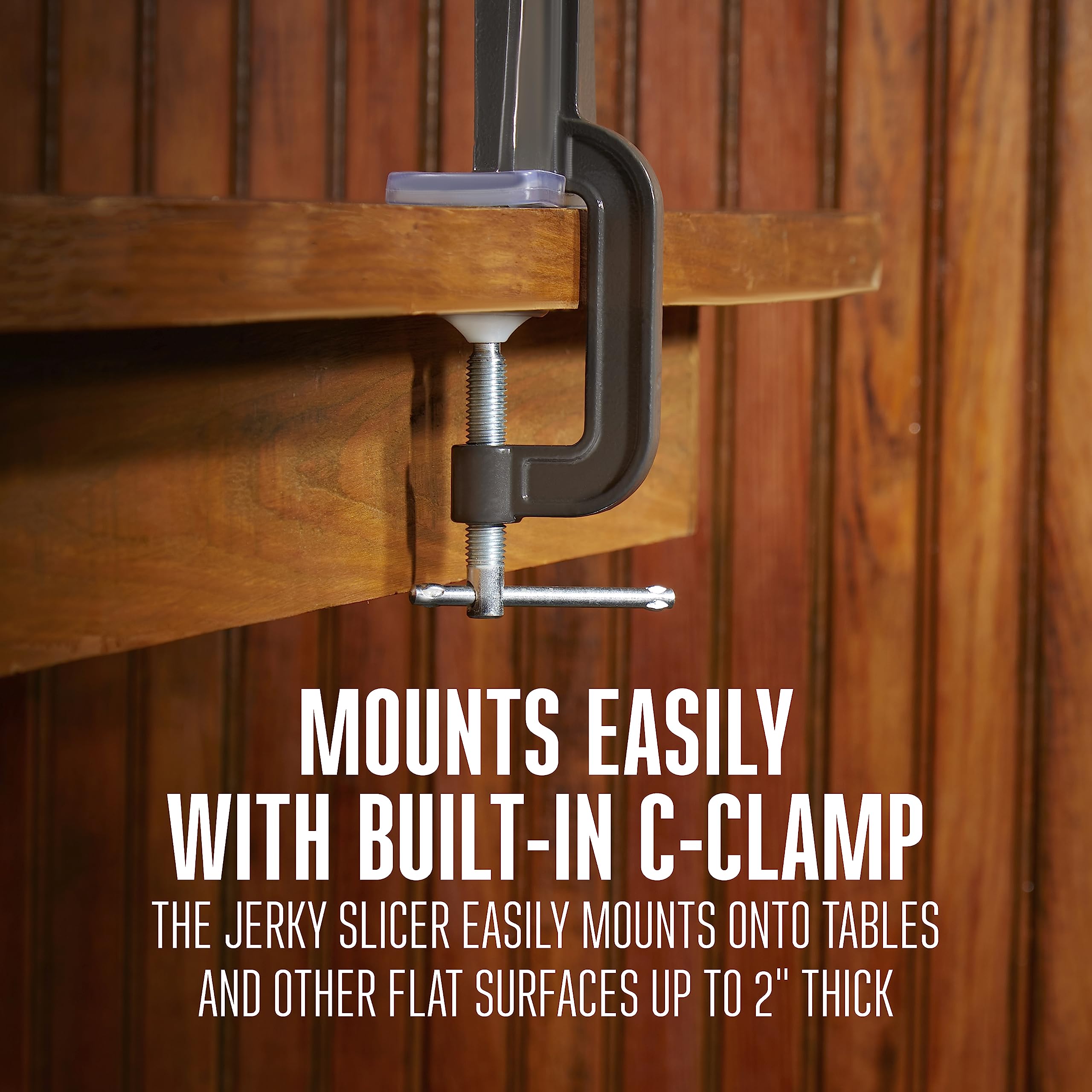 MOUNTS EASILY WITH BUILT-IN C-CLAMP: The jerky slicer easily mounts onto tables and other flat surfaces up to 2" thick using the built-in C-clamp