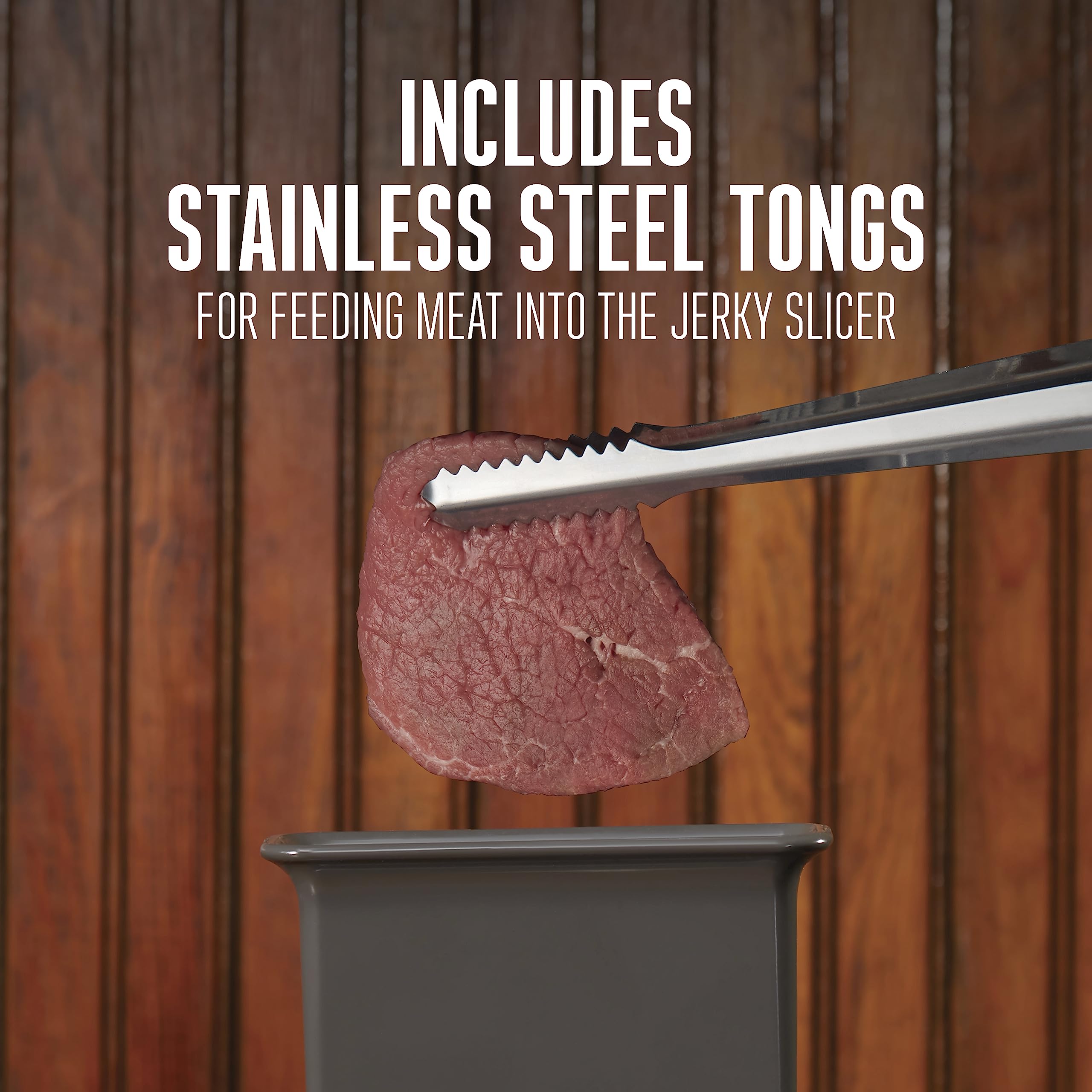 INCLUDES STAINLESS STEEL TONGS: The jerky slicer comes with stainless steel tongs for safe meat handling while making jerky. Great for feeding meat into the jerky slicer without getting your hands messy