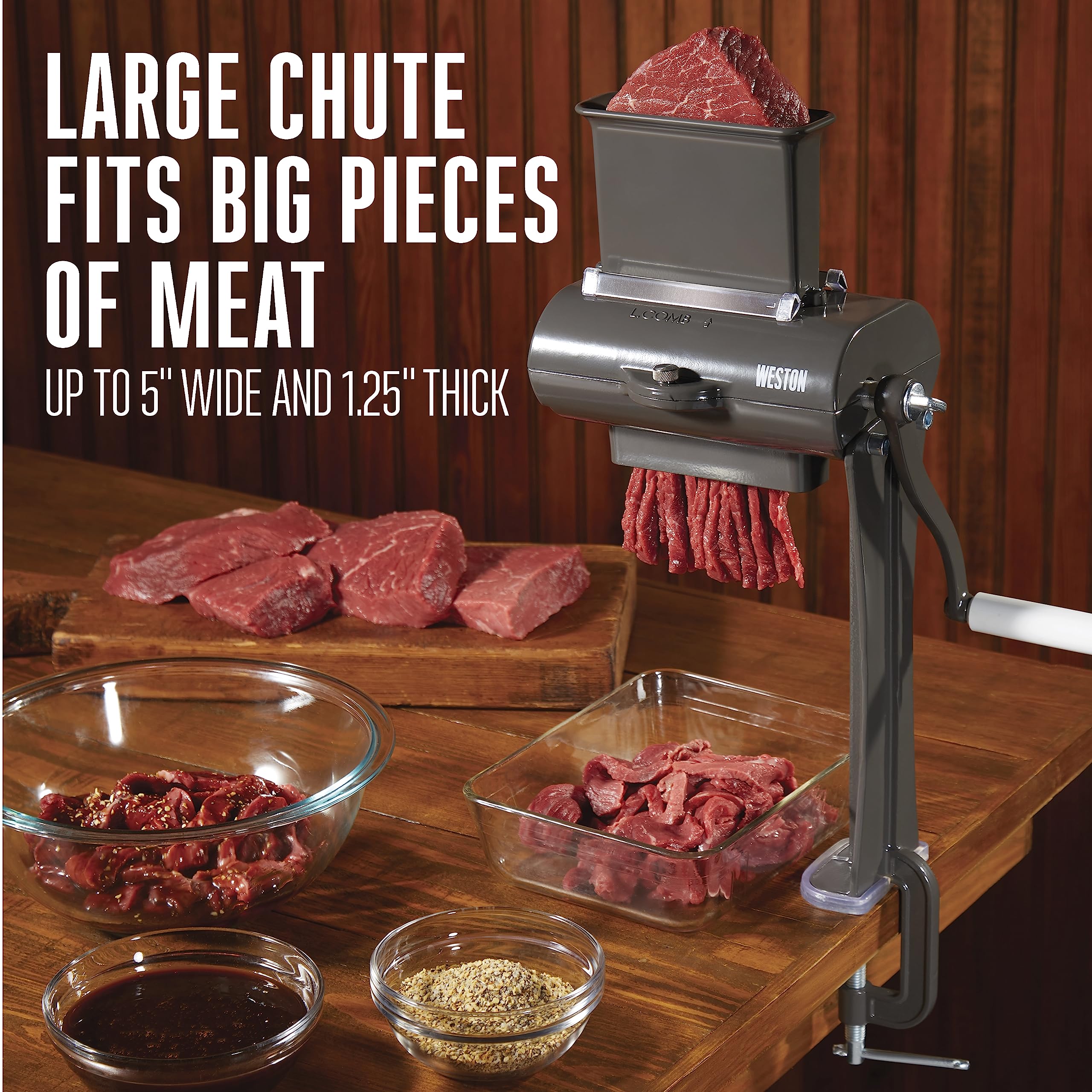 QUICKLY SLICES MEAT INTO CONSISTENT STRIPS FOR JERKY: This Weston jerky slicer has 32 stainless steel blades that quickly cut meat in consistent .25 strips for jerky. It can cut up to 15 quarter-inch strips at once