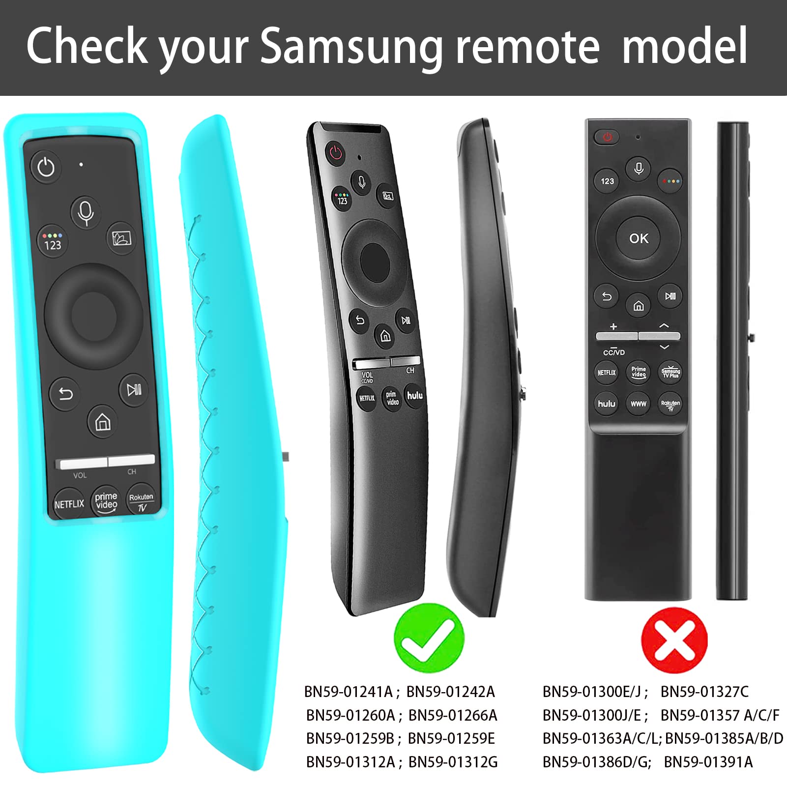 Compatible with Samsung TV remotes of BN59-01241A/BN59-01242A/BN59-01260A/BN59-01266A/BN59-01259B/BN59-01259E/BN59-01312A