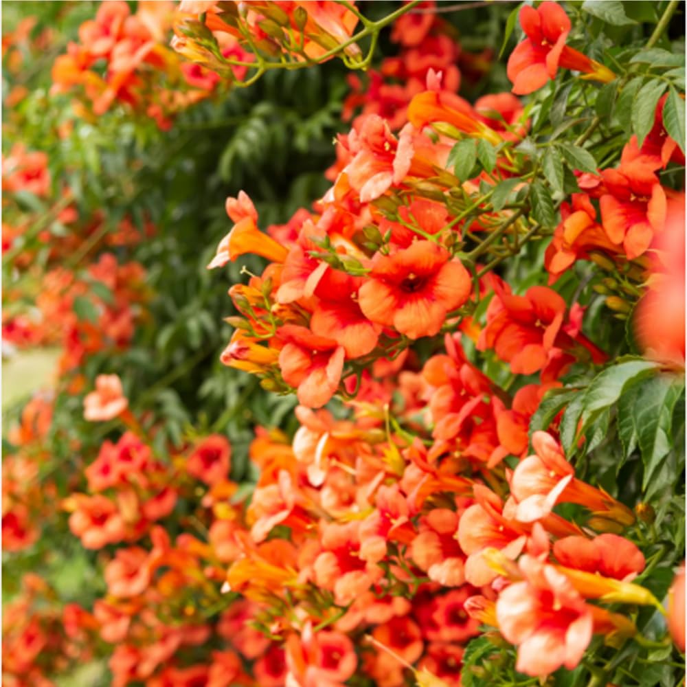 Trumpet vine has masses of showy trumpet-shaped flowers that are loved by hummingbirds. The flowers are very attractive to hummingbirds, and many types of birds love to nest in the dense foliage