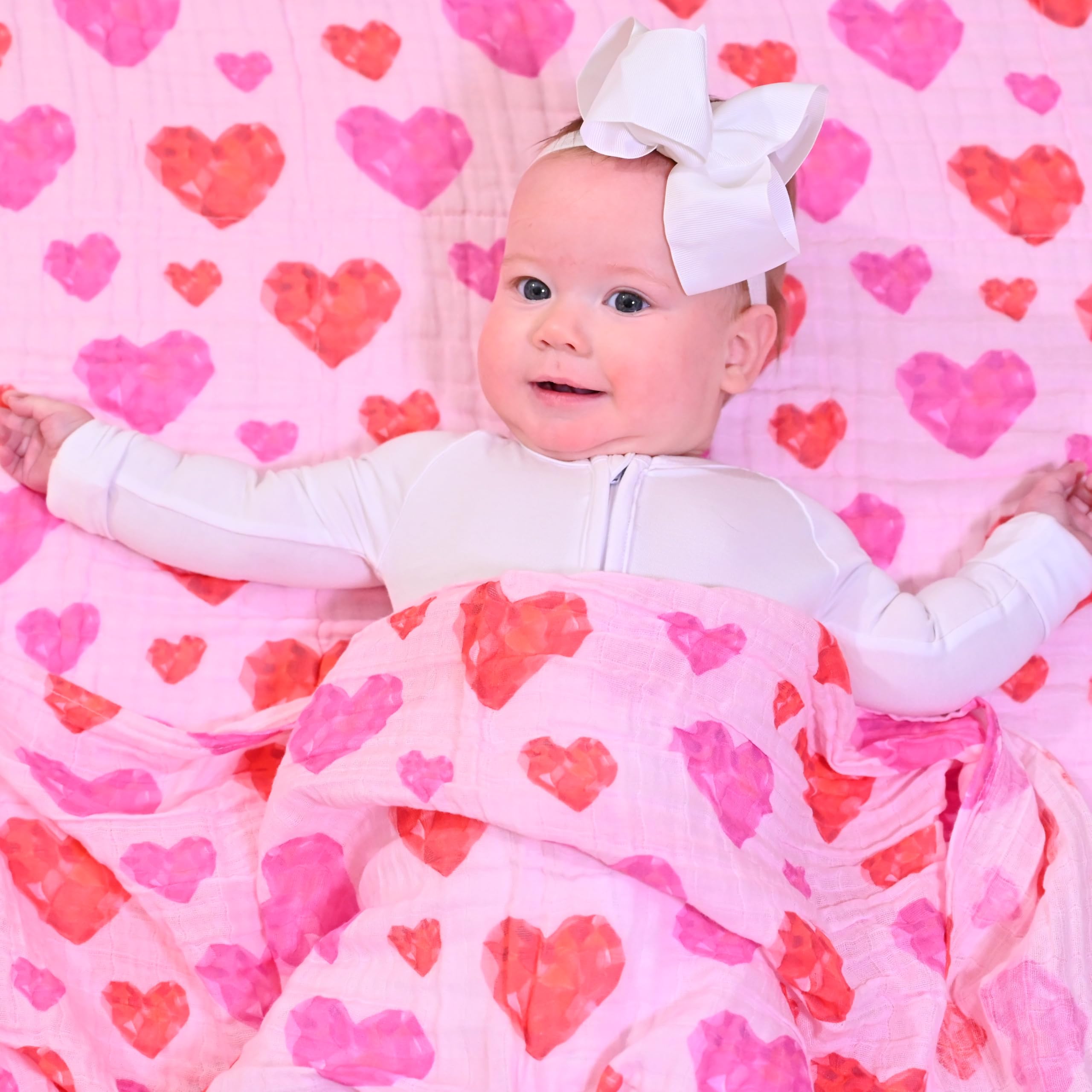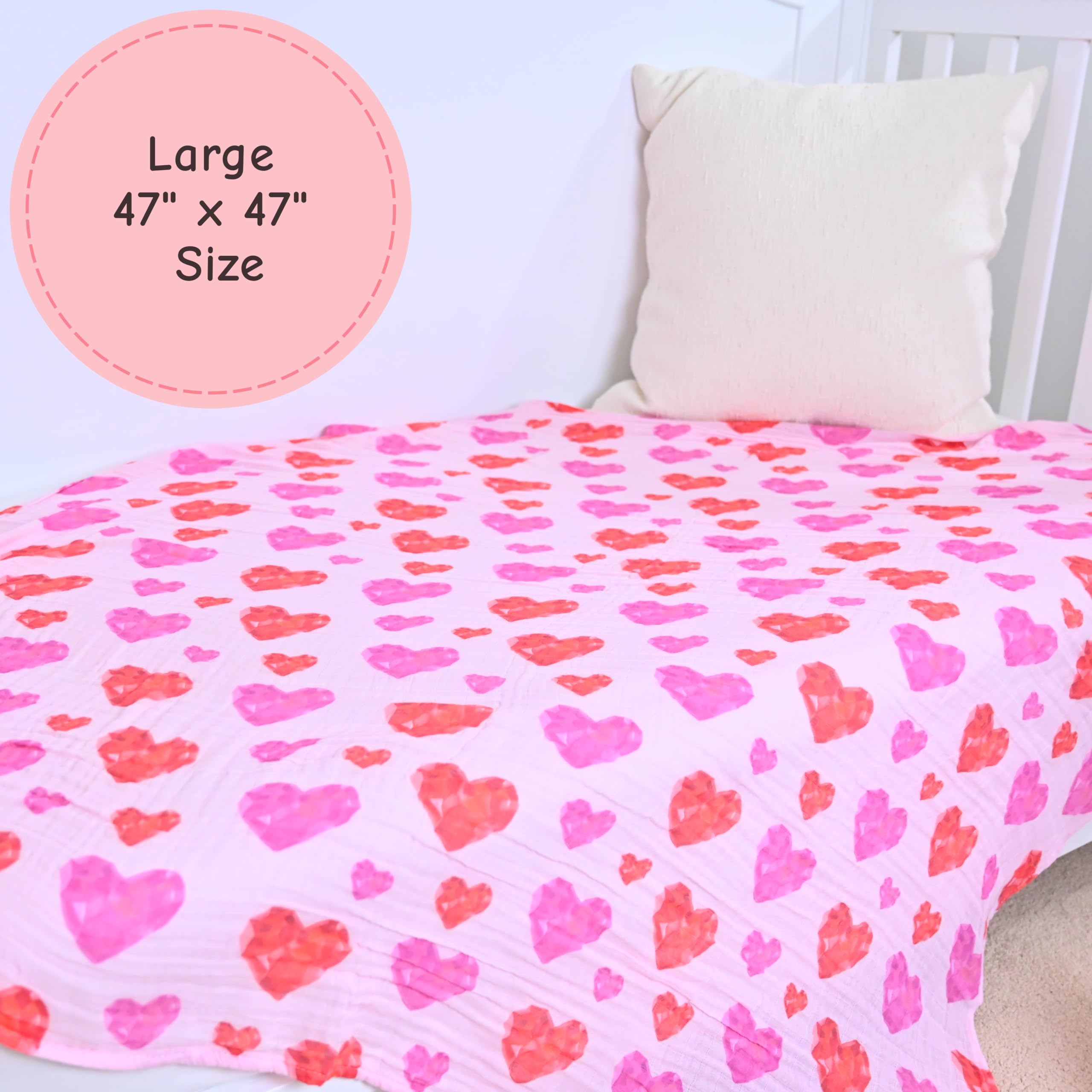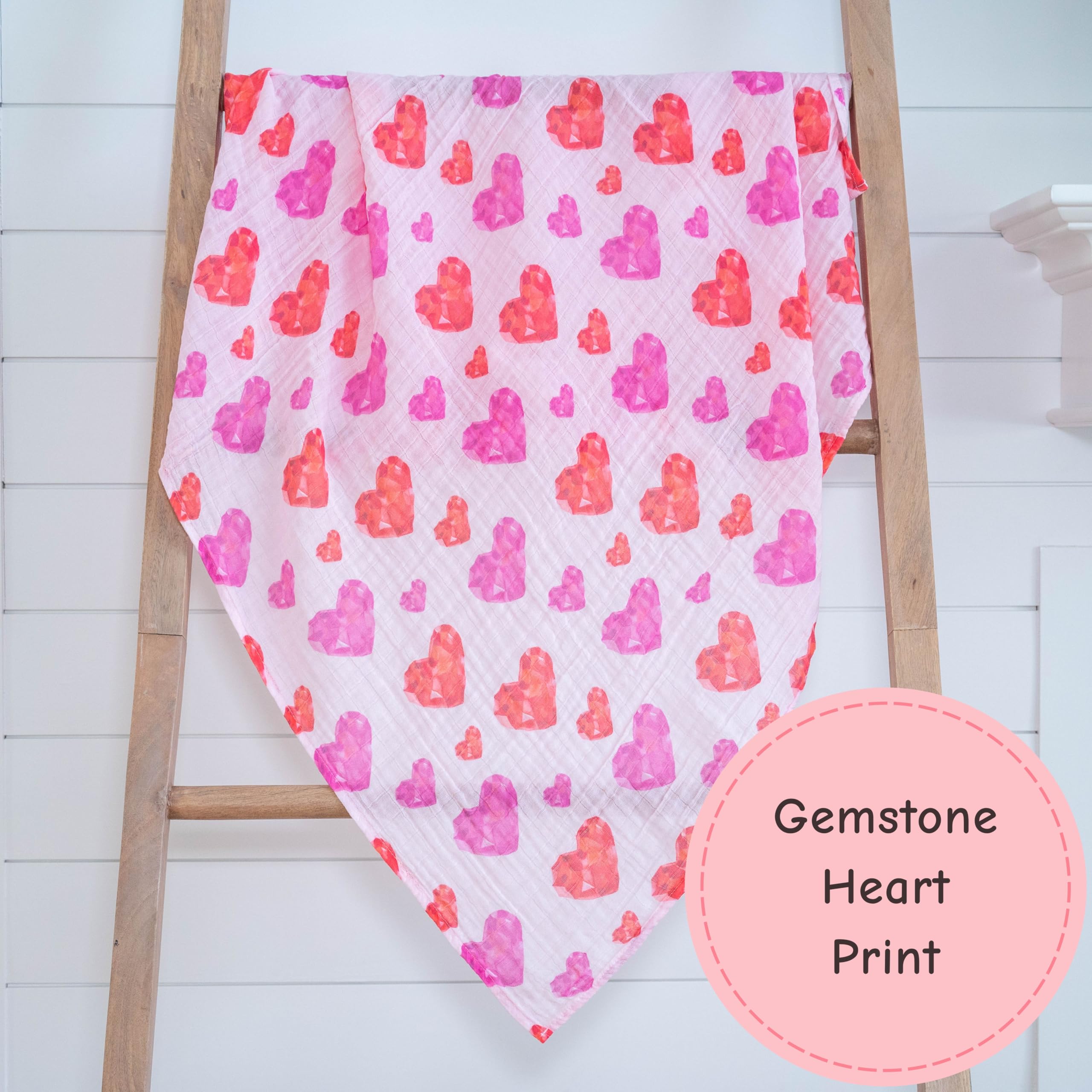 GEMSTONE HEART PRINT - Shimmering heart motifs inspired by sparkling gemstones adorn this soft muslin blanket, offering your little girl a sweet and elegant touch of love while keeping her snug and comfortable