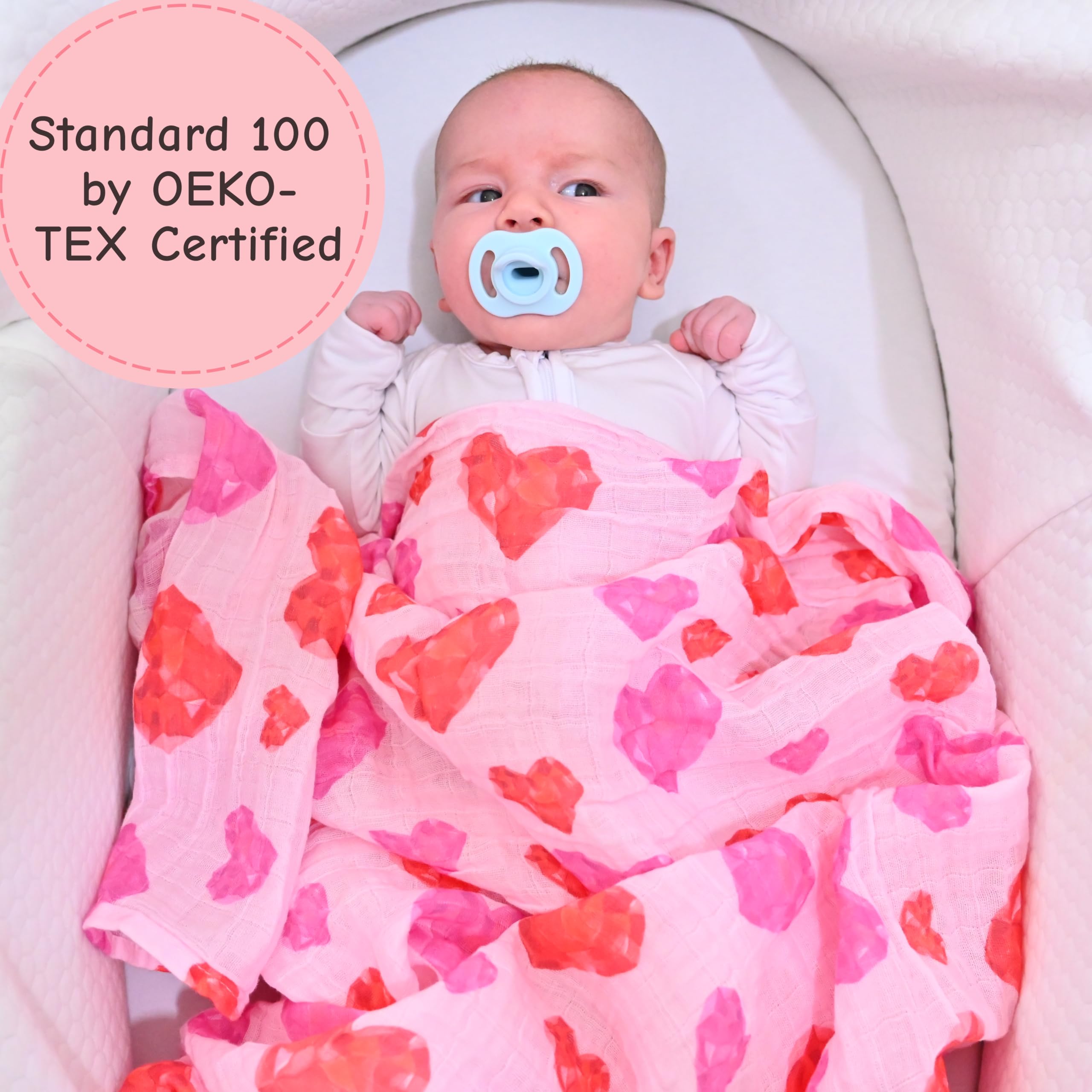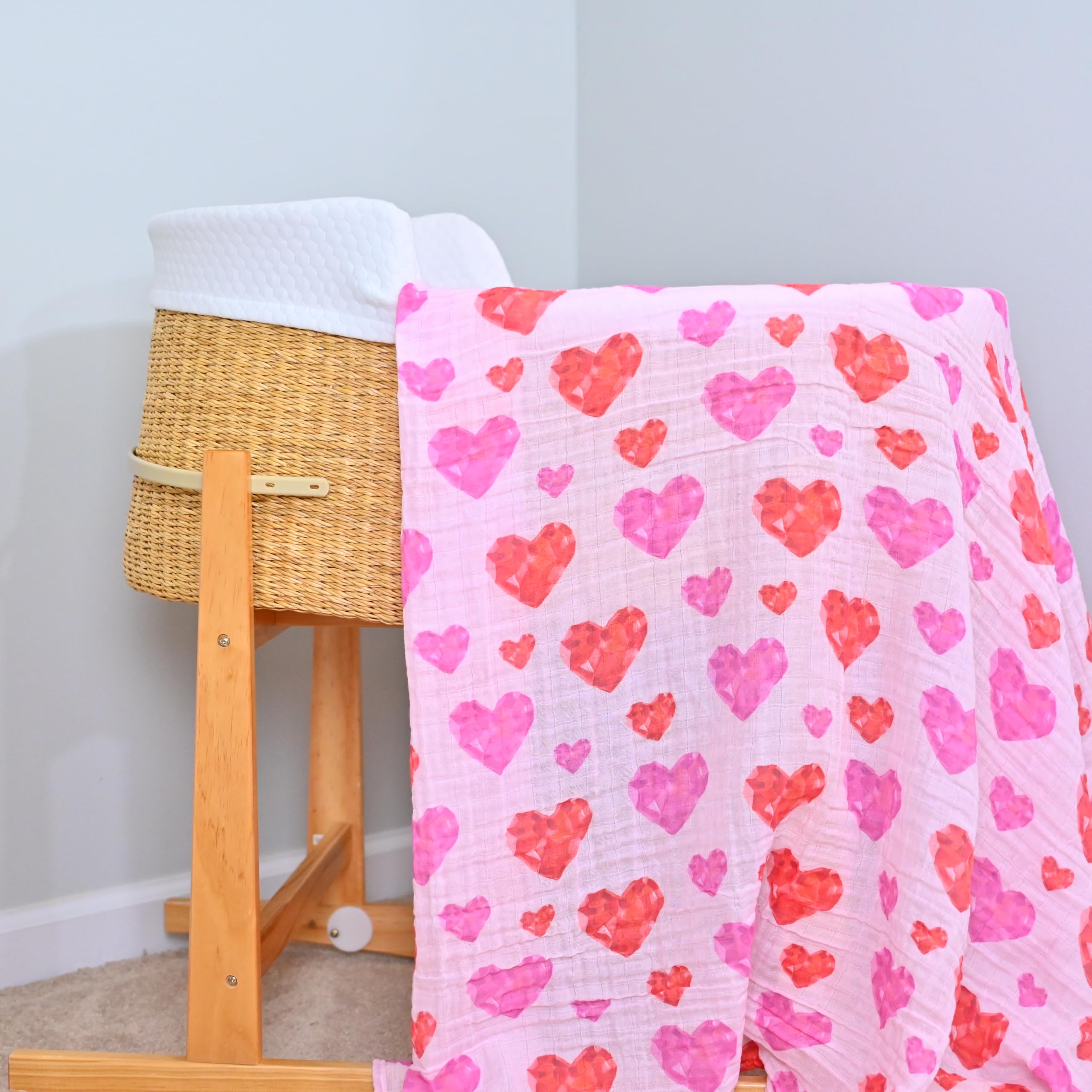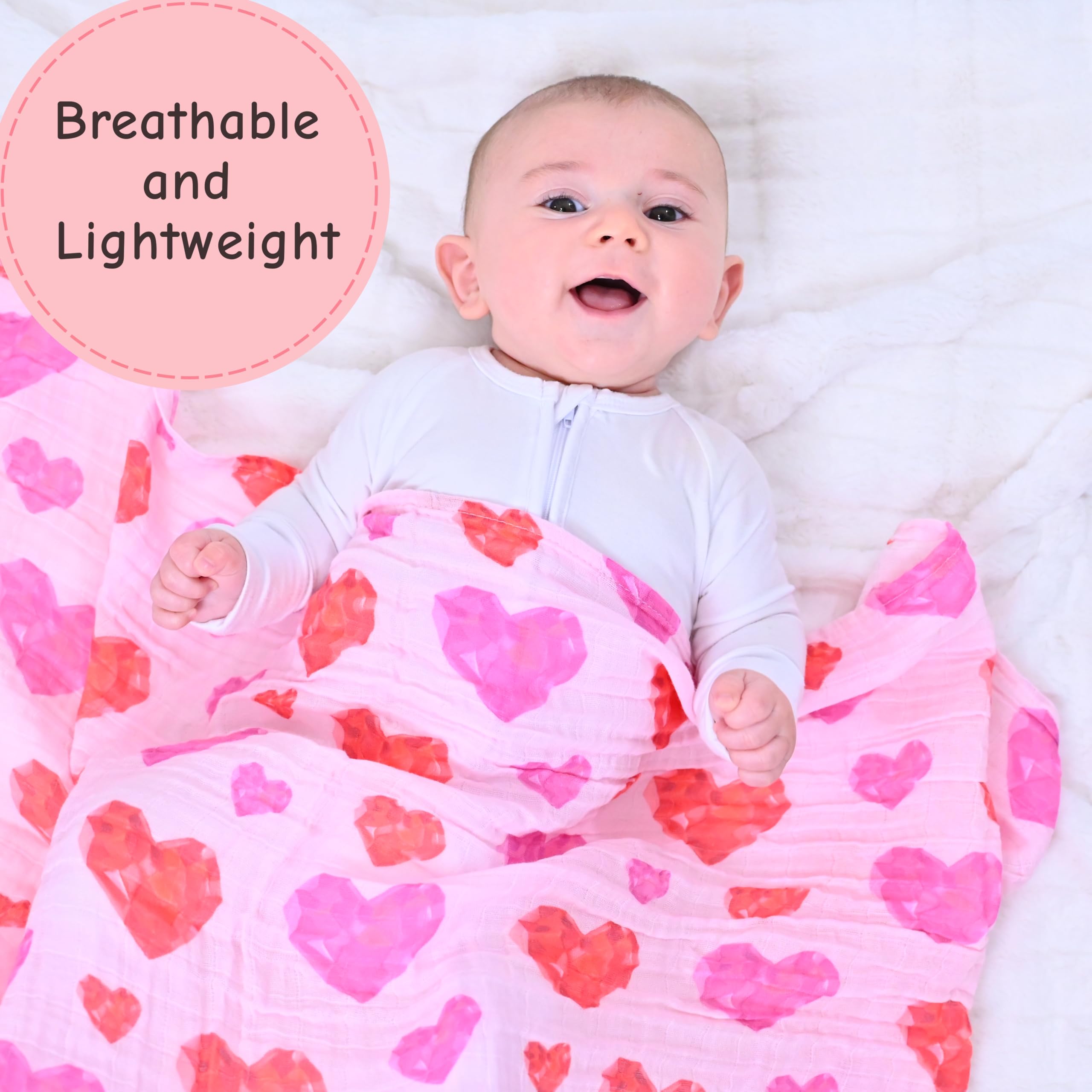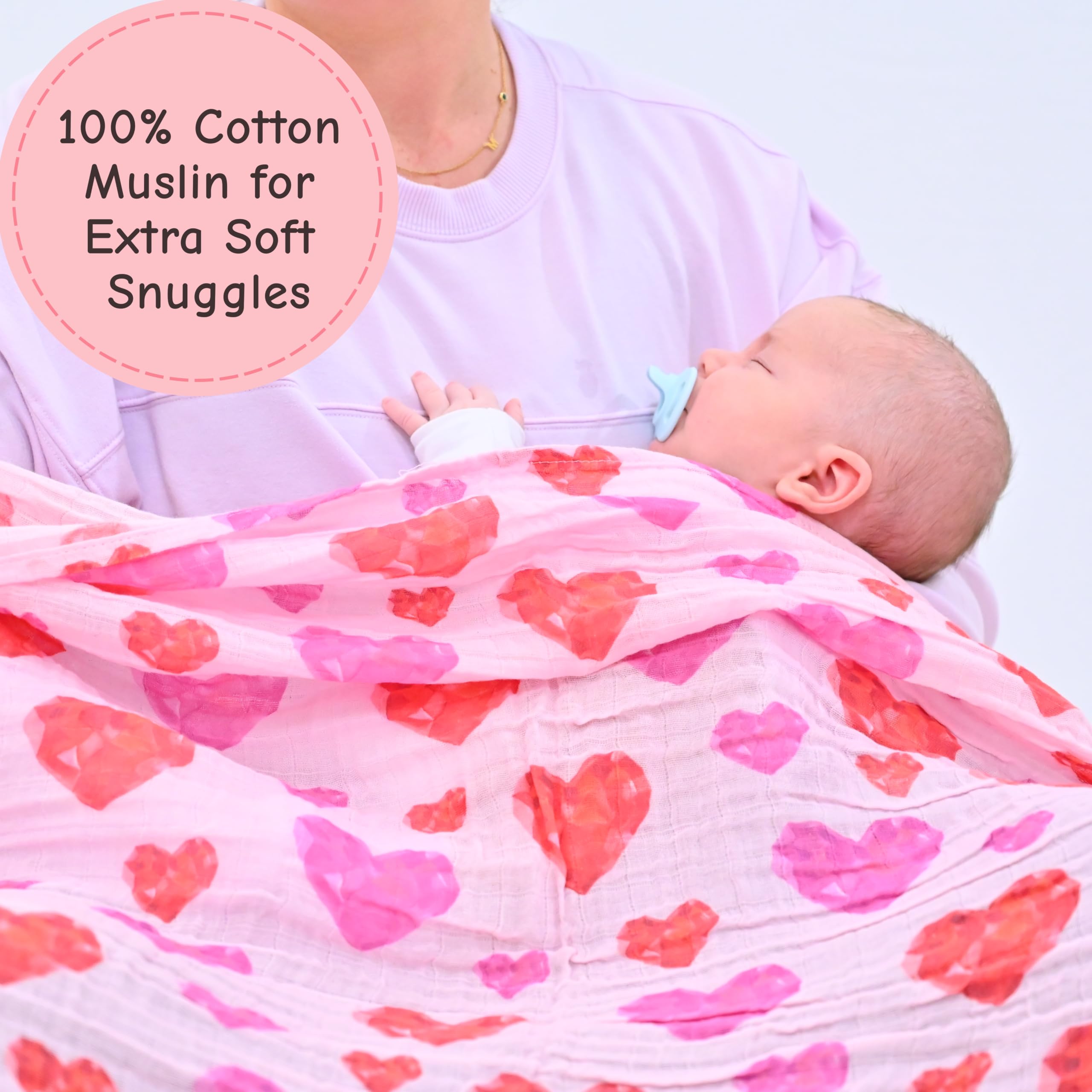 GEMSTONE HEART PRINT - Shimmering heart motifs inspired by sparkling gemstones adorn this soft muslin blanket, offering your little girl a sweet and elegant touch of love while keeping her snug and comfortable