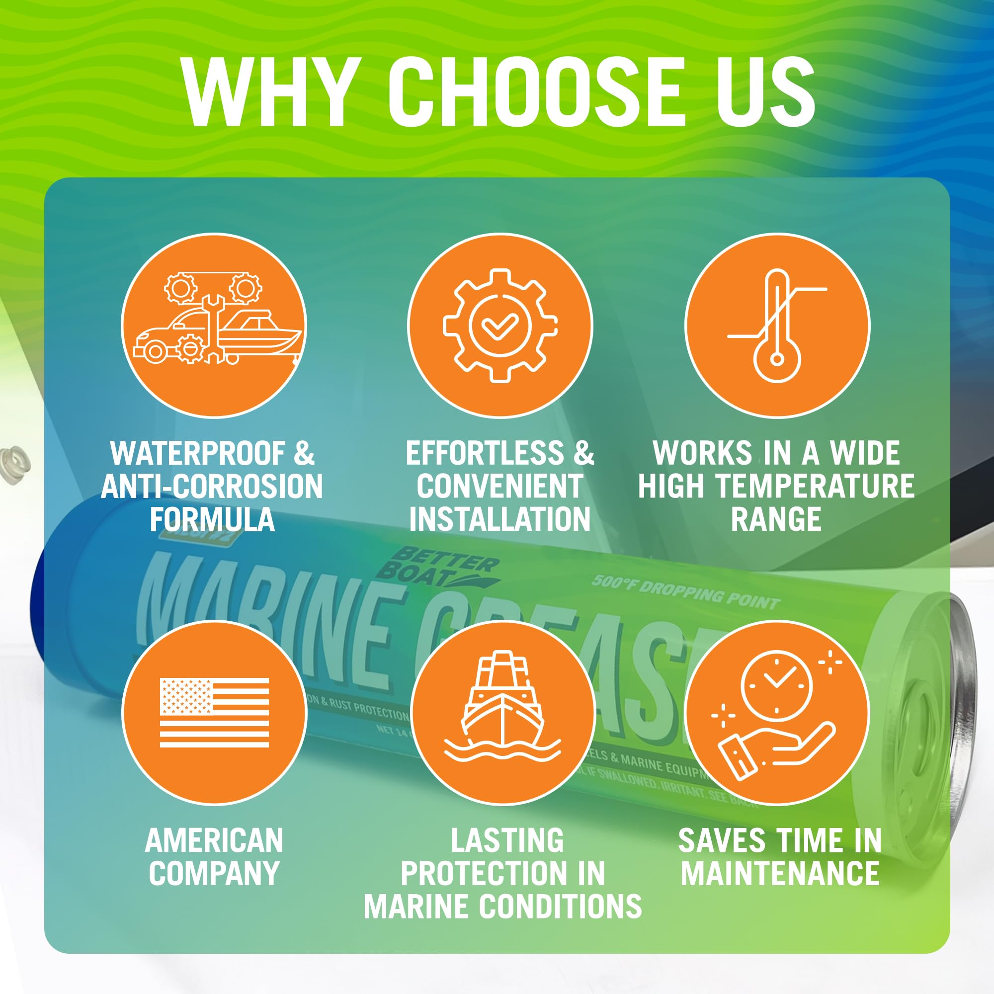 WHY BETTER BOAT: We are a family owned American business committed to making premium boating accessories. We stand behind your satisfaction and our marine grade boat accessories including our NLGI 2 grease cartridges for grease gun solutions.