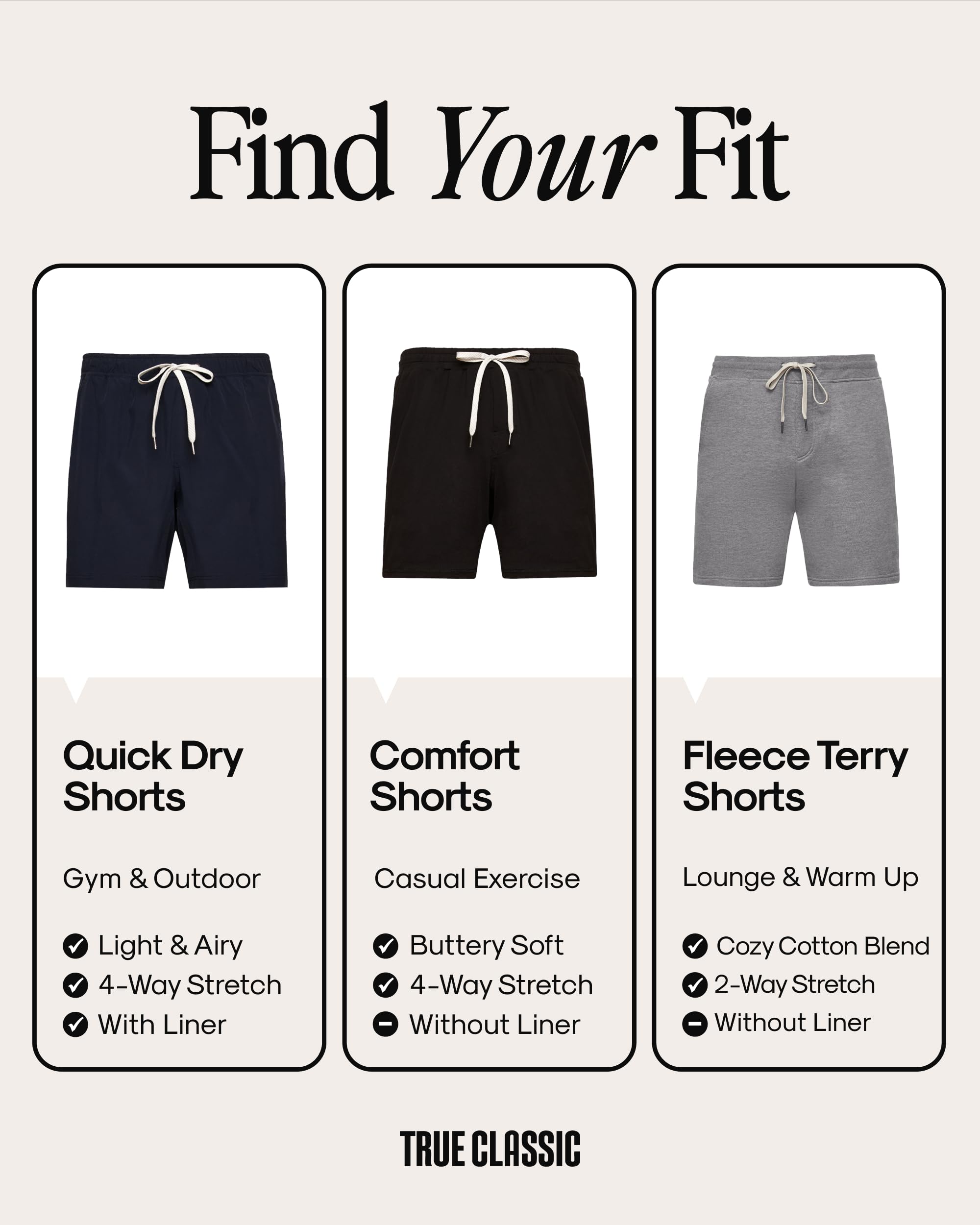 Description The True Classic Men's Shorts Collection delivers performance-ready comfort designed for every part of your day. Whether you're grinding through a workout, running errands, or kicking back at home, these mens shorts are built to fit right and feel even better. Choose from quick-dry athletic shorts with 7” or 9” inseams, made from lightweight polyester-spandex blends that wick moisture, dry fast, and provide UPF 30 sun protection. Select styles feature a built-in liner for extra comfort and coverage during high-movement activity. For laid-back days, the fleece French Terry shorts offer brushed softness inside and out, delivering cozy comfort without sacrificing style. All shorts are equipped with deep, functional pockets—whether side-entry, zippered, or Velcro-secured—to keep your essentials close at hand. Reviewers consistently note the comfortable fit, soft material, and true to size design, making these gym shorts men rely on just as practical for lounging as they are for training. With sizes from S–3XL and a range of colors including black running shorts men love, grey, navy, green, and more, there's a pair of True Classic shorts for every routine. Practical, comfortable, and ready for anything—these are the shorts you'll keep reaching for, workout after workout, weekend after weekend.
