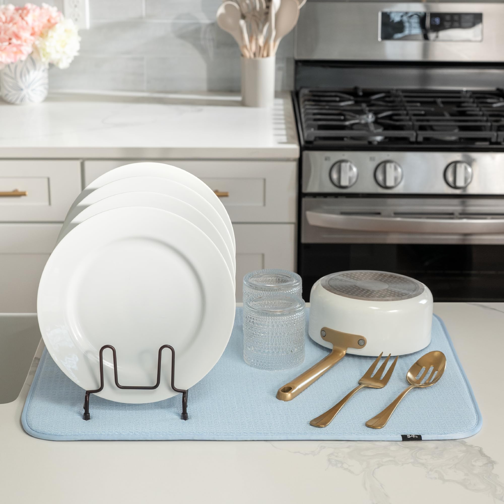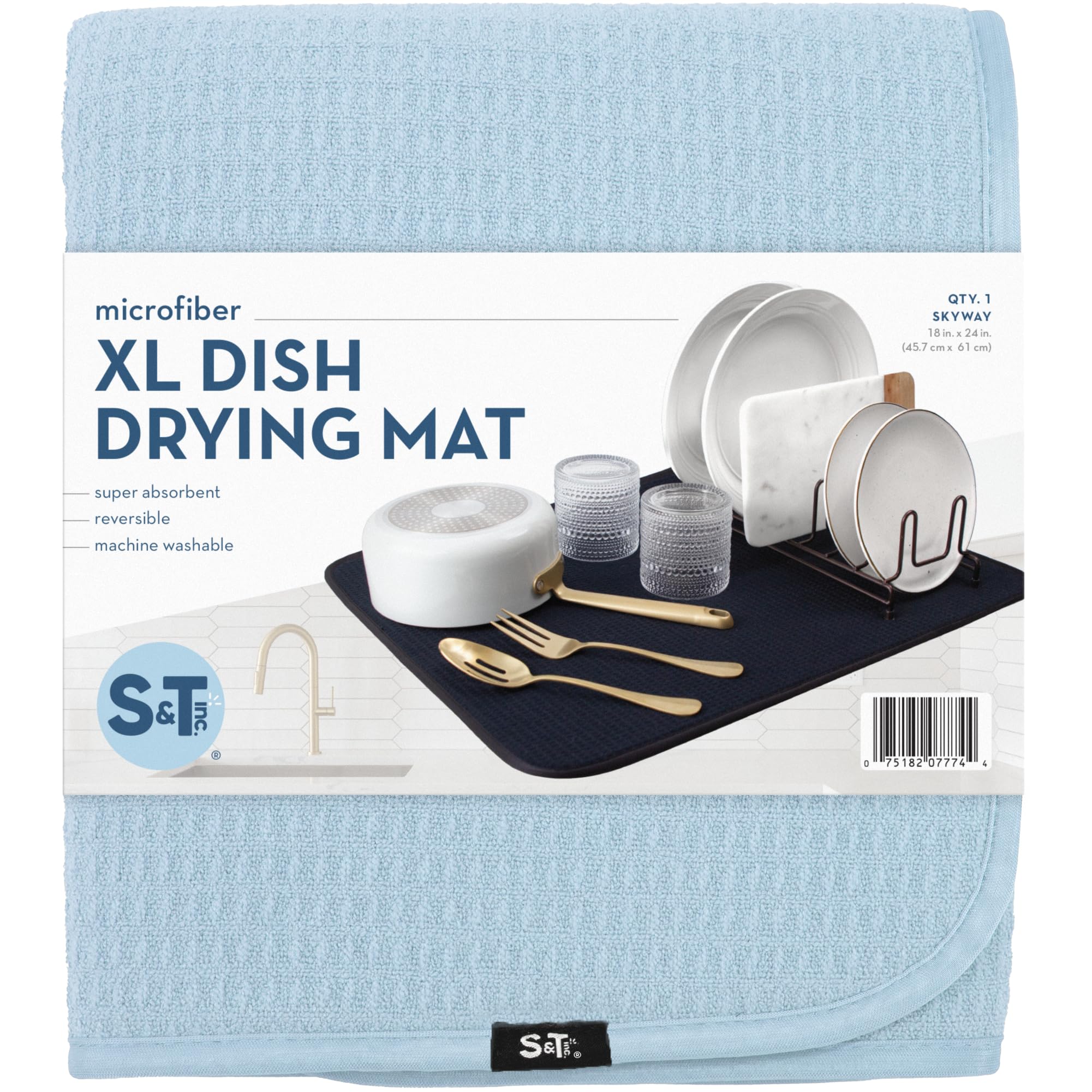 One S&T INC. Microfiber Dish Dry Mat measuring 18 in. x 24 in.; kitchen mat for countertop absorbs up to 4 times its weight in water to keep your countertop dry, unlike a silicone dish drying mat