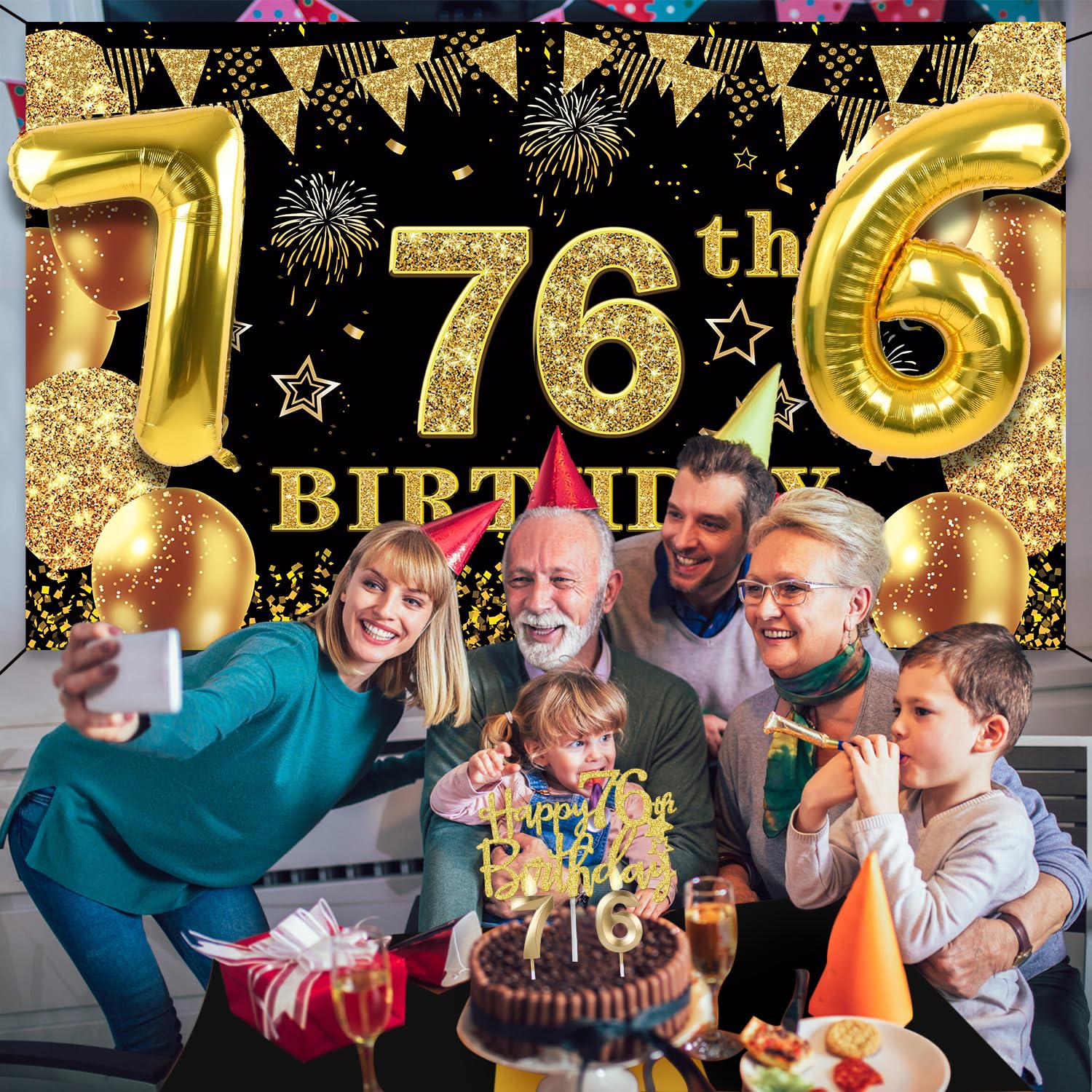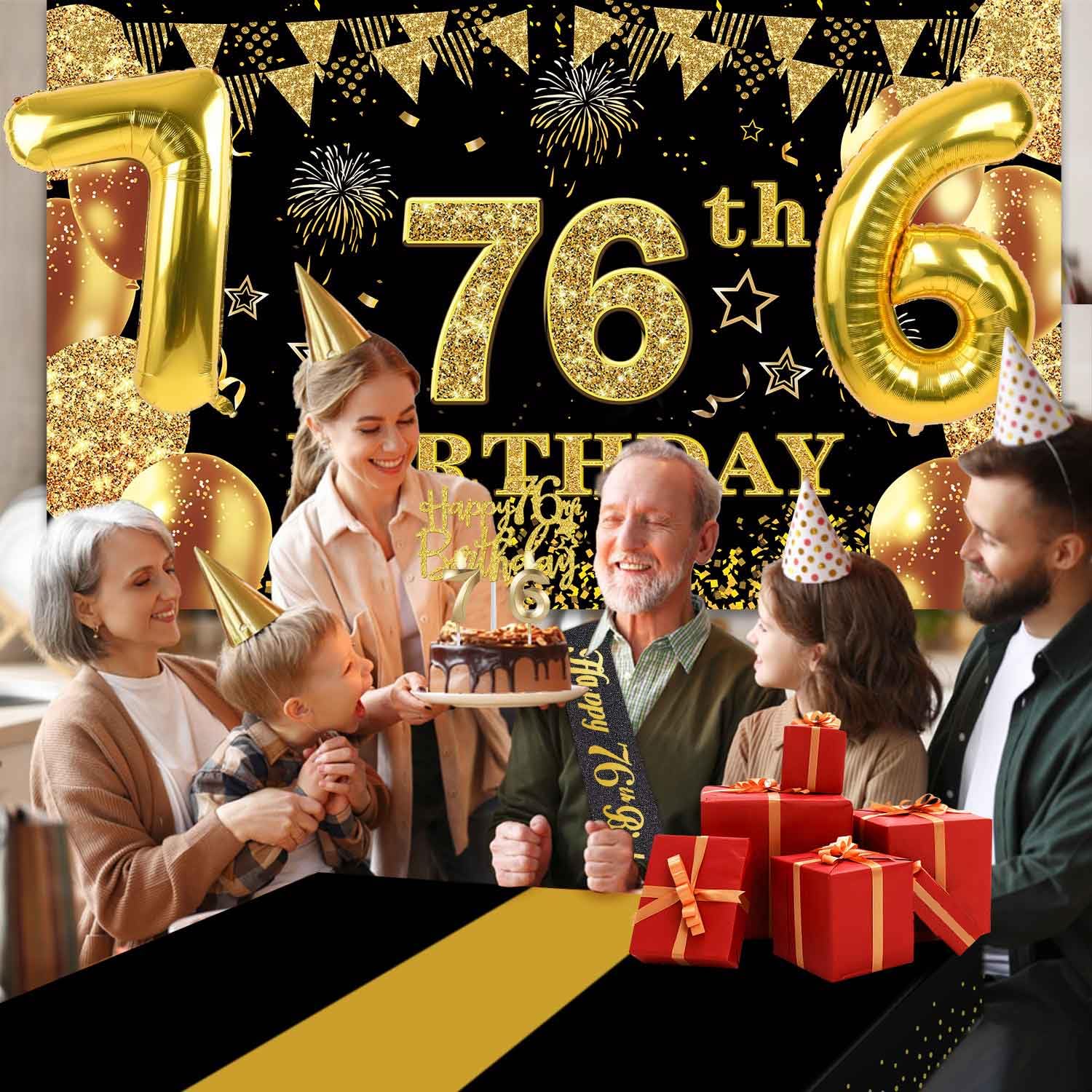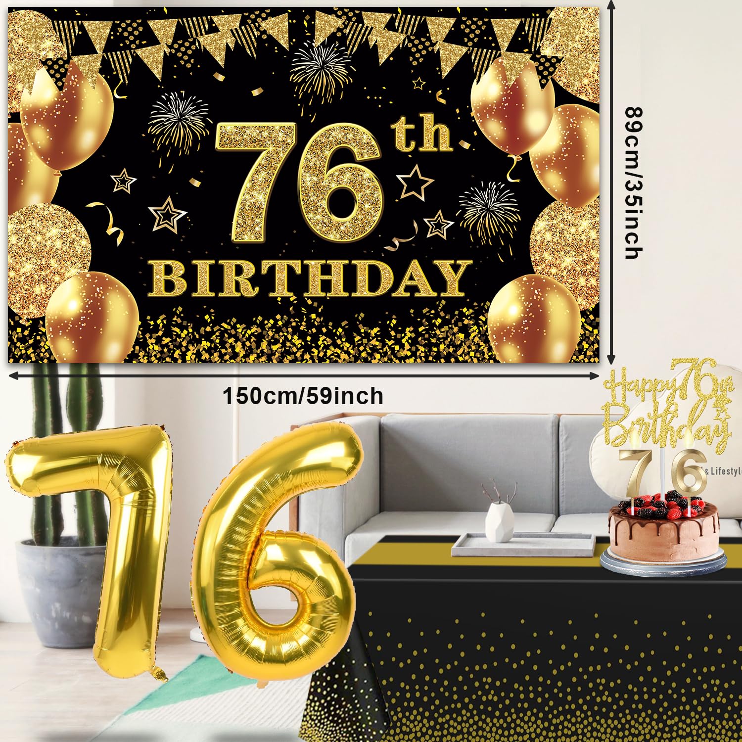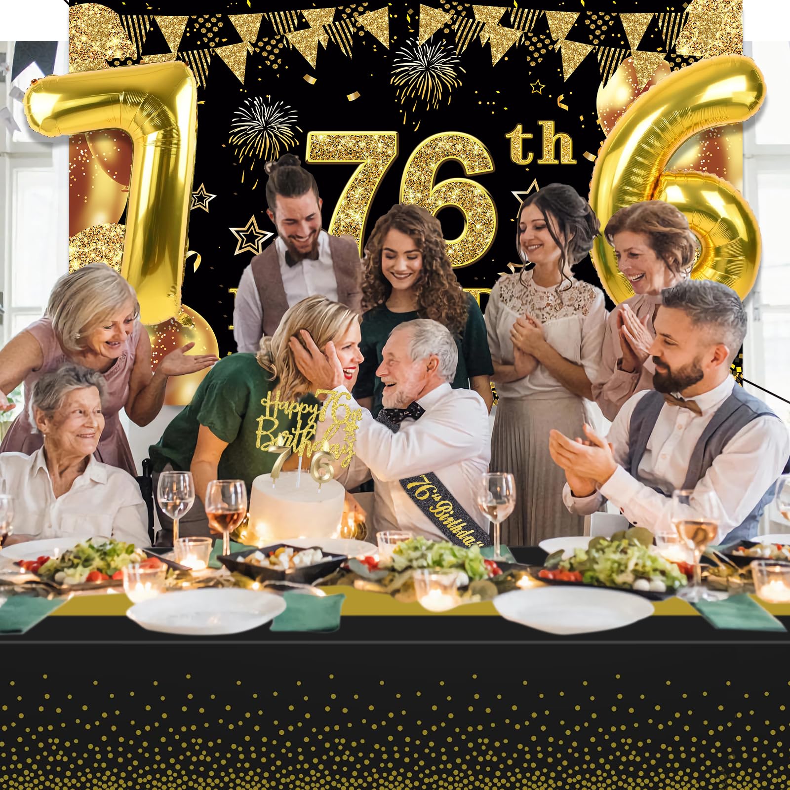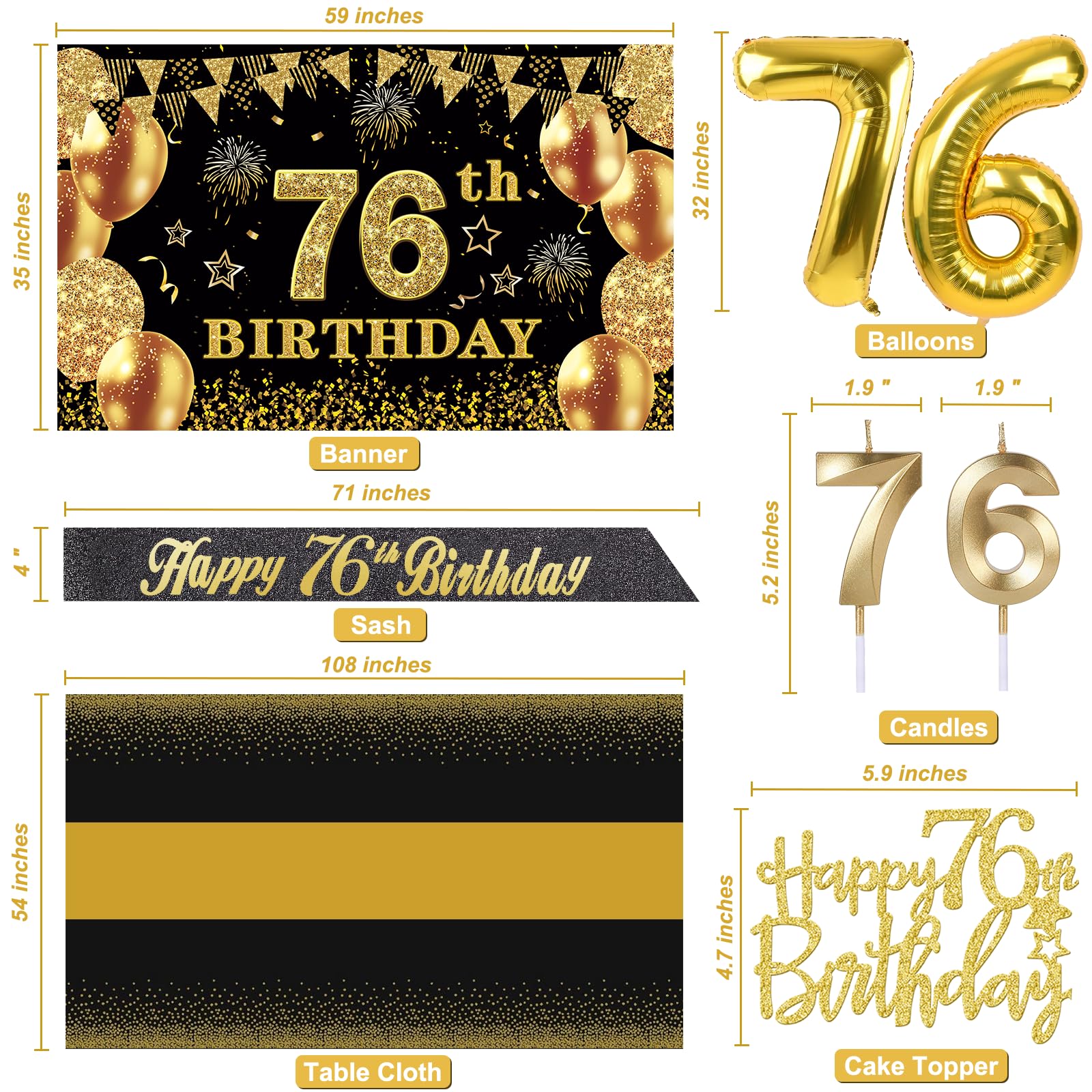76th Birthday Decorations Kit: Packing Coming with Large 76th Birthday Banner x 1pc, Big Gold 76th Birthday Balloons x 1set, Black and Gold Table Cloth x 1pc, Black Glittery with Gold Foil Words Happy 76th Birthday Sash x 1pc, 76th Happy Birthday Cake Topper x 1pc, Gold Number 76 Candles x 1set. This Value Black and Gold Party Decorations Set Meet Your Every Needs and Expects in 76th Birthday Milestone