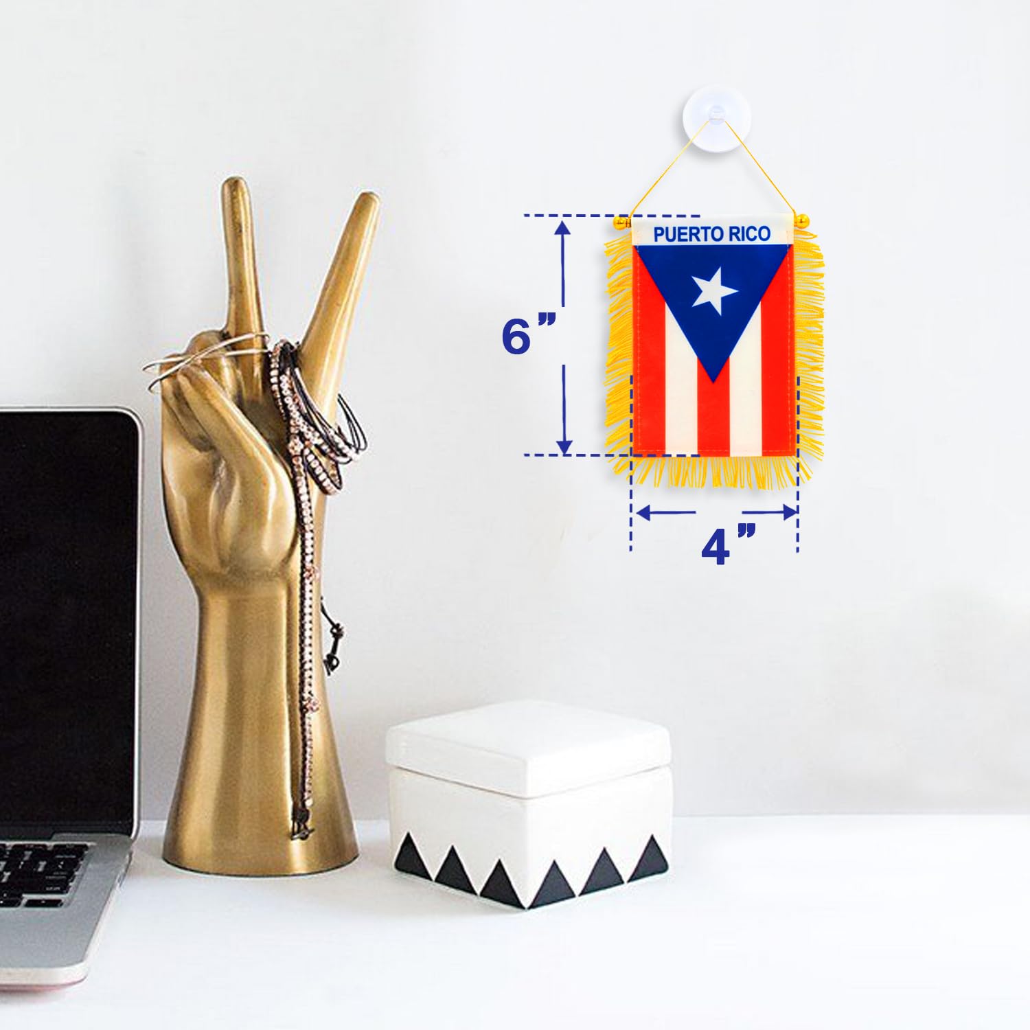 Anley 4 X 6 Inch Small Puerto Rico Flag - Rearview Mirror & Window Hanging - Fringed Puerto Rican Mini Banner PREMIUM QUALITY Individually double stitched all around the edge,not easy to fall apart. FADE RESISTANT The Color is Sharp and Vivid, evenly Colored On Both Sides and Without Color Difference. EASY TO USE Can mount directly over the rear view mirror or with suction hanger. Light & Compact The flag is 4 x 6 inches. Will work in all vehicle models. Special fabrics are more unique in the sun. Commitment We stand behind our products! Please feel free to contact us if you have any questions or concerns.