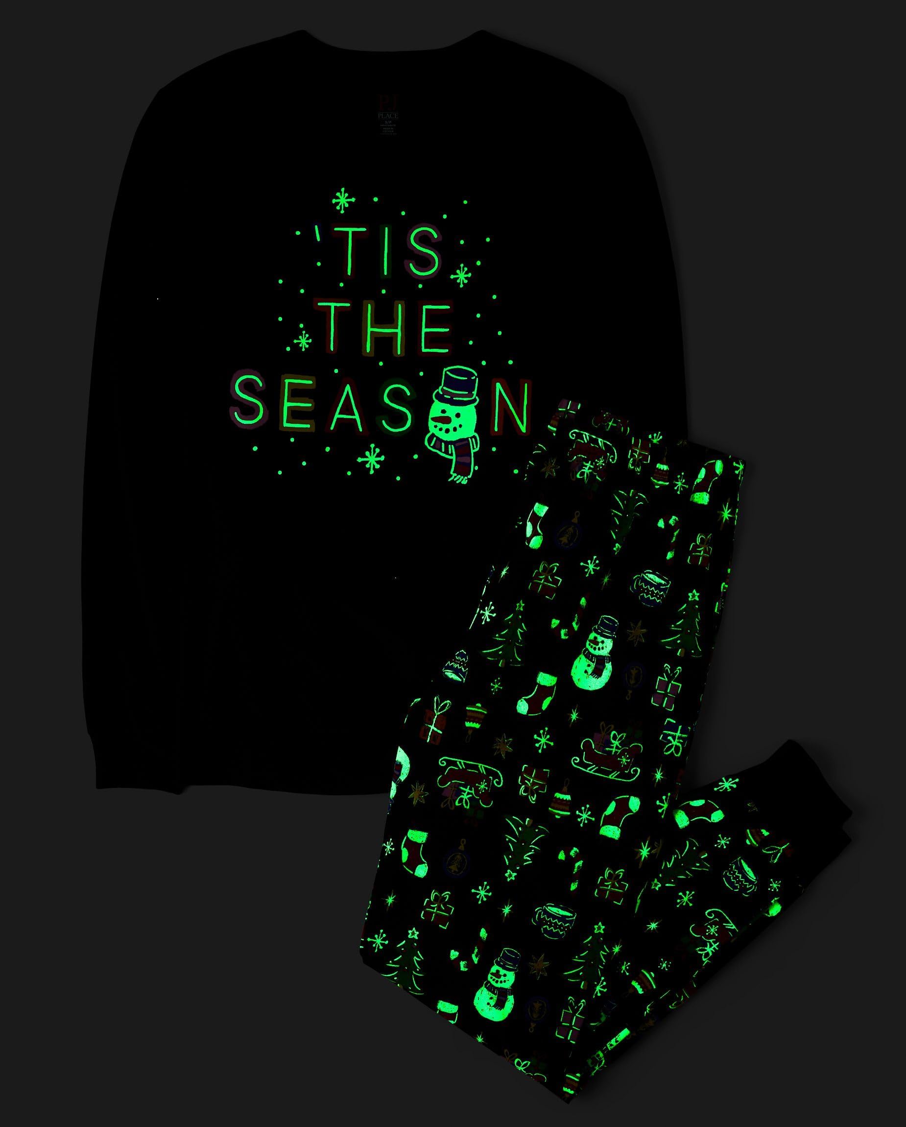 PAJAMA TOP: Rib-knit crew neck, long sleeves with rib-knit cuffs, glow-in-the-dark 'Tis The Season' with snowman graphic design; for best glow effect, expose to light before wearing