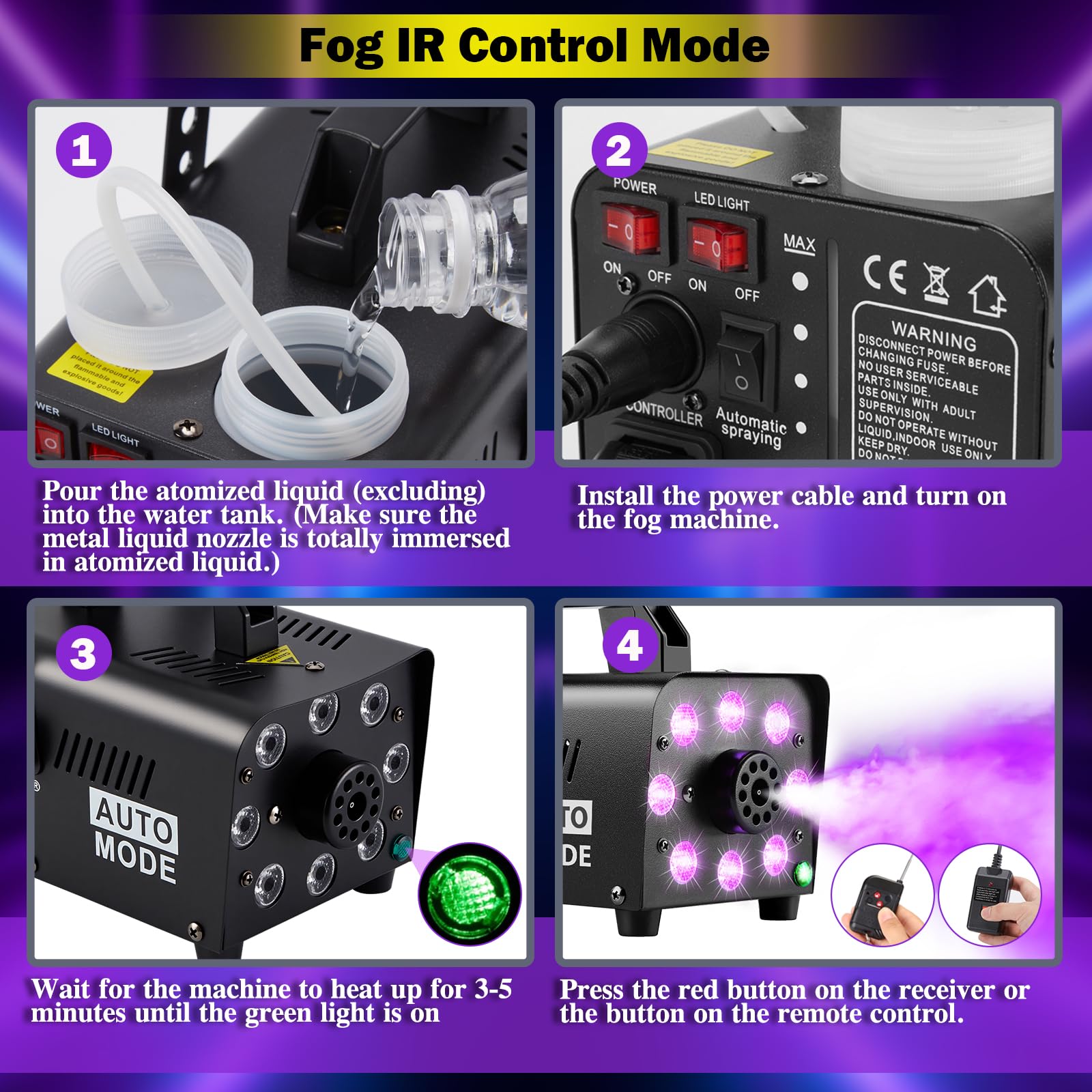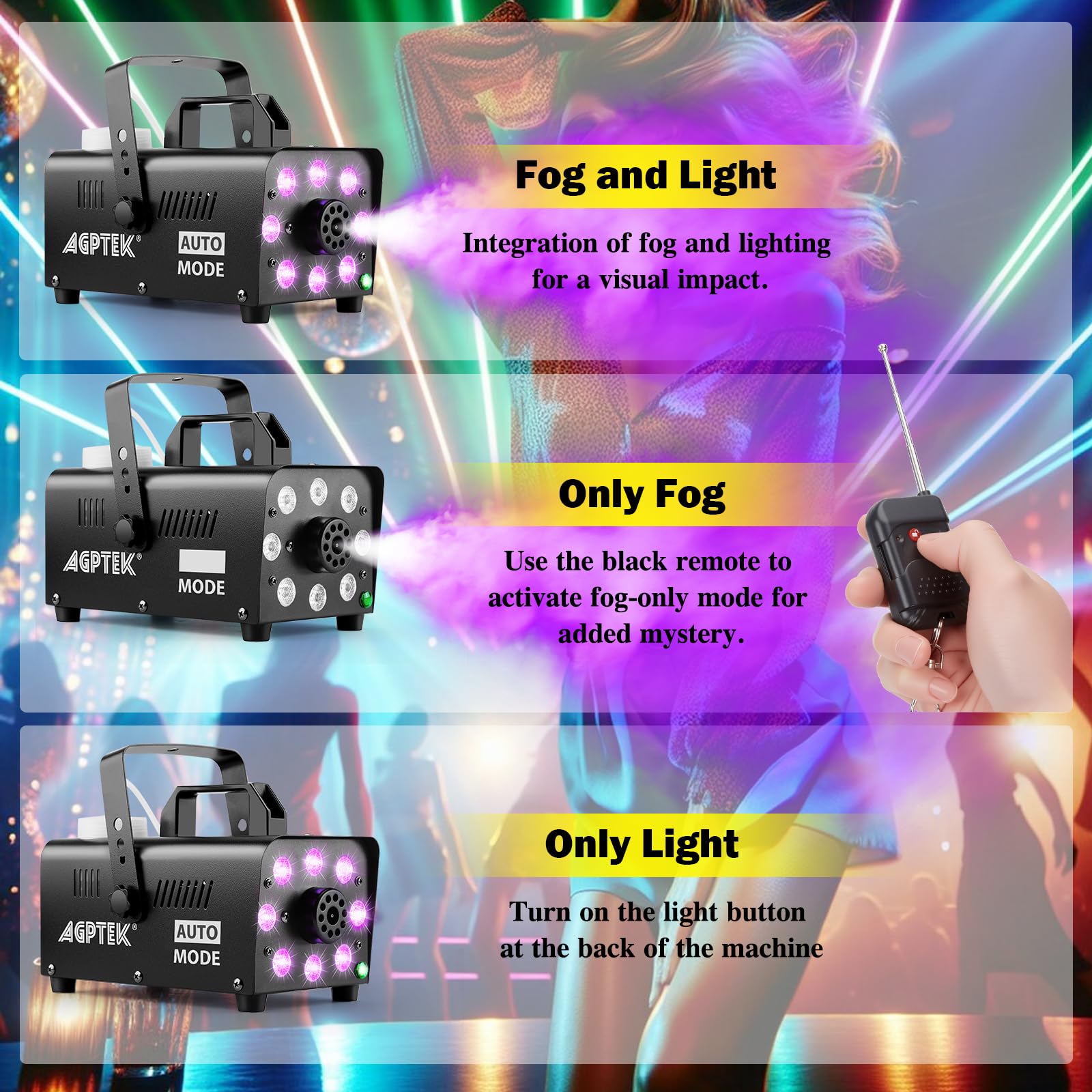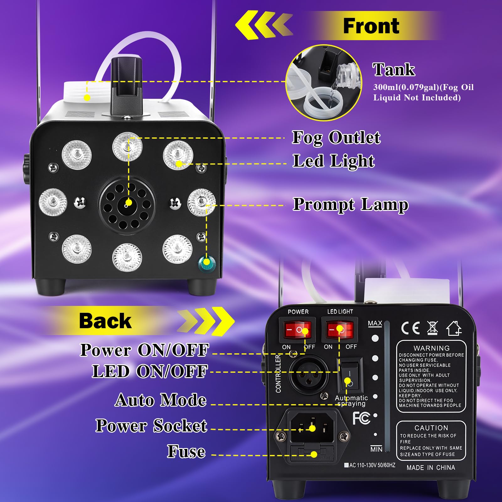 EASY TO USE: The fog machine with lights comes with both two different wireless remotes controls, one is that you could turn on and turn off the fog machine for easy use and the other is equipped with LED light control buttons, which is convenient for you to freely switch colors.