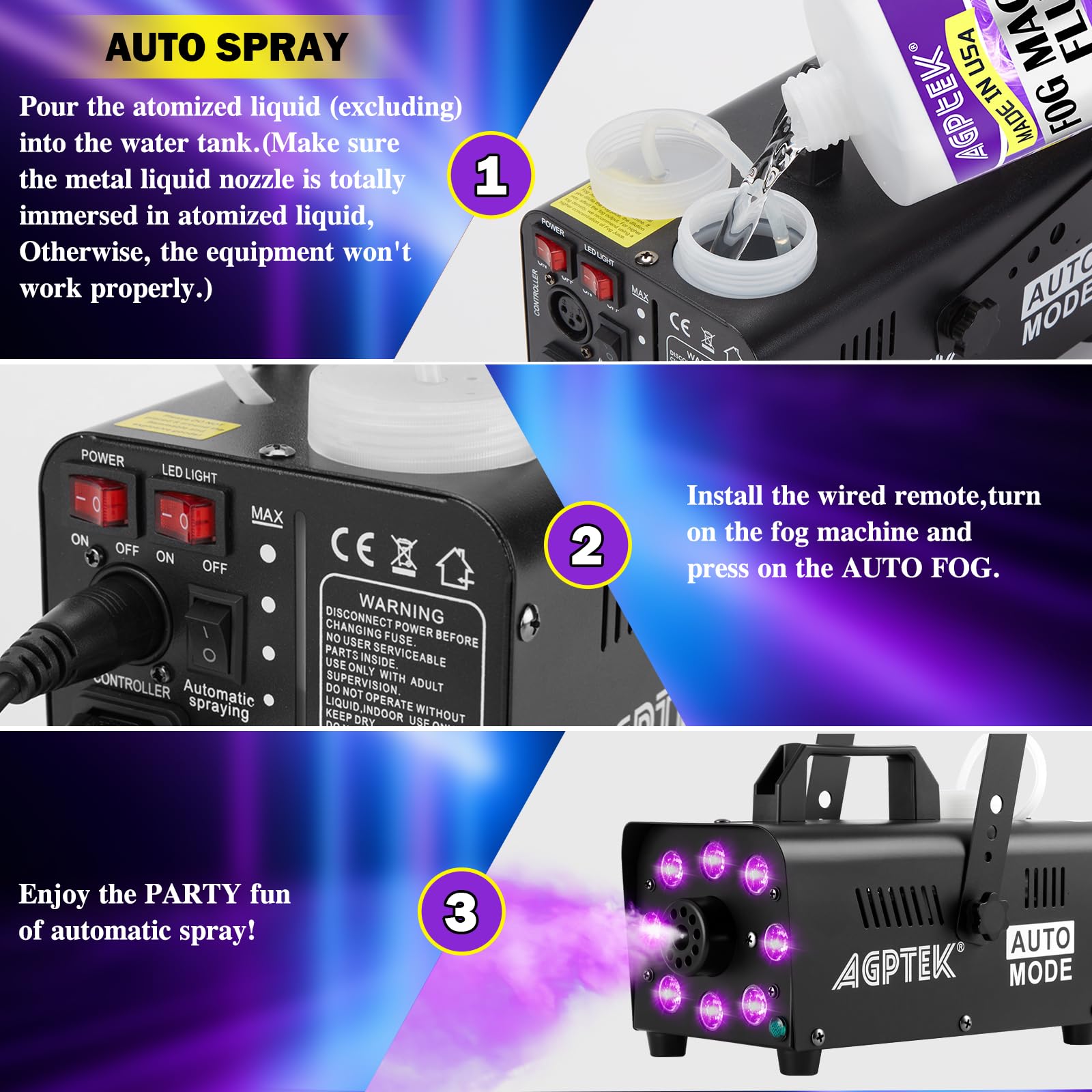 ENERGY SAVING: Due to advanced electronic constant temperature system and specialized pipeline technology, this fog machine with light can save 20% energy, comparing with other tranditional smoke machines on the market. More importantly, the AGPTEK fog machine only takes 3-4 minutes to warm up quickly. Note: please do not connect other devices that are not included in the package to the fog machine ! ! !