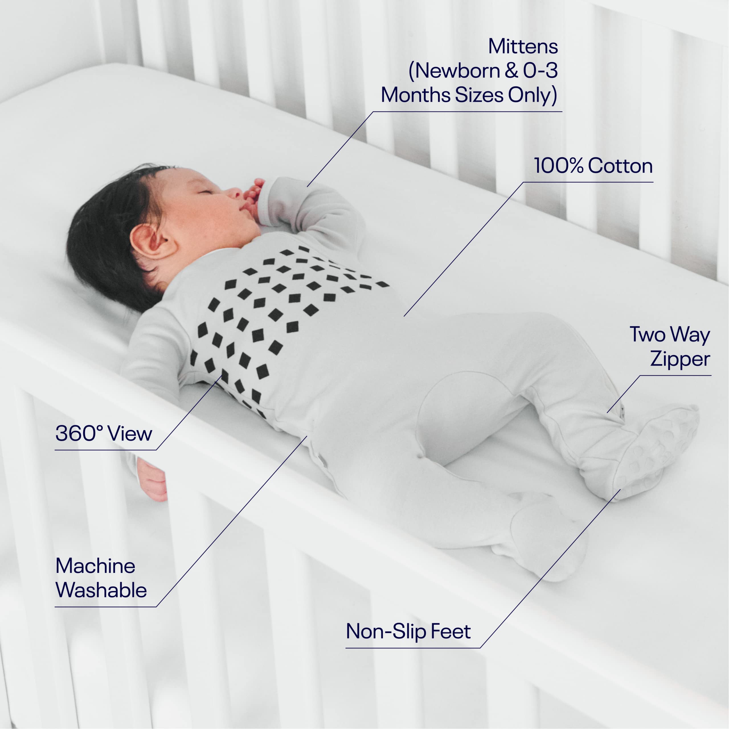 SOFT, SAFE, SIMPLE: Nanit Pajamas are made to be comfortable for babies and comforting for parents. 100% cotton, no electronics, and machine washable. Newborn/0M and 0-3M sized pajamas include fold-over mittens to keep baby's hands warm and protect skin from scratches. 6-9M sized pajamas come with non-slip foot prints for new and unsteady walkers.