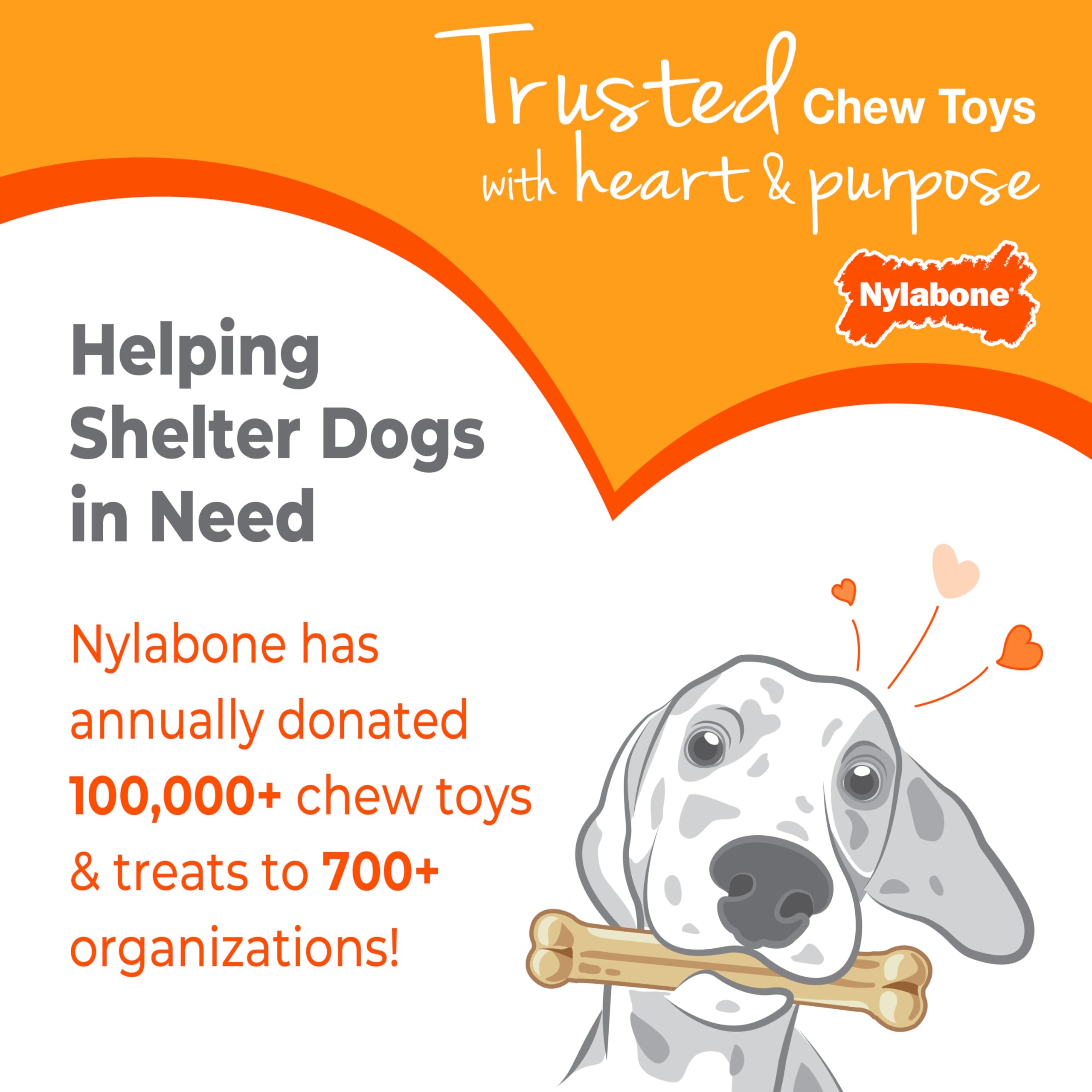 ABOUT PUPPY CHEW TOYS Puppies use their mouths to explore their world and especially to relieve teething pain! That's why Nylabone Puppy Chew toys come in all different shapes, flavors, and textures to keep your new best friend comforted and entertained. With positive reinforcement, your pup will learn that chewing on our puppy toys is not only encouraged, but a fun activity as they grow up! THE TEETHING BONE: A NEW PUPPY ESSENTIAL Teach your pup healthy chewing habits that’ll last a lifetime with the Puppy Chew Teething Bone! Thoughtfully designed for teething puppies, this medium chew toy is made with soft material to soothe their sensitive gums. It has enticing flavor infused throughout and provides your pup a safe, positive way to satisfy their natural instinct to chew. Made with heart and purpose, this veterinarian-recommended puppy teething toy will start your new best friend off on the right paw! NYLABONE CHEWS BEST What your dog chews matters! With destructive behavior among the leading reasons dogs are returned to shelters, we know healthy habits can make a life-changing difference. For 70 years, our family-founded brand continues to safely satisfy dogs’ chewing instincts and help them stay in loving forever homes! GUARANTEED YOUR DOG WILL LOVE IT Before we introduce new dog products to furry friends and pet parents everywhere, we make sure our very own dogs love them first! If you’re not happy with your Nylabone chew toy for any reason, simply return it to us with the sales receipt for your money back. Or, reach out to our Consumer Care team so we can help make it right (and talk about how much we also love our dogs).