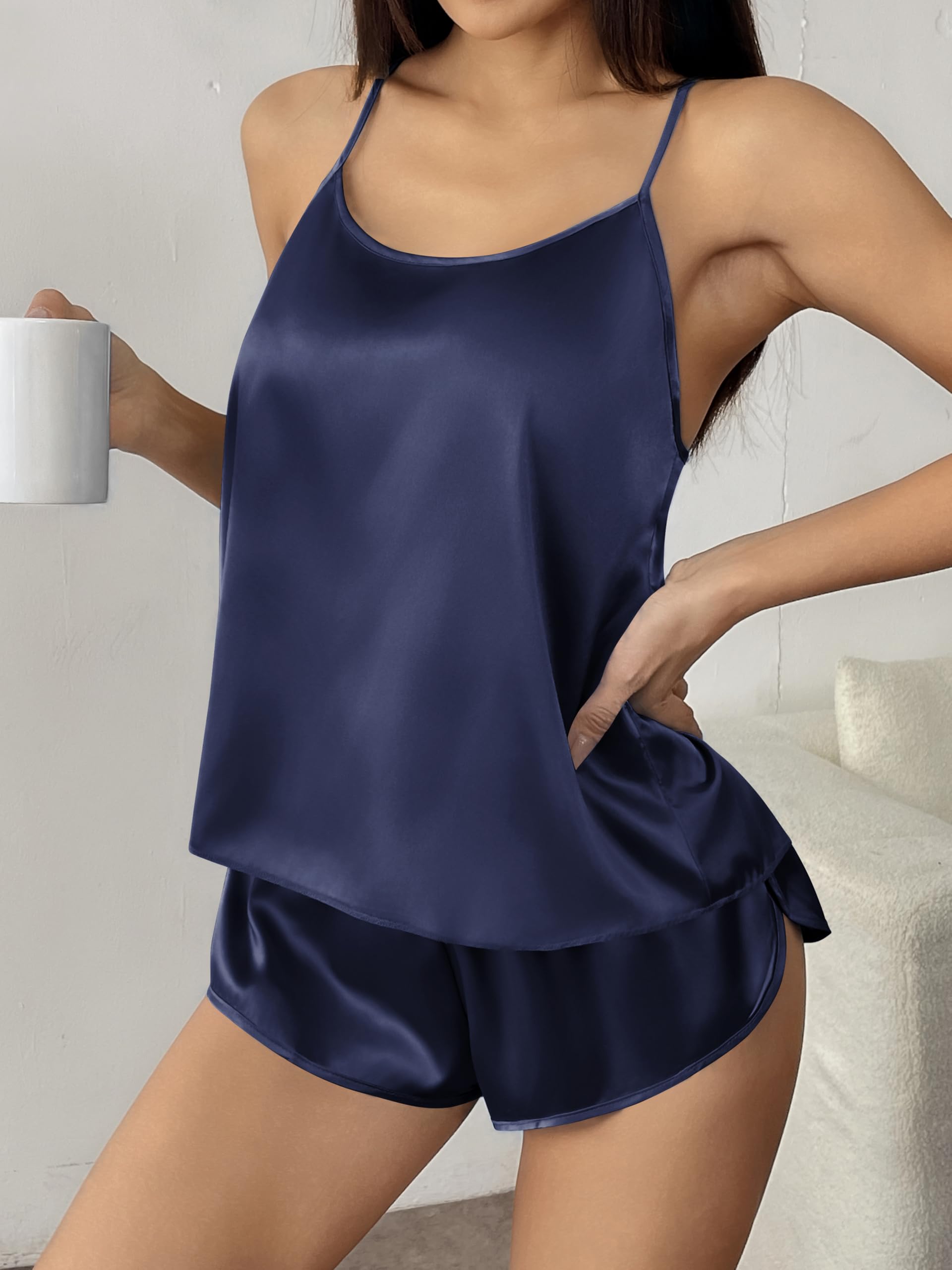 2-PIECE CAMI & SHORTS: Cute, flirty sexy satin pajamas for women—playful gothic/cute prints & solid hues; adjustable cross-back cami & side-slit shorts. Ideal for gothic gatherings/sleepovers/Halloween/bachelorette parties