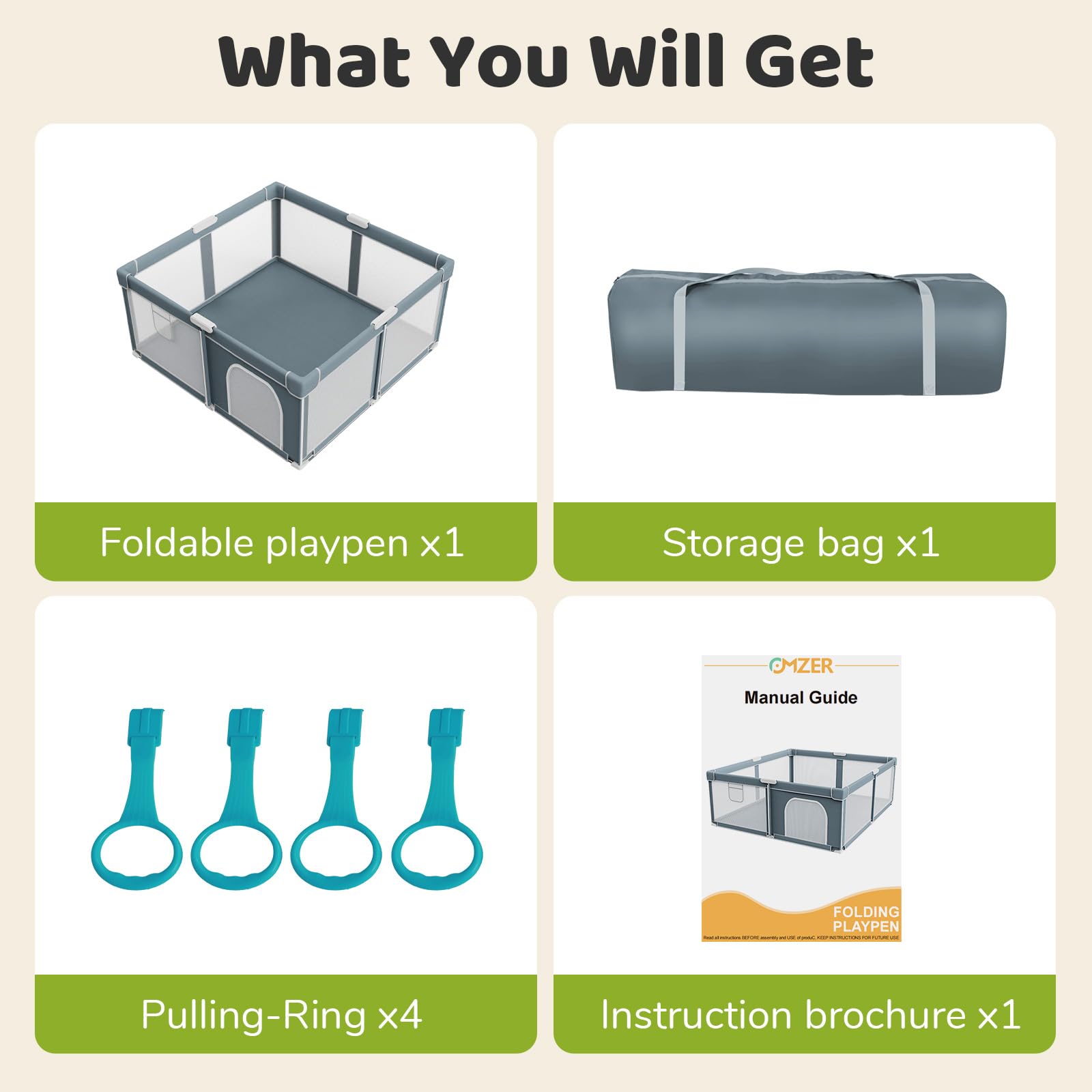 【Foldable Baby Playpen】 OMZER Foldable Baby Playpen engineered with collapsible baby playpen technology, the baby playpen comes with 4 pull tabs and storage bag. It can be set up and taken down in just 60 seconds, and perfect muted grey color for any decor, great for space and decor conscious parents. Assembly time is reduced by 70% compared to traditional baby playpen.